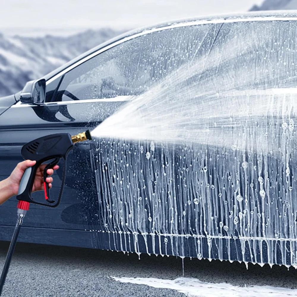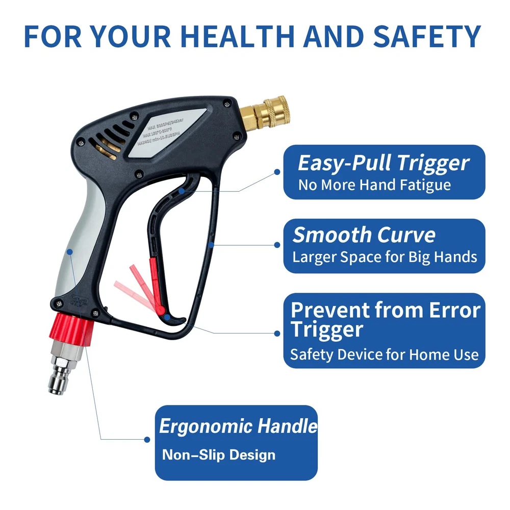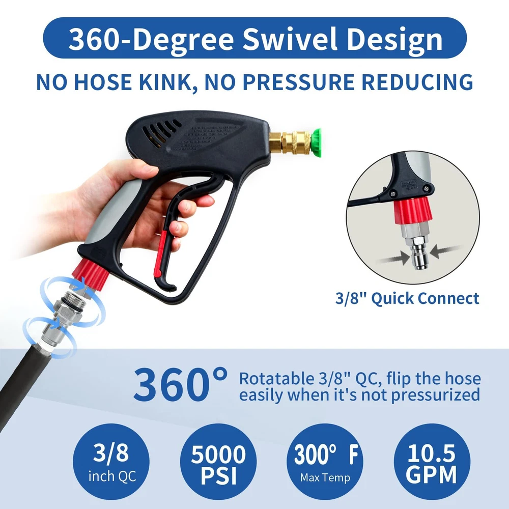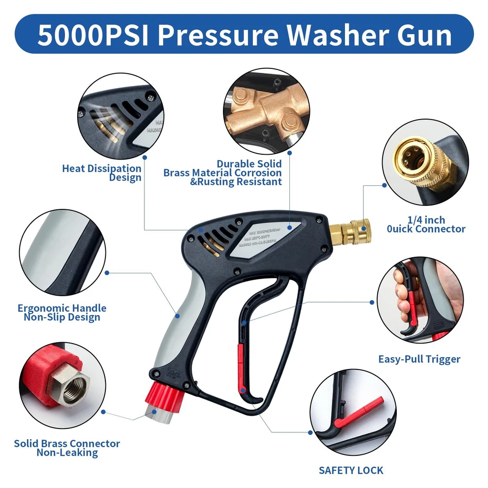 SPECIFICATION: Universal 1/4" female quick connector outlet to with pressure foam cannon, nozzle tips and extension wands .Maximum 5000 PSI and 10.5 GPM. Max temperature for water is up to 150℃ ( 300°F ). HIGH QUALITY MATERIAL:The internal trigger of the power washer is a combination of solid brass and metal poles connector and spool. the exterior is made of high quality plastic, durable in use and rust-proof. ERGONOMIC DESIGN:Hold the pressure washer for long durations without getting tired. The snub nose design makes it easy to maneuver with just hand. Flexible red safe lock key, avoid pulling trigger unexpected, provide safe clean work. 360 DEGREE SWIVEL :Equipped with a 3/8" swivel quick connector,Unique 360° swivel inlet design, able to rotate flexibly, clean your goals from top to bottom without hose tangle, make your pressure washing easier and efficient. SPRAY NOZZLES: 5pcs Pressure washer nozzles with 5 different angle: 0°,15°,25°,40°,65°. They meet your different needs, such as Cleaning Windows, wooden doors, cars, roofs, etc. PACKAGE INCLUDE:Pressure Washer Short ,3/8'' Quick Connector, M22-14mm Fitting ,M22-15mm Fitting,5 Pressure Washer Nozzle Tips. Pressure Washer Not Fit Garden Hose Water Hose or Your Faucet Directly!!! ATTENTION: If hose has M22 14mm fitting with 14mm insidediameter, please connect the M22-14mm adapter to and hose. If hose has M22 15mm fitting with 15mm inside diameter, please connect the M22-15mm adapter to and hose.