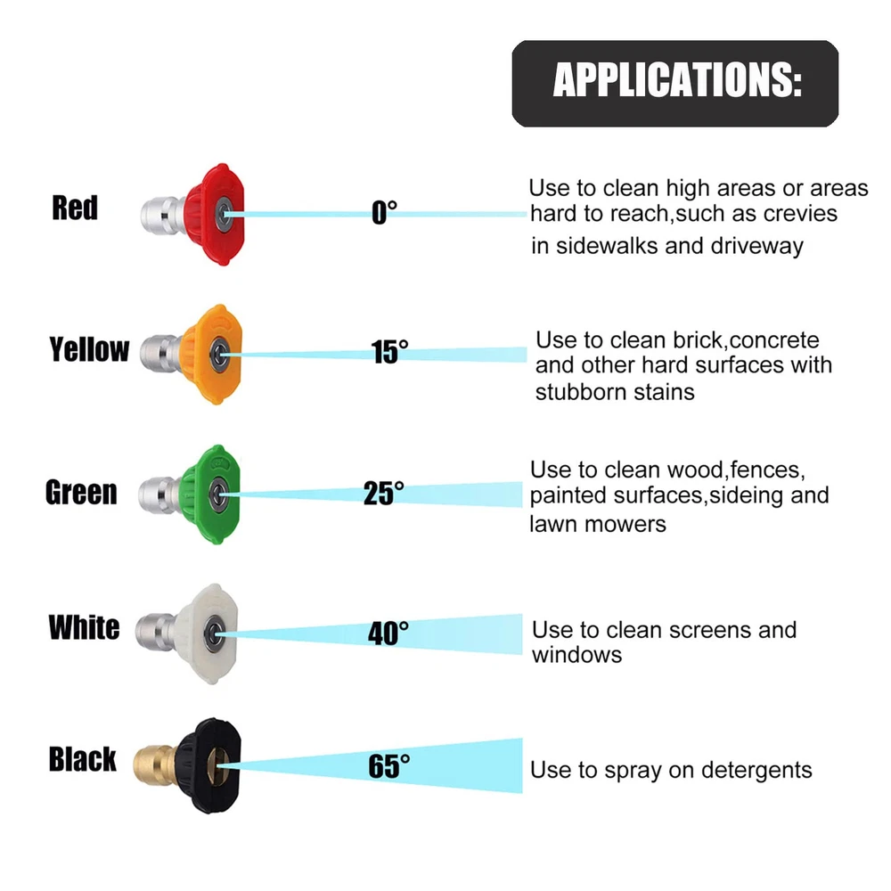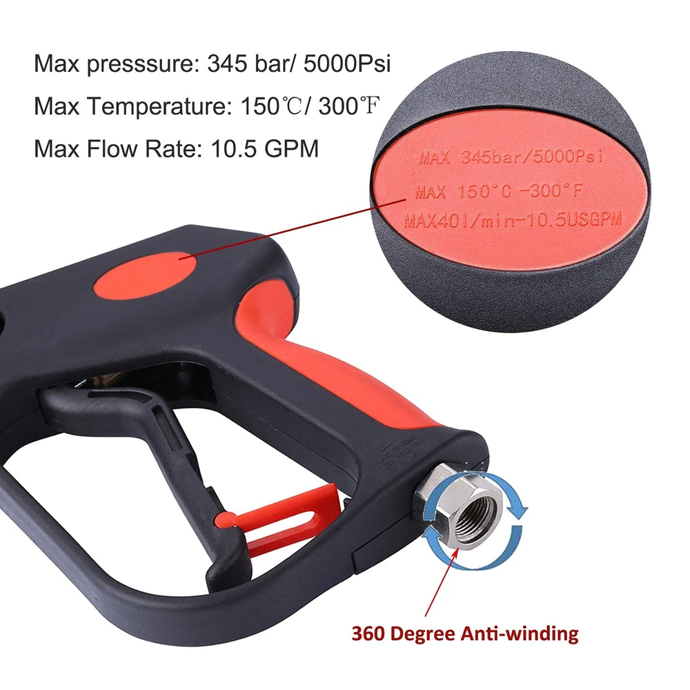 ✔5000 PSI Working Pressure. The highest pressure washer , ideal for homeowners and professionals, perfect design for car cleaning, windows washing, driveways, roofs, siding washing... ✔Ergonomic and Soft Pull desgin, reducing your hand fatigue operation. The features a locking safety handle to prevent accidental sprays. ✔5 pressure washer spray tips Included,Use for a wide range of spray patterns and applications ✔Universal for Most high pressure washers, with 3 adapters, easy connect to pressure washer hose with 3/8 NPT thread inlet fitting, Quick Connect 3/8” Pressure Washer Hose, M22-14mm Washer hose or M22-15mm Power Washer Hose. ★For pressure washer use only Not fit Garden Hose or Water hose. An extra teflon tape is included. ♦Please apply Teflon tape on all thread connections before use to avoid any leakage. ✔1/4" outlet quick disconnect fitting, connect all accessories to the with a 1/4 inch plug. Such as nozzle tip, pivot coupler, foam , extension wand, etc.