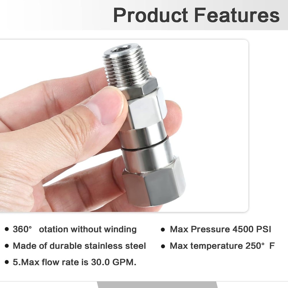 Pressure Washer Swivel 3/8 Inch NPT Male Thread Fitting Stainless Steel 360 D... 【Premium Material】:Pressure washer rotary joints are made of 304 stainless steel, with solid structure, high hardness, corrosion resistance and long service life. >【Excellent Design】: 360 degree rotating design easily solves twisting and kinking of the hose while working, reducing stress on the gun, hose and operator, making your cleaning job easier. >【Fitting Size】: 3/8'' NPT female thread to 3/8''NPT male thread, suitable for standard 3/8''NPT fitting, can connect hose to hose or gun to hose. >【Features】: The maximum temperature can reach 120℃/250 F, the maximum working pressure is 4500 PSI, and the maximum flow rate is 30.0 GPM. >【SERVICE】: Please make sure you buy the correct model before purchase to avoid wasting your money and time. If there is a problem with the kit, please contact us as soon as possible, we will reply to you in time. Shipping We offer FREE shipping on all orders! We ship within Three business days of payment, usually sooner. Local pickups and combined shipping options are not provided at this time. Return You can return a product for up to 30 days from the date you purchased it. Any product you return must be in the same condition you received it and in the original packaging. Please keep the receipt. Payment We accept payment by any of the following methods: PayPal Please pay as soon as possible after winning an auction, as that will allow us to post your item to you sooner! Feedback Customer satisfaction is very important to us. If you have any problem with your order, please contact us and we will do our best to make you satisfied. Contact Us If you have any queries, please contact us via ebay. We usually respond within 24 hours on weekdays. Please visit our eBay store to check out other items for sale! Thank you for shopping at our store.