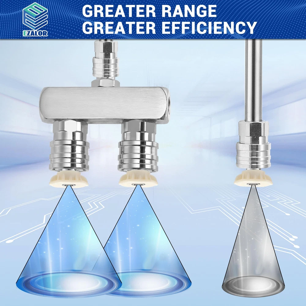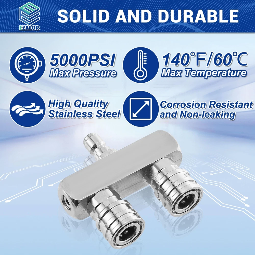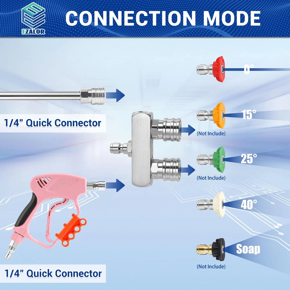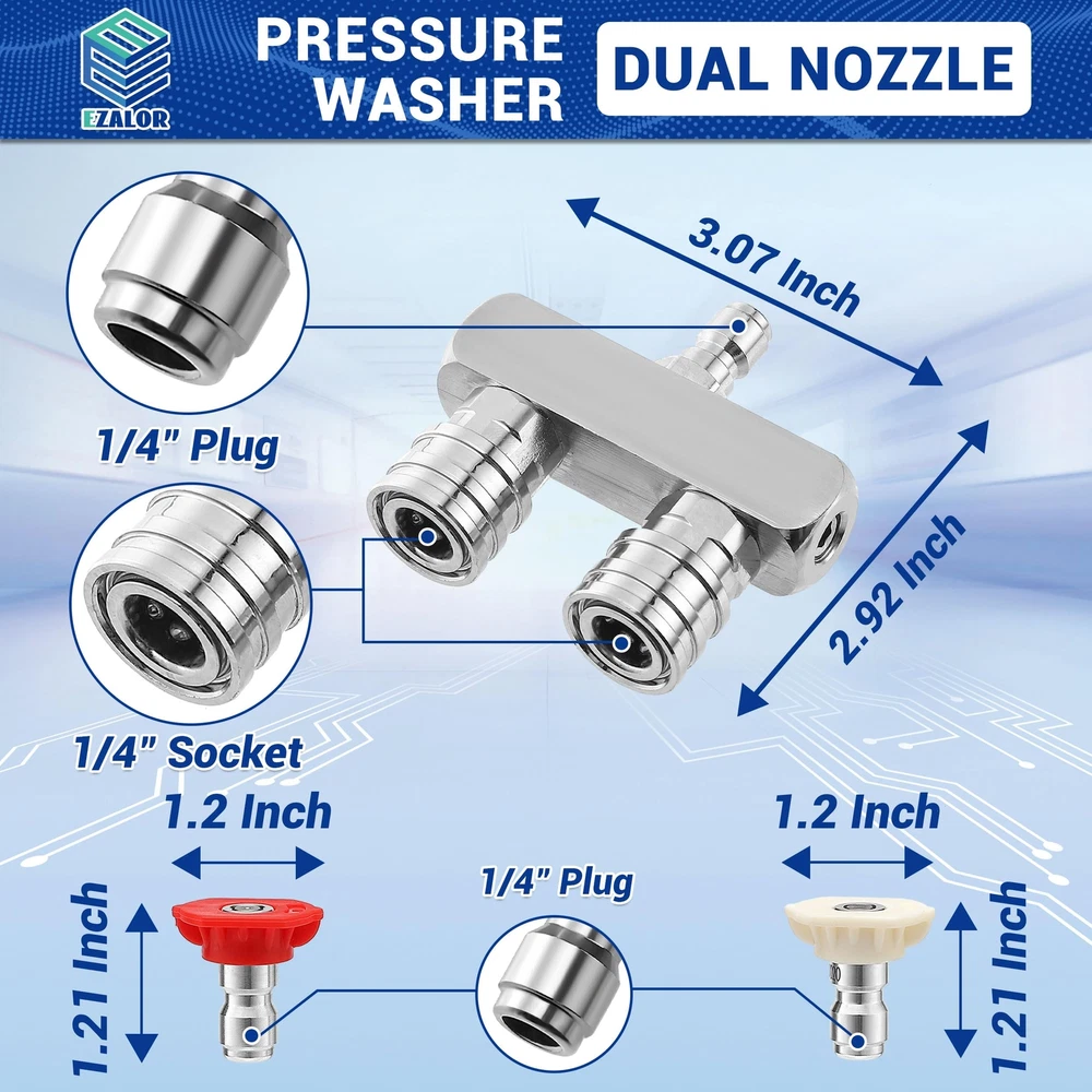 【Efficient Dual Nozzle】Newly introduced dual high-pressure washer nozzle, you can install 2 spray nozzles at time, install this pressure washer nozzle, the single-head nozzle can be turned into a dual-head nozzle, the spray range is greatly increased, and at the same time, the amount of water sprayed is also greatly increased, which effectively expands the scope of your cleaning, and improves the efficiency of the cleaning, so that your cleaning is more easily and efficiently. 【Easy Connection】Power wash nozzle is 1/4" quick connect, connection and disconnection are easy. The pressure washer tip has a 1/4 Inch plug on the end and can be attached to most pressure washer and wands. The heads of pressure washer nozzle tip are 1/4 Inch sockets, which not only connect with the included red and white pressure washer nozzles but also connect with any power washer spray nozzle tips with a 1/4 Inch plug on the end, providing more options for your cleaning work and bringing you convenience. 【Excellent Features】The pressure washer tip is made of high quality stainless steel, sturdy, corrosion-resistant, and leak-proof. The maximum working pressure is 5000PSI and the maximum working temperature is 140 ℉/60 ℃. Pressure washer tips set is an ideal and reliable choice for your cleaning job. 【Wide Applications】Power washer nozzle is an efficient cleaning tool, widely used in a variety of cleaning occasions. Pressure washer tip can be connected with spray nozzles at different angles to produce water columns of different shapes for various kinds of cleaning. For example, power wash nozzle connected with red nozzles and can be used to clean or flush high or hard-to-reach areas; Connected with white nozzles can be used to clean Windows and screen; and so on. 【Product Quality】is a professional supplier of pressure washer products. We offer a diverse selection of reliable pressure washers designed to meet various needs. Our products are crafted with attention to performance and durability, ensuring they effectively handle your cleaning tasks.