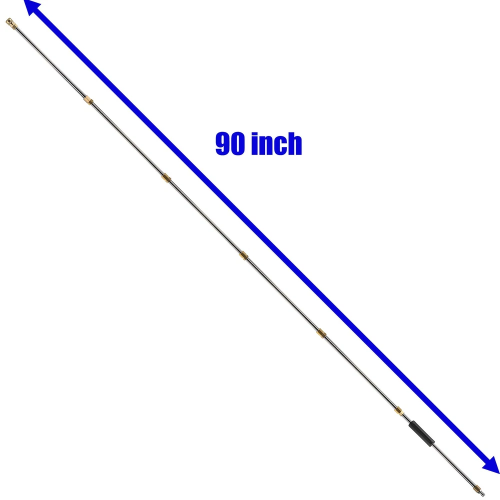 Universal adjustable 7.5 feet Extension Lance for power washer. Adjust the total length of wand freely according to your needs. 6 pcs wands extends to 90 inch of reach. The length of every wand part is 15 inch. Ideal for nozzle, undercarriage cleaner, water broom, surface cleaner and cleaning brushes. Also can used to get the out-of-reach areas such as siding, shutters, windows and more. 1/4’’ female socket connects to these pressure washer parts. 1/4’’ male quick disconnector connects to pressure washer spray . Made of durable stainless steel. The working pressure is up to 4000 PSI.