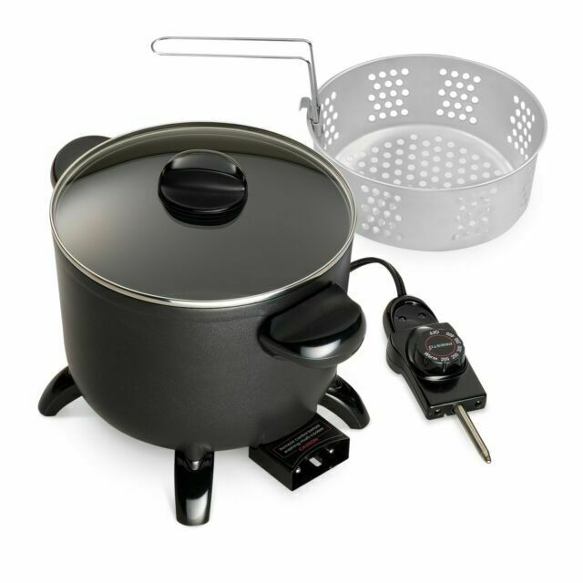 The Presto 06000 Electric Kitchen Kettle Multi-Cooker Steamer is a versatile small kitchen appliance designed for cooking a variety of dishes efficiently. Made of durable cast aluminum with a black diamondcoat non-stick finish, this 6 qt. slow cooker is built to last. With its convenient features such as a steam basket and multi-cooker capabilities, along with easy cleaning and compact design, this electric appliance is a valuable addition to any kitchen. Made by the trusted brand Presto in the United States, this multi-functional cooker offers convenience and versatility for home cooks looking to simplify their cooking experience.
