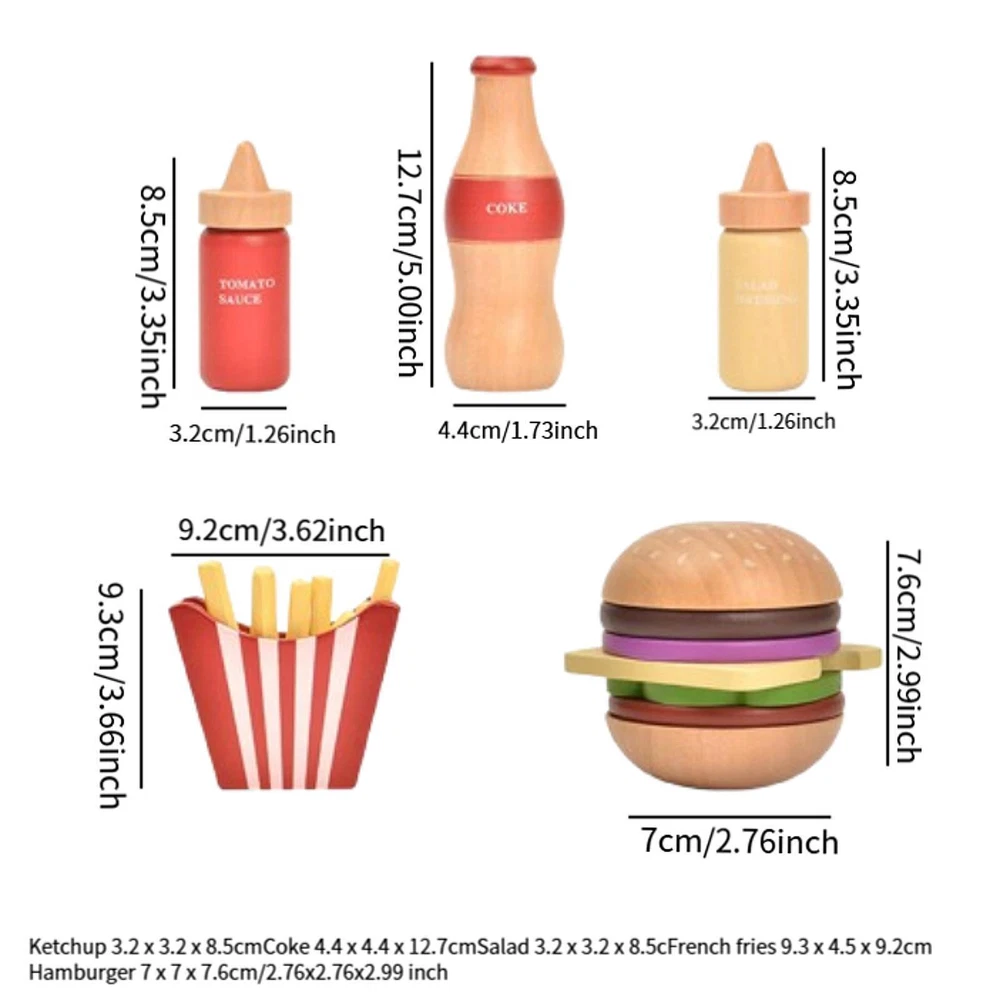 Home & Garden Home Décor Kitchen, Dining & Bar Yard, Garden & Outdoor Living Greeting Cards & Party Supply Clothing, Shoes & Accessories Crafts Health & Beauty Toys & Hobbies Pet Supplies Pretend Play Foods Set Gift Kitchen Accessories for Kids Children Boys Girls Description: 【Kitchen Playset】: Montessori Pretend Play Foods Set includes fries, cola, salad sauce, and ketchup. The rich and realistic food items along with their true to life sizes add more fun to children's playing time 【Wooden Food Toy】: With this Hamburger toy set, you can let your enjoy the fun of role playing. This can enhance communication between parents and children. and exercise their hands on ability and fine motor skills 【Learning and Education】:Wooden Play Sets help babies understand kitchen utensils, food, colors, shapes, and sizes and sharing etc., and simulate preparing food scenes 【Interactive】: Children can play with family or friends, role play, and increase social skills and basic culinary skills 【Ideal Gift】:Kitchen Pretend Play Cutting Food is gifts for kids, children, kindergarten, boys, and girls Specification: Material: Wood Size Chart: Ketchup 3.2cmx3.2cmx8.5cm/1.26inchx1.26inchx3.35inch Cola 4.4cmx4.4cmx12.7cm/1.73inchx1.73inchx5.00inch Salad Sauce 3.2cmx3.2cmx8.5cm/1.26inchx1.26inchx3.35inch Fries 9.3cmx4.5cmx9.2cm/3.66inchx1.77inchx3.62inch Burger 7cmx7cmx7.6cm/2.76inchx2.76inchx2.99inch Package Includes: 1 set Kitchen Playset Toys Note: 1.This is not infant toy, please take away from children to avoid eating. 2.Please allow slightly errors due to manual measurement and different monitors. Payment Shipping Returns If you are bidding or ordering more than one item, the items will be combined into one order automatically thus you can pay altogether. If you want not to combine, please buy one and immediately pay one separately. Please pay what you win in 7 days. Unpaid Dispute will be automatically open if payment is not received after 7 days. If you pay the bill after received unpaid dispute, please email us to close the unpaid dispute. Because the unpaid dispute will not be closed automatically, and we may ignore it. The buyer is responsible for any applicable import duties and local taxes. Please verify with your customs before making your purchase. Please verify your address during checkout. We are not responsible for any wrong or undeliverable addresses. We are committed to give you the best customer service possible. If for any reason you are unsatisfied with a purchase, please contact us and we'll assist you with a prompt solution. Please let us work on the issues. We'd like to settle any problem in a friendly manner. Please do not open a case on eBay or PayPal, or leave any negative or neutral feedbacks directly! We always reply to messages within 2 business days (off-duty at weekend). Due to the difference of time zone between Hong Kong and your location, sometimes the answer will be delayed. If you do not get a response from us after 2 business days, please check your junk or spam mailbox. Unsatisfied product can be returned within 30 days from the delivery date . We can offer a full refund or exchange, but we are not responsible for return shipping cost. Please contact us to get a RMA number before sending out your return. Feedback: 1. Since your feedback is very important to our business's development, we sincerely invite you to leave positive feedback with four 5-Detailed Selling Rating (DSR) to us basing on your satisfaction with our commodity and service. It's just take you 1 minute. 2. Unfortunately, If you are planning to give us a neutral/negative feedback because of your bad buying experience with us, please contact us at any time so as to clear up your discontent and resolve the problem. Featured Products People always bought together with