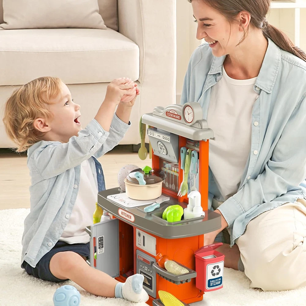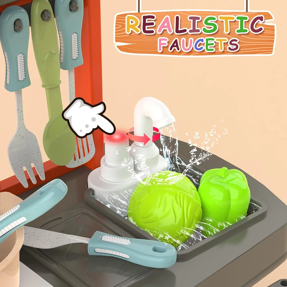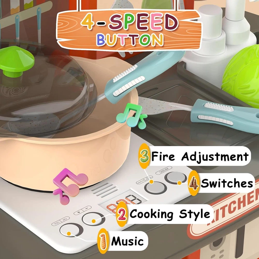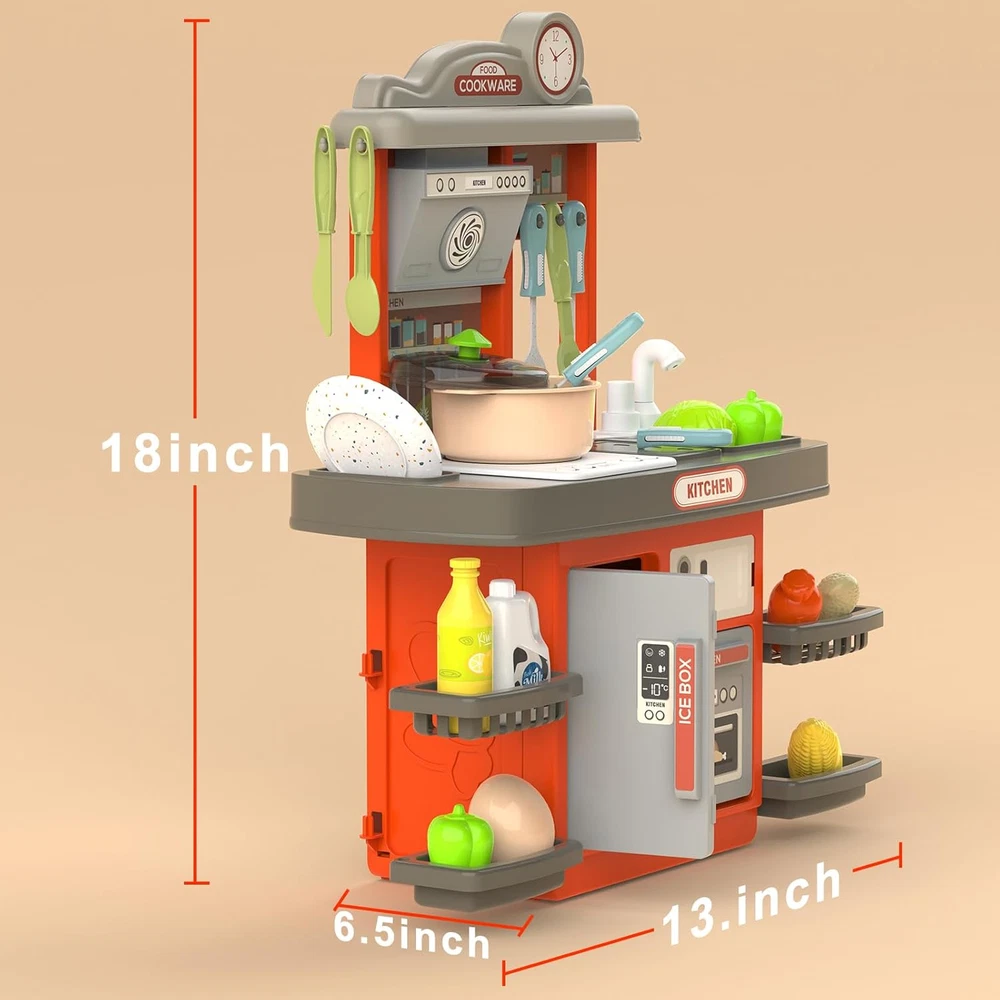 【Kids Play Kitchen】Our kitchen toys are designed to integrate a simulated real cooking table, simulated faucet, shopping cart and a variety of ingredients kitchen utensils, so as to build a fun little chef to explore the field. 【Product Features】The kitchen for kids ages 3-8 are equipped with a sound and light effect induction cooker that simulates real cooking sounds and flame lights, plus a faucet that can be pressed to dispense water and rotated to significantly enhance the immersive experience; and the built-in diverse music further adds to the fun of play. 【Product Function】Through the practice of simulated cooking activities, the play kitchen can effectively exercise children's hand-eye coordination, stimulate imagination and creativity, therefore, the toddler kitchen set enhance the valuable parent-child interaction time. 【Size and Assembly】The kid kitchen playset measures 13 * 6.5 * 18 inches, which is small enough to fit anywhere in the house, and comes with an easy-to-follow assembly guide to ensure that parents can complete the building process quickly and safely. 【Ideal Gift】This play kitchen sets for kids ages 4-8 is not only educational, but also full of fun, making it a birthday or holiday surprise, so it is a perfect gift to accompany and promote the healthy growth of children. Product Description