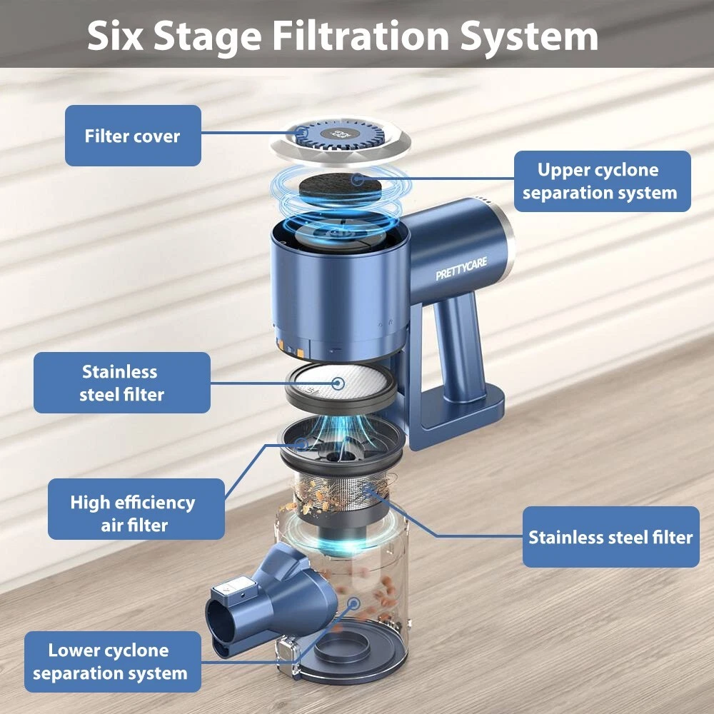 PrettyCare Pretty Life, Care Your Life. Whether your goal is to clean up a pile of pet hair,a handful of spilled breadcrumbs or a big mess of dirt,the PrettyCare W200 cordless vacuum cleaner makes it easy to solve all your problems and give you a clean, healthy and comfortable home. In addition to the basic cleaning functions, we have also done a lot of details, welcome to experience our versatile, powerful and intelligent cordless vacuum cleaner, it will bring you a new cleaning efficiency! ✅【6 * 2500mAh/ Upgraded Motor】 The PrettyCare cordless vacuum cleaner is equipped with a 6*2500mAh high-power battery and a high-performance 180W upgraded motor.It is very reliable because the larger capacity battery gives you a longer cleaning time. Say goodbye to annoying "cleaning breaks" and ensure a thorough cleaning of your 1937.50 square foot home in one go. ✅【48 minutes Running Time /28Kpa Super Suction】 With 28Kpa hurricane suction and 2 adjustable modes,the PrettyCare cordless vacuum cleaner can run for about 20 minutes at 28KPA power mode and even for about 48 minutes at 15kPa normal suction,amazingly it can adapt to different conditions and allow full use of the battery. It instantly wicks away dirt,debris,pet hair and stains and easily cleans hard floors, tiles and carpets.Please note that the actual use time may vary due to differences in use scenarios and accessories. ✅【Integrated LED Display and Warm Dust Cup】 The electric vacuum cleaner is equipped with a smart LED display so you can easily view the current status of the vacuum cleaner. Large capacity 1.3L large dust collection cup adopts "one-button dust collection" design, no need to constantly pull the trigger when vacuuming, making it easy to empty. ✅【6-stage High Efficiency Purification and Filtration】 In order to provide users with extremely clean air and excellent cleaning experience,we have developed a stainless steel filter filtration system, a powerful cyclone/precision filter hole and a 6-stage HEPA filtration system that can capture 99.99% of fine dust as small as 0.1 microns and discharge clean air. It has twice the service life of conventional filtration systems.(HEPA is washable and recyclable). ✅【Flexible LED Electric Floor Brush Head and Adjustable Tube】 To make it easy to look into dark corners and track dust,debris and hair under furniture,we designed four LED headlights on the floor brush.To clean all those hard-to-reach corners under the furniture and under the bed and remove all the dust, we also come with a flexible 180°side-swivel and 90°up-and-down swivel floor brush head and self-adjusting telescopic rod. Make cleaning more thorough and effective. ✅【Upright and Wall-mounted Cordless Vacuum Cleaner】 The lightweight unit weighs just 2.8 pounds and has an ergonomic handle that's perfect for one-handed cleaning. Even if used for a long time, it will not make your hands tired.At the same time, our machine can stand on its own, but also equipped with a wall hanger can be hung on the wall, in the middle of cleaning, you can stop cleaning at any time and let the vacuum cleaner upright anywhere, you can also let it back to the wall hanging, both ways are easy to store and use, charging does not take up any space. ✅ 【Multi-Functional Brush Head】 In addition to powerful floor brushes, we also come with convenient 2-in-1 brush heads and long flat brush heads, which have the advantage that you can combine them in a variety of different ways, so you can get the job done easily and efficiently. Easily clean stairs, curtains, windowsills, sofas, beds, cars, RVS and other hard-to-reach places! Meet all your daily cleaning needs on multiple surfaces, including hardwood floors, carpets and pet hair or food. ✅【Convenient Noiseless Operation】 The PrettyCare cordless vacuum cleaner uses ultra-lightweight materials to effectively reduce noise and provide a quiet cleaning experience. Since there is no friction from any carbon brushes, the upgraded high-power brushless motors generate less heat and are less noisy (60db), resulting in more energy saving and longer service life. The ideal gift for family and friends who value cleanliness and peace in the home. Warm Reminder: 1/ The filter should be cleaned and replaced regularly, otherwise it may cause garbage to clog the vent, resulting in rapid suction attenuation. 2/ If you have any questions about the operation, please feel free to contact customer service, we will provide you with professional service. Technical Specifications: Battery: 6*2500mAh lithium-ion battery Suction: 28Kpa strong cordless vacuum cleaner Filtration Method: 6-stage purification filtration (Washable) Runing Time: Max 48 minutes Adjustable Metal Rod: 2.6 ft - 3.4 ft (Aluminum) Dust Cup: 1.3L large capacity & One key dust removal Floor Brush: 180°+ 90° rotation degree & 4 LED lights Other Brush Heads: 2 in 1 brush and crevice brush Screen: LED display Storage Way: Wall hanging & Upright Cleaning Ways: 2 Ways Product Weight: 5.4 lbs ultra light body Charging Time: 4-5 hours Noise Level: ≤60dB Cleaning Range: 180㎡(1937.50 square feet) Recommended Use: Carpet, Hard wood,Marble, Tile Package Include: 1 x W200 Vacuum Cleaner 1 x Rotatable Brush Head 1 x Wall Bracket 2 x Hepa Filter 1 x 2 in 1 Brush 1 x Crevice Nozzle 1 x Adjustable Metal Tube 1 x Power Adapter 1 x Instruction Manual For Better Use: 1. Please use the original adapter to charge the battery. 2. Please Clean the filter after each use and keep it dry. 3. Please ensure that each component is installed correctly before using. 4. Please don't use the cordless floor cleaner to suction anywhere with water. 5. Please promptly empty the dust in the dust collection cup after use. 6. Please clean the filter and black cylindrical sponge while emptying the trash. 7. Please keep your vacuum cleaner and charger in a cool, dry place indoors.