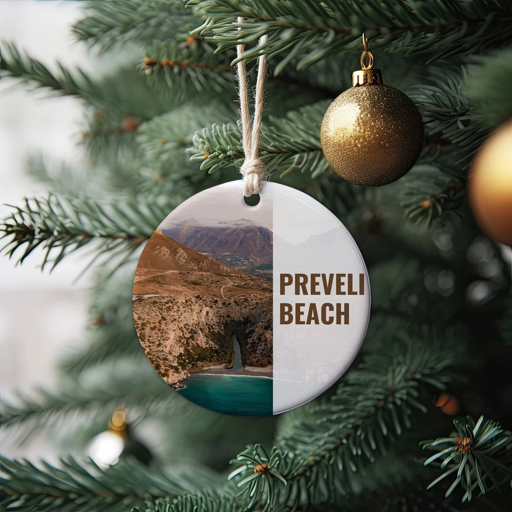 Preveli Beach Ornament Christmas Ornament Preveli Beach Gift Christmas Gift Christmas Decor Preveli Beach Souvenir Material: Ceramic Color: White Shapes: Circle, star, heart and oval Can be printed on both sides Imprint full-color artwork, photos, or logos Hole for hanging string and hanging string included Printed in the USA