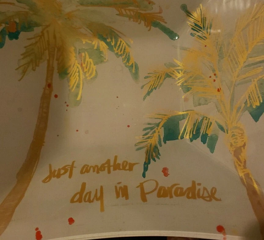 Add a touch of paradise to your dining table with this stunning Prima Design glass square bowl. The colorful multi-color theme and whimsical "Just Another Day In Paradise" message make this bowl a unique and eye-catching addition to your serveware collection. Made of high-quality glass and measuring 10.75 inches in width, this bowl is perfect for serving salads, snacks, or desserts. It is handmade and signed, adding a personal touch and making it a great gift option. The square shape and 3.5 inch depth of the bowl add to its functionality, making it perfect for both casual and formal occasions.