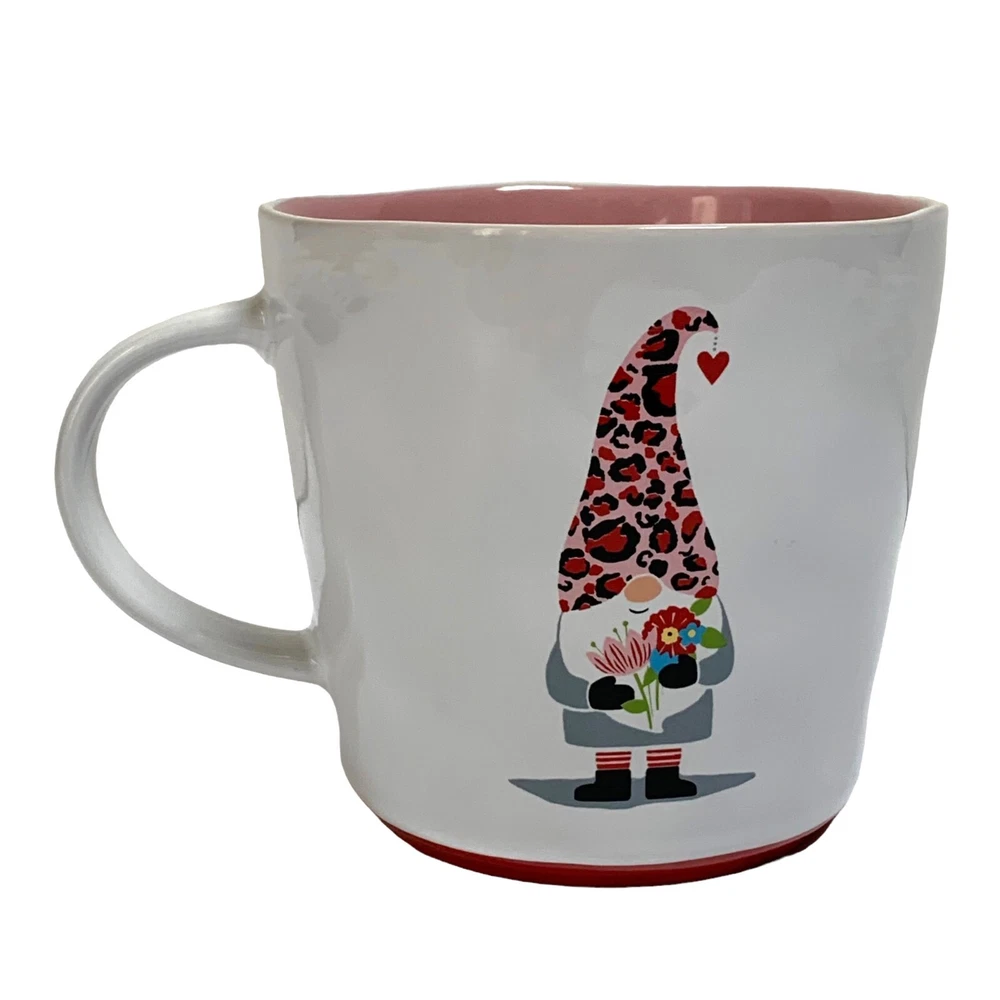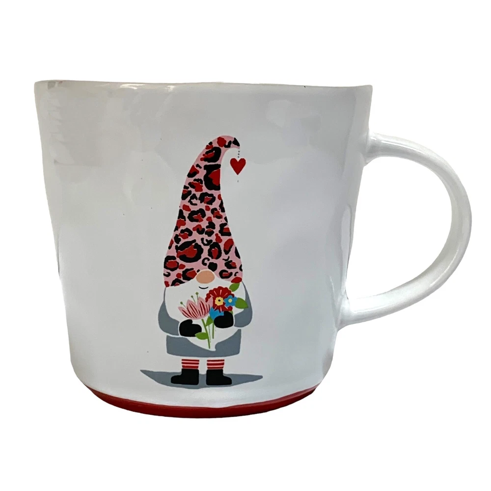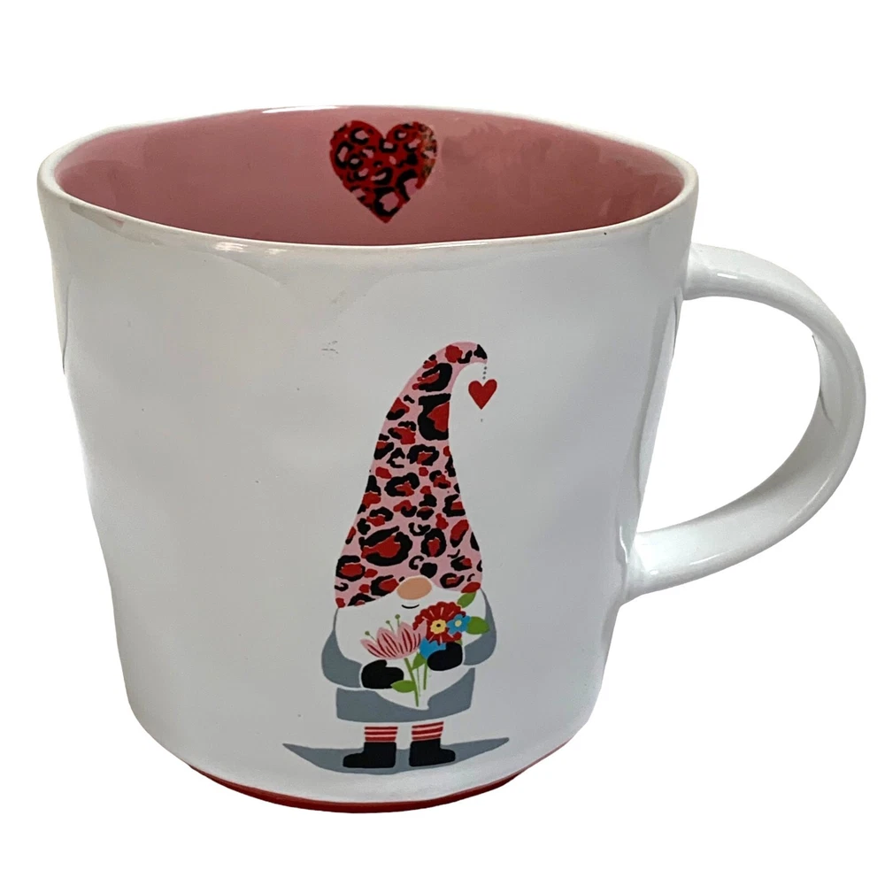 Prima Design Gnome Mug Valentine's Day Love Cup Pink Red Leopard Print Hat Heart Flowers This fabulous mug is decorated with a cute gnome wearing a pink and red leopard print hat and holding a bouquet of flowers. A small heart of the same pink and red leopard print sits just inside the top rim. Perfect for celebrating Valentine's Day or just adding a touch of whimsy to your morning coffee routine. Microwave and dishwasher safe. Measures approximately 4" tall x 4.25" diameter (top); 15 oz capacity.