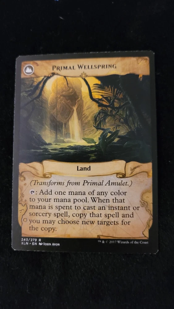 This Primal Amulet card from the Ixalan set is a rare and highly sought-after artifact in the Magic: The Gathering game. With a transform layout and a mana cost of 4, it is a powerful addition to any collection. The card features the artwork of John Avon and has the card number 243/279. Condition as seen in images