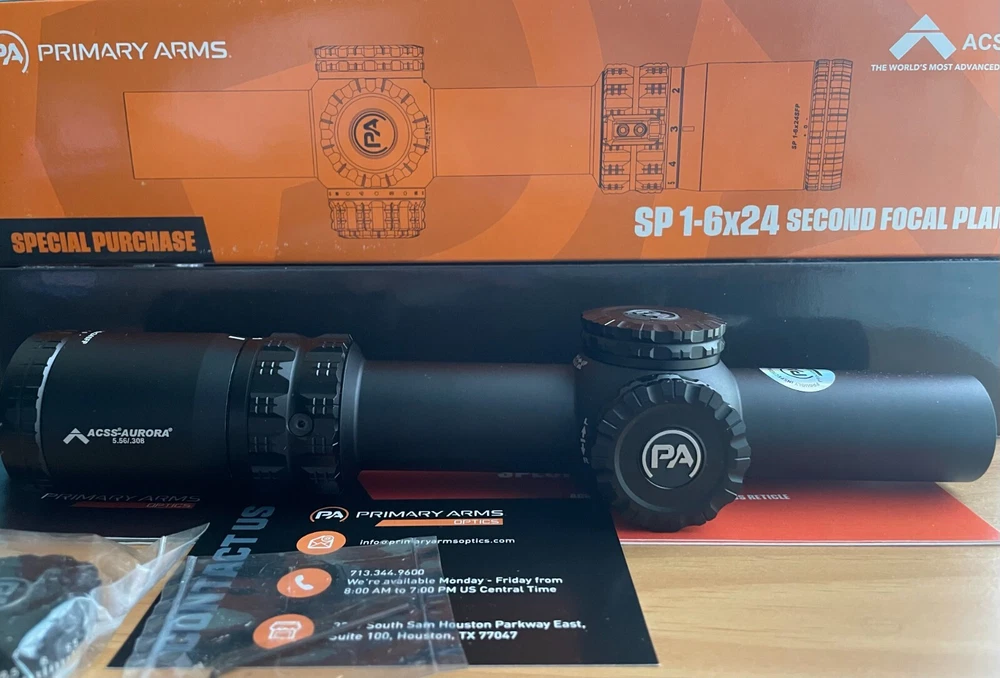 best price you'll find on ebay!!! THIs item retails for 400 + TAX on PA! SOLD OUT ON PRIMARY ARMS, READ DESC Details The SP1-6x24mm rifle scope is a high-performance low-power variable optic that combines exceptional quality and craftmanship to deliver unmatched speed and precision. Crystal clear low-dispersion lenses, exciting features such as steel on steel and interchangeable turrets. The SP 1-6x24mm comes in an eminently practical magnification range make this scope an excellent option for hunting, competition, or even just punching paper at the range. The combination of quality, features, and of course the Advanced Combined Sighting System (ACSS®) reticles is hard to beat. Like all Primary Arms optics, the Special Purchase 1-6x features an industry leading lifetime warranty and commitment to customer satisfaction. Transferable Limited Lifetime Warranty from PA on this item! This scope is essentially high quality GLx glass from the Philippines in an SLx body. Normal SLx: lower quality Chinese glass Special Purchase: higher quality Philippines glass and construction! Special Purchase scopes have low levels of illumination, and are sold and described by Primary Arms as such. Notice the term "Partial Illumination" utilized in the description. The Special Purchase Aurora tends to have varying levels of dim illumination that essentially only works in lower light conditions as a tradeoff for having high quality glass from the Philippines and not glass from China. I assume that if you purchase this scope, you are aware of this fact. That being said, this particular scope seems to have a reticle that's a bit brighter than other SPs I have seen. Product has not been used, but opened and removed from packaging to examine and verify functionality. Comes with its original box and included accessories. WILL NOT SHIP WITH BATTERY AS PER SHIPPING REGULATIONS Features: 1-6x Magnification Made in The Philippines 24mm objective 3.3" - 3.8" of eye relief 30mm main tube High strength one-piece 6061-T6 aluminum body Compact design is 10.7" long and weighs just 17.6 Oz Premium grade glass Steel-on-Steel precision adjustments Tactile and audible 1/10 MIL click value Turrets are user configurable between Tactical or Capped Movable and replaceable magnification ring fin Partial reticle illumination The ACSS Aurora 5.56 M6 S reticle is a high-performance LPVO reticle with a comprehensive toolset for ranging and engaging targets. This reticle uses yards-based BDC (Ballistic Drop Compensation) holdovers calibrated for 5.56 and .308 cartridges. Other great features included in this reticle are wind holds starting at 400 yards as well as moving target leads between 100 and 300 yards. Specifications Battery Type CR2032 3V Lithium Coin Brand Primary Arms Click Value 0.1 Mil Color Black Exit Pupil Diameter Low: 12.7mm / High: 4mm Eye Relief 3.3in. - 3.8in. Field View 100 Low: 110ft. / High: 15.1ft. Focal Plane Second Focal Plane Illuminated Partial Illumination Length 10.7 in. Magnification 1X - 6X Mount Compatibility 30mm Night Vision Compatible Non-Compatible Objective Diameter 24mm Reticle ACSS AURORA 5.56 Y Reticle Color Red Reticle Type BDC Total Elevation Adjustment 160 MOA Total Windage Adjustment 160 MOA Turret Features Capped Turrets, Exposed Turrets, Finger Adjustable Weight 17.6 oz.