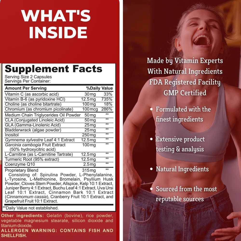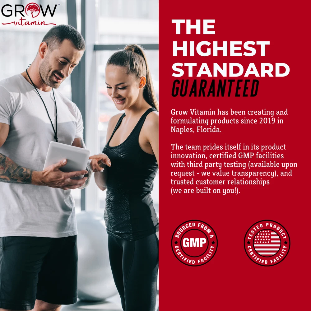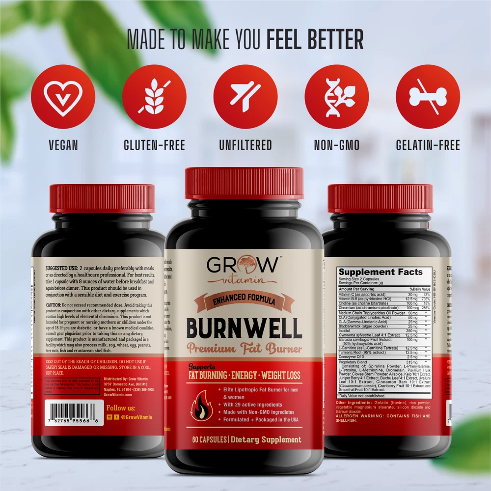 All-In-One Diet Pills for Men and Women, Grow Vitamin Fat Burner combines the most effective stimulant-free ingredients for fat burning and weight loss management; this full spectrum formula support the areas critical for effective weight loss including release of stored fat, fat burners, appetite support, metabolism support, and mood support. Real Results Stop settling for supplements that simply don't work. Made with premium ingredients, our one-of-a-kind fat burner helps you reach the mark. Feel a clean surge of energy, enhanced focus, and appetite control to help keep your diet in check. Grow Vitamin's Premium Fat Burner helps maximize fat burning while preserving hard-earned lean muscle. Maximize the Burn For best results, use for 60 days in combination with a healthy diet and exercise program. Drink plenty of water daily to avoid dehydration and never take Grow Vitamin's Premium Fat Burner on an empty stomach. Read instructions carefully. Research-Backed Ingredients Grow Vitamin's Premium Fat Burner uses premium natural ingredients, efficacious doses, total label transparency, and contains no artificial fillers, preservatives, or food dyes. Each bottle of Grow Vitamin's Premium Fat Burner is manufactured in a cGMP manufacturing facility in the USA, adhering to the most stringent manufacturing standards. TIPS Never take our Fat Buner on an empty stomach Drink plenty of water daily Avoid taking 5-6 hours before bed Combine with healthy eating and an exercise program Immediately discontinue use if you experience serious side effects or allergic reactions 11 Active Ingredients: 11 Modes of Action to help burn fat, boost metabolism, and curb appetite to help you achieve results around the clock without stimulants; Grow Vitamin’s 100% transparent formula of 11 powerful ingredients including Green Coffee, Green Tea, Raspberry Ketone, CLA, L-Theanine, and Garcinia Cambogia offer unique modes of actions to help burn fat and control your appetite morning and night. Metabolism Booster to Support Weight Loss Goals: this weight loss supplement formula contains Green Tea Extract which supports metabolic rate to help burn fat; this fat burning pills includes Green Coffee Bean Extract to support glucose metabolism through a high % of Chlorogenic Acid (CLA), an omega 6 essential fatty acid that supports metabolism by turning stored fat into energy; Grow Vitamin's Garcinia Cambogia supports energy production and metabolism helping you burn fat while you work out. Burn Fat but Maintain and Protect Muscle: Our Fat Burner contains 50mg of CLA to help support preserving your muscles against the catabolic effects of dieting and exercise; when on a low calorie diet, CLA supplementation before or during workouts could make a difference by targeting fat instead of muscle; with 50mg of L-Theanine, Fat Burner supports blood flow to the muscles, resulting in reduced oxidative stress which supports less muscle damage during and after a high-intensity workout. Non-Proprietary, Fully Disclosed Quality Ingredients: Unlike many brands with proprietary blends, Our Premium Fat Burner ingredient label is 100% transparent so you can see the exact amounts of every ingredient of our full spectrum formula; made in the USA with premium quality ingredients in a plant that is certified for Good Manufacturing Practices; our stimulant-free fat burner for men and women can be used by anyone from those just getting into fitness to competitive athletes.