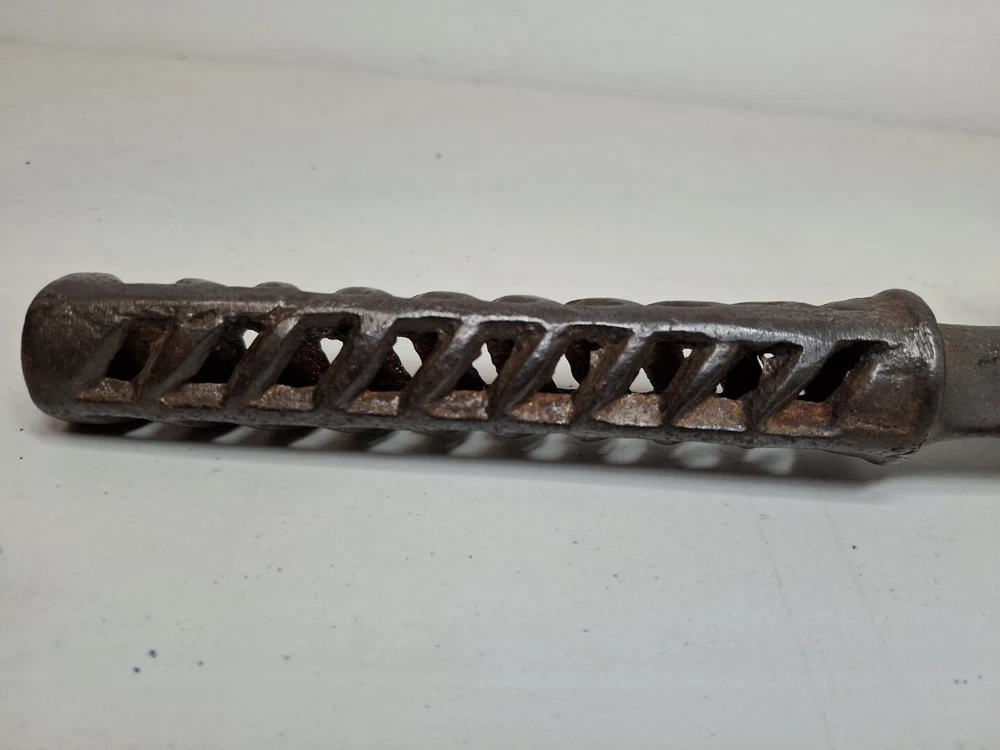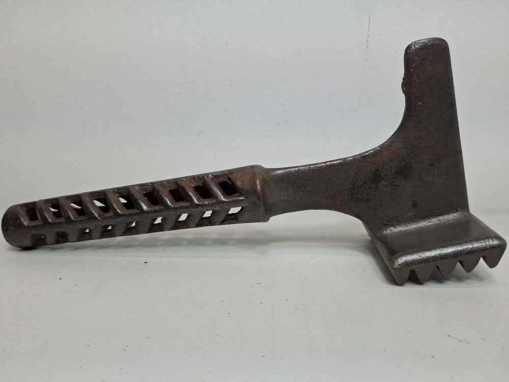 This primitive solid metal meat tenderizer tool is a must-have for any kitchen enthusiast. Its unique design and style make it a great addition to any collection of kitchen equipment. The tool is made of high-quality metal and has a sturdy construction that ensures it will last for years to come. While the date of creation and region of origin are unknown, this original piece is sure to impress any collector of antiques and primitives. Whether you're using it to tenderize meat or simply displaying it in your kitchen, this tool is sure to be a conversation starter. Add it to your collection today!