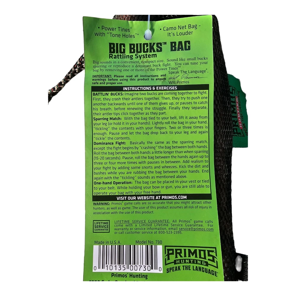 New Primos Big Bucks Bag Rattling System Big sounds in a convenient, compact size. Sound like small bucks sparring or reproduce a dominant buck fight. You can tune your bag by removing one or more of the Power Tines. I ship FAST!! Your item will be in the mail the day after payment is received. Thanks for looking!!