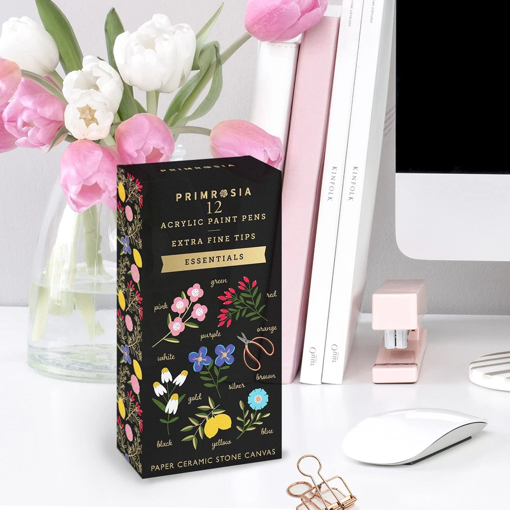 Start here! Primrosia has curated a must-have collection of Essentials acrylic paint colors in one set. Every artist, student or professional will utilise these primary colors in their illustrations and drawings Quality, Versatility and Multi Surface. You will enjoy diy, craft and art projects on many mediums from paper, card stock, bullet journaling, rock, stone, ceramic, plastic, fabric, canvas, wood slices. Suitable for light and dark surfaces 0.7mm extra fine Japanese tip, rich and opaque Ink. Create detail and fine lines when sketching, painting and lettering. Our markers are water based, vivid, durable, non-toxic and odorless Easy to use smart pen design: A pump action allows the internal acrylic paint to remain air tight, the opaque pen barrel is light resistant reducing color fade and paint can be reapplied seamlessly within sittings. Before starting your project, vigorously shake pen with lid on to activate mixing ball, depress nylon nib several times to prime. The marker is ready to use when tip holds paint. Easy for professional artists, adults, students and teens 12 popular colors: Metallic gold and silver, white, black, red, yellow, blue, pink, green, brown, orange and purple packaged in our cute aesthetic box We believe in giving back: Part of our profits are donated to Ovarian Cancer research annually. We also want you to be part of our community, to share the love of creativity and positive mental health through art