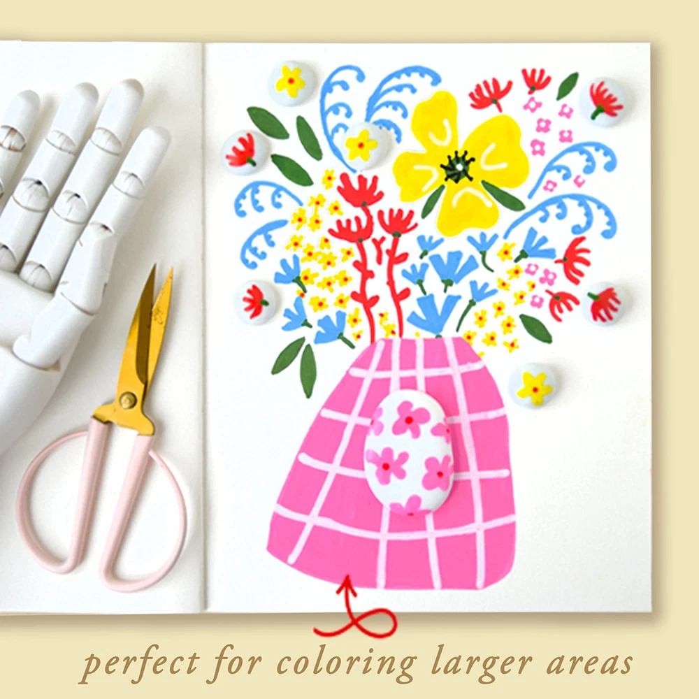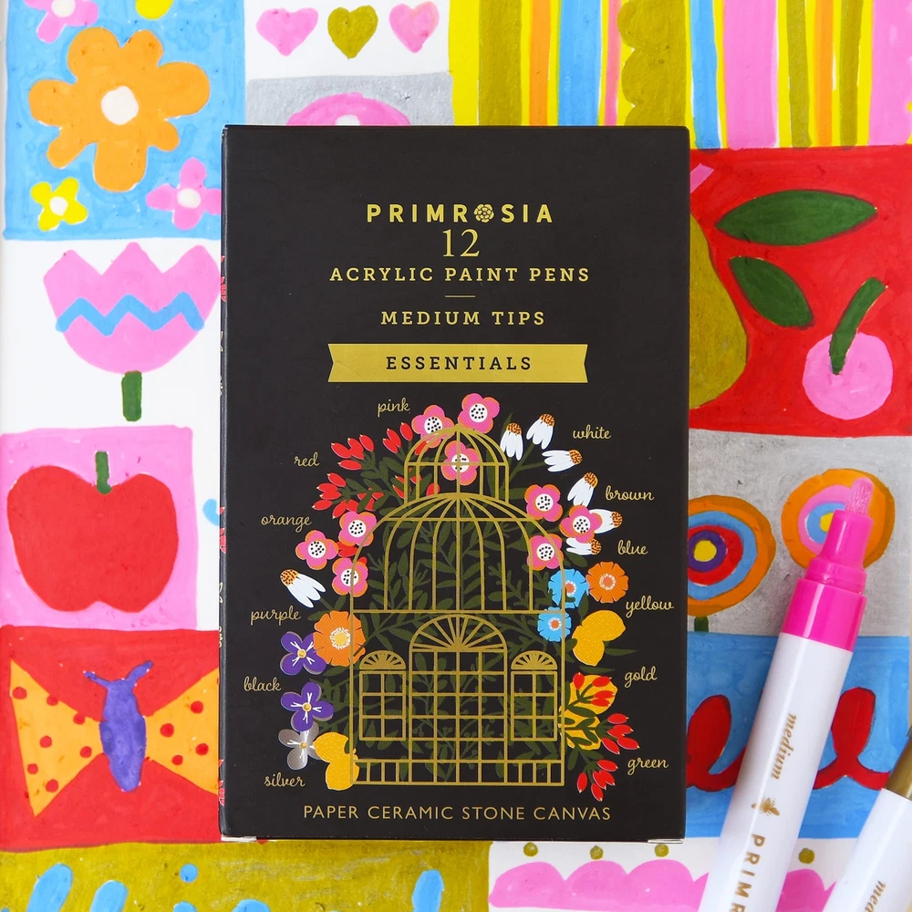 Start here! Primrosia has curated a must-have collection of Essentials acrylic paint colors in one set. Every artist, student or professional will utilise these primary colors in their illustrations and drawings 2 to 3mm medium tips for painting larger areas with rich and opaque Ink. Great for sketching, painting, lettering and drawing on rocks. Our markers are water based, vivid, durable, non-toxic and odorless. Consider our matching Essentials extra fine set for finer details Quality, Versatility and Multi Surface. You will enjoy diy, craft and art projects on many mediums from paper, card stock, bullet journaling, rock, stone, ceramic, plastic, fabric, canvas, wood slices. Suitable for light and dark surfaces Easy to use smart pen design: A pump action allows the internal acrylic paint to remain air tight, the opaque pen barrel is light resistant reducing color fade and paint can be reapplied seamlessly within sittings. Before starting your project, vigorously shake pen for 15 seconds with lid on to activate mixing ball, depress nylon nib several times to prime. The marker is ready to use when tip holds paint. Easy for professional artists, adults, students and teens 12 popular colors: Metallic gold and silver, white, black, red, yellow, blue, pink, green, brown, orange and purple packaged in our cute aesthetic box We believe in giving back: Part of our profits are donated to Ovarian Cancer research annually. We also want you to be part of our community, to share the love of creativity and positive mental health through art