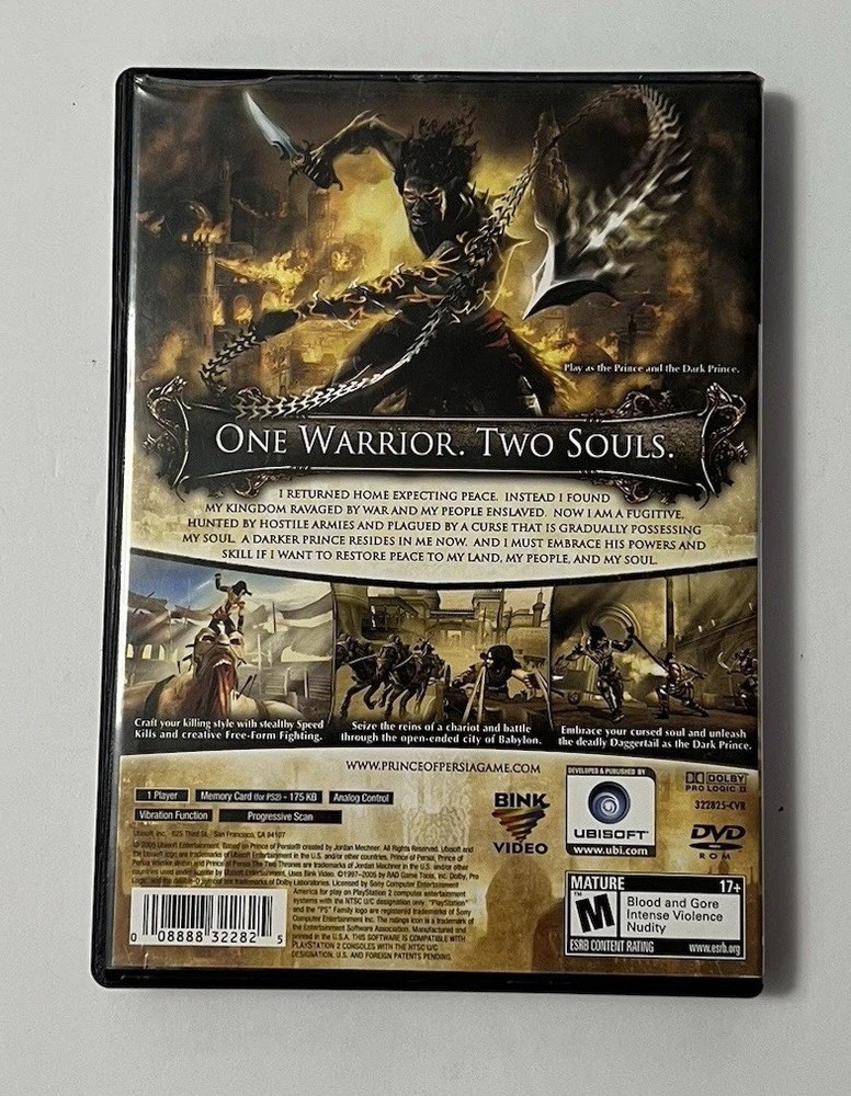 Item Condition Description (Very Good) Item is in very good pre-owned condition. Game disc has been tested and works perfectly. Case and manual are included and show only light wear from normal use. ⸻ Listing Description Step into the action with Prince of Persia: The Two Thrones for the Sony PlayStation 2 (2005). Play as the Prince in an epic battle against time and fate, combining parkour-style movement, acrobatics, and intense combat. Details: • Platform: Sony PlayStation 2 (PS2) • Game: Prince of Persia: The Two Thrones • Release Year: 2005 • Includes: Original case, artwork, and manual (Complete In Box) • Condition: Very Good – tested and fully functional Perfect for fans of action-adventure and classic Ubisoft titles. Ships fast and safely packaged with tracking included!