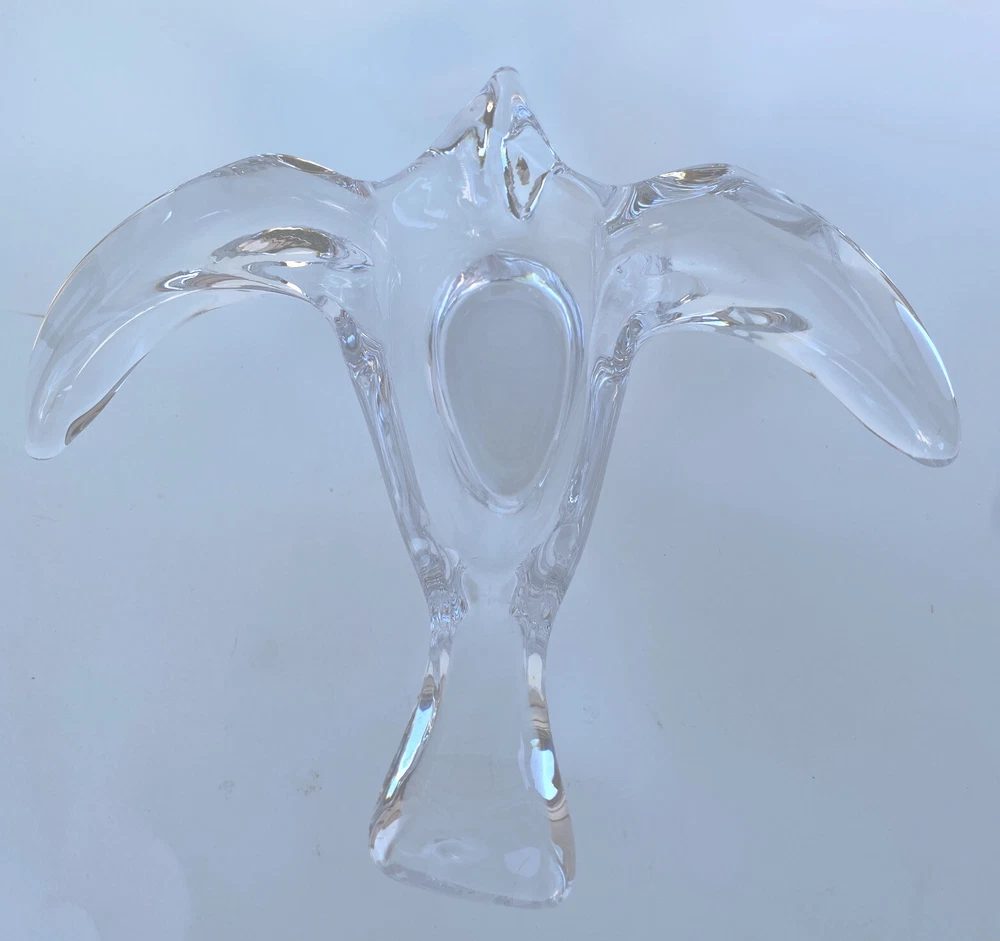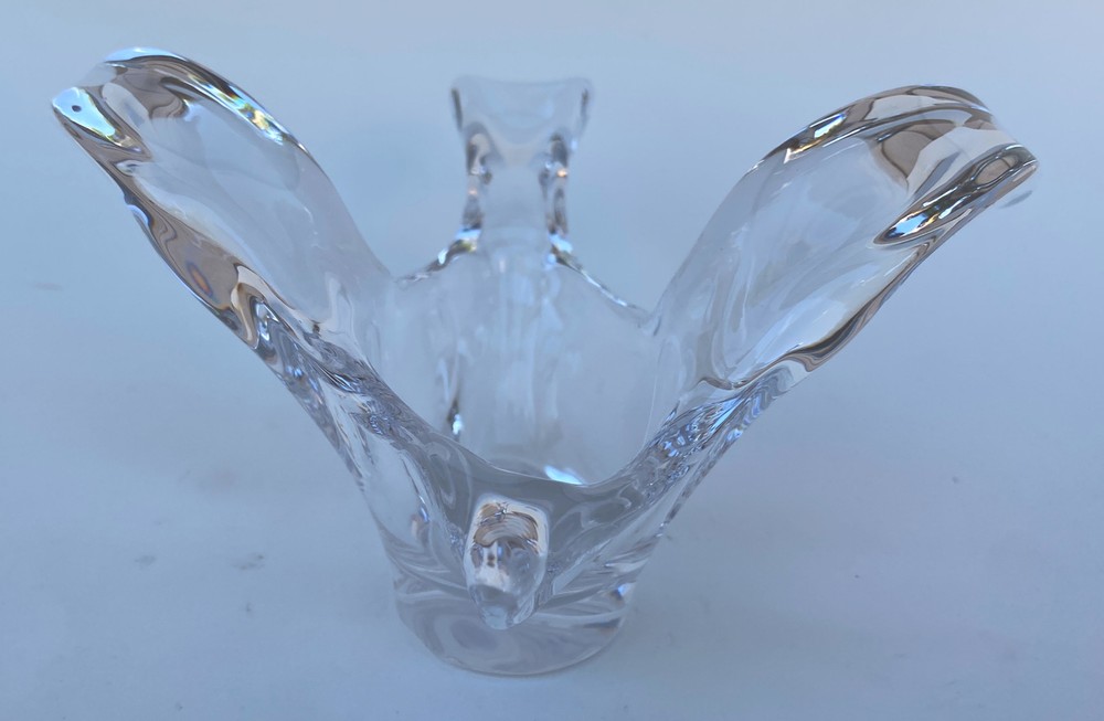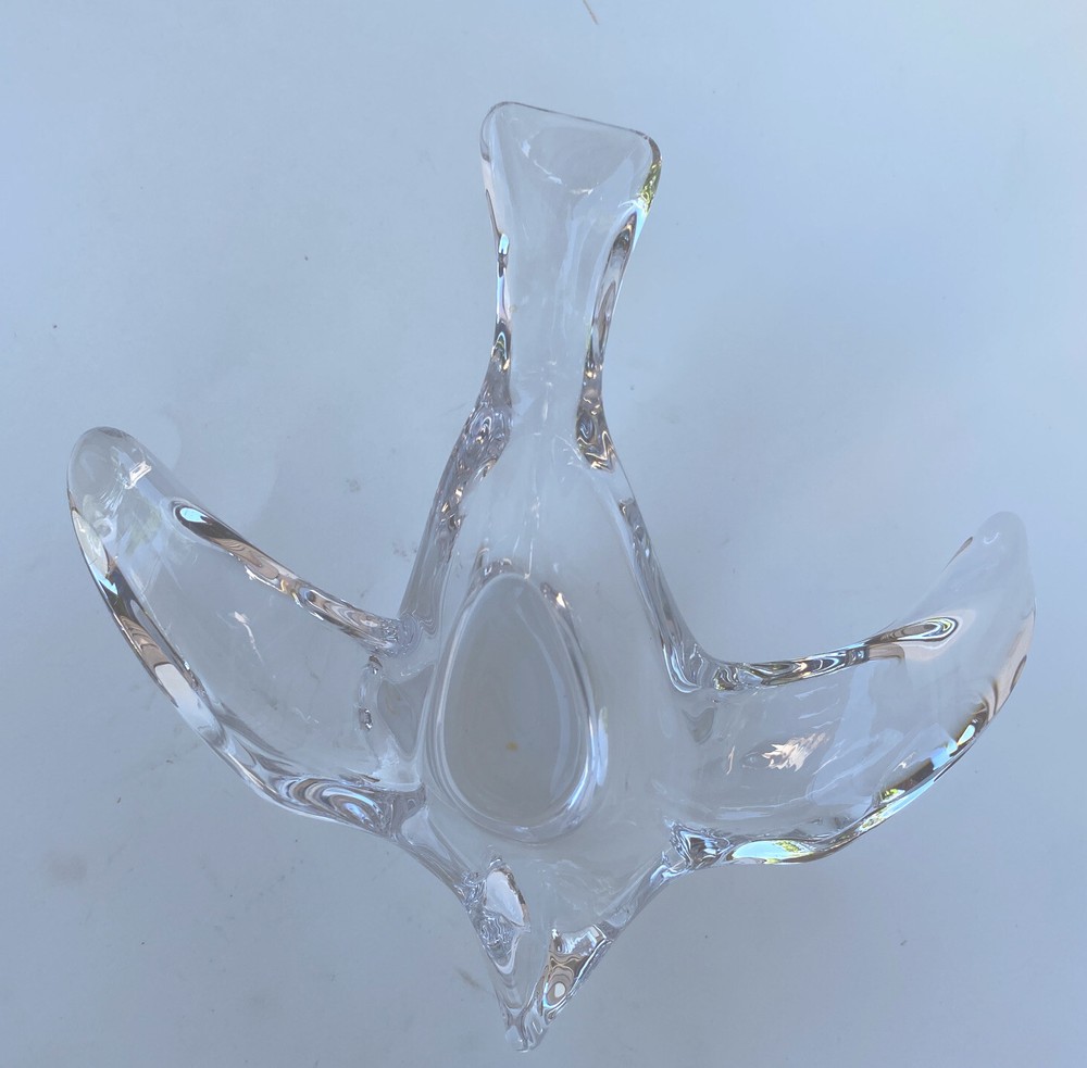 The Princess House art glass Bird dish Dove Bowl is a contemporary candy dish featuring a bird theme. Made of clear glass, this trinket vanity jewelry piece is designed in a sleek and modern style, perfect for adding a touch of elegance to any space. Produced by Princess House, known for their art glass creations, this dish is ideal for holding small trinkets or jewelry in a stylish manner.