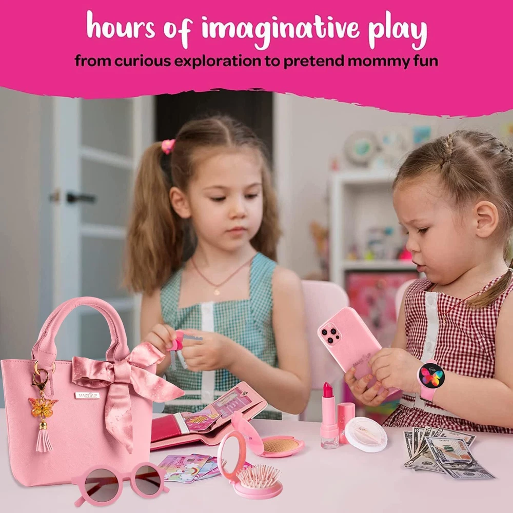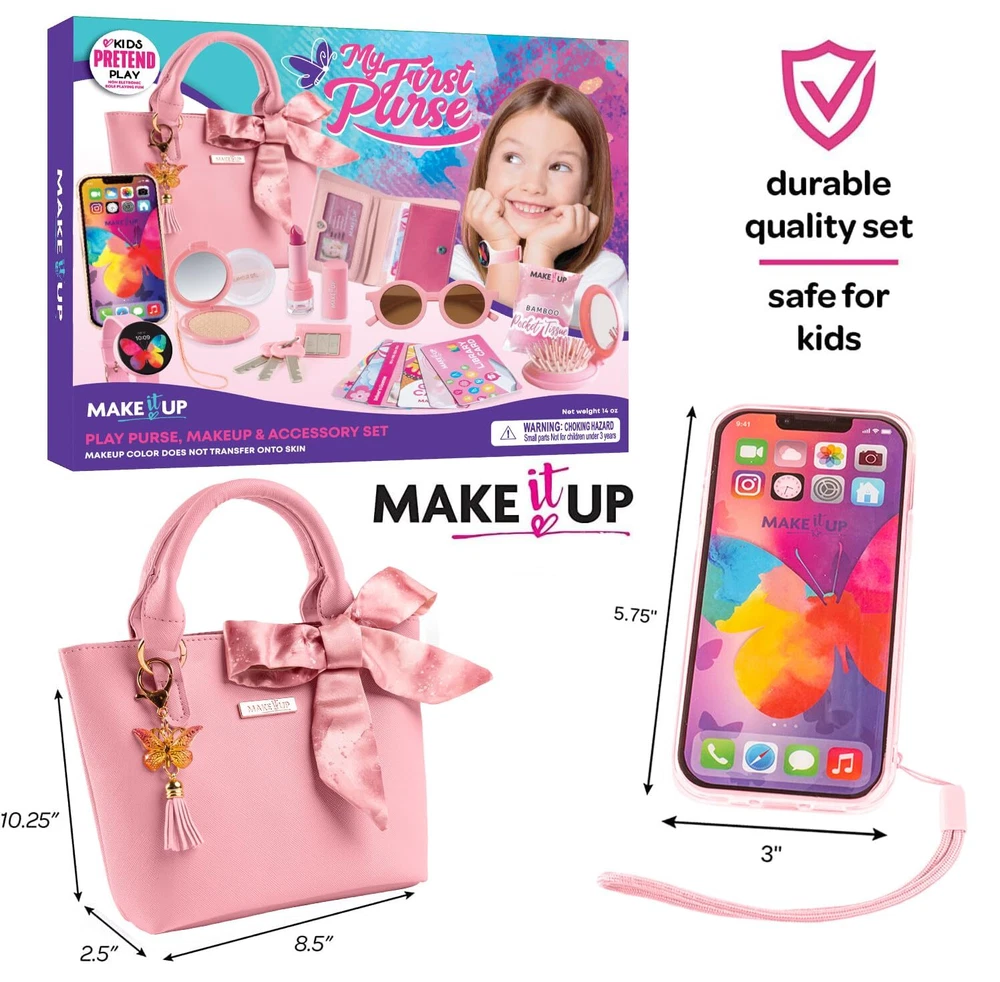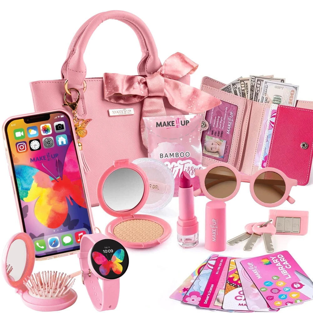 π MY FIRST PURSE SET : Our package includes pretend play purse & girl toys pretend makeup kit for girls contain 15 pieces. purse, non-electronic smartphone & , wallet with fake money, pretend key fob with keys, blush compact with applicator sponge, pretend lipstick, 2 credit cards, 1 library card, 1 ice cream gift card & 1 vip spa card. This makeup kit has a variety of pretend play toys for endless hours of fun realistic money baby boy toys. π SAFE & DURABLE : The purse with little girls makeup kit is made of non-high-quality materials. The fake makeup kit looks real, but it will not directly apply to skin like actual natural makeup for . These little girl makeup kit items have no sharp edges & are safe for to play with them. Our fake make up for set is intended for girls to have fun wearing makeup for girls, not for actual makeup application. Perfect play makeup kit for 2 year olds & up. π PRETEND PLAY PURSE : The makeup set comes with an attractive faux leather play purse with a convenient handle for easy carrying & storage. The pretend makeup kit for girls bag has been deliberately created to provide adequate space for every kid makeup cosmetic, ensuring that everything of princess makeup kit for is properly organized. This make up kit purse is eco-friendly, allowing small hands to easily handle & reach to girls play makeup cosmetics. π HOURS OF IMAGINATIVE PLAY : These non makeup sets are crafted with brilliant colors and delicate textures to capture a 's attention & make them feel special. This pretend makeup for toddlers not only fosters creativity but also enhances social & cognitive skills during play makeup set time. These toys for girls play makeup set for girls is a great item for girls to play with their friends & looks great displayed on a vanity set. π PERFECT GIFT FOR LITTLE GIRLS : This kit de maquillaje para niΓ±as fake makeup set pretend makeup toys is an excellent gift for girls suitable for birthday party, play makeup kit for girls 4-6, girls makeup kit age 4-6, face makeup for 3-5, makeup kit for girl 4 year old, make up kits age 2, makeup kit for toddlers 3-5, make up kits age 4, mermaid makeup for , toy make up set for girls, makeup sets for girls 5-8, christmas gifts for 8-12 etc