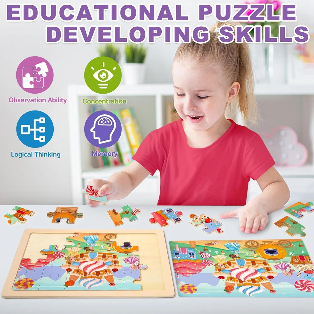 Engaging Themes for Girls: This wooden puzzle set features 4 exciting themes unicorns, princesses, mermaids, and fairies. Each contains 24 durable wooden pieces, let them try to complete the 24-piece puzzles, assembled to show 4 different appealing themes. Safe and Durable Construction: Crafted from high-quality wood, precisely cut for the perfect interlock without swollen edges, not too tightly or too loosely. Each piece is carefully polished so that the child can grasp it safely. These puzzles are durable enough to be used repeatedly by children. Easy to Complete: With a finished size of 11.8 x 8.8 inches. Each puzzle comes with a removable paper illustration for fun reference, and a wooden frame keeps pieces in place while assembling. Let little ones easily match up puzzles by themself without help. Educational Fun: These puzzles for toddlers encourage creativity, enhance hand-eye coordination, and foster problem-solving and spatial reasoning skills, keeping children engaged and providing parents with more free time. Perfect Gift Choice: Ideal for Birthdays, Christmas, Easter, and more, this wooden puzzle set is an excellent gift for girls aged 3-8. You can enjoy your family time with our travel puzzles toy and bring positive emotions to everyone. Product Description