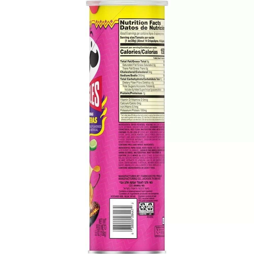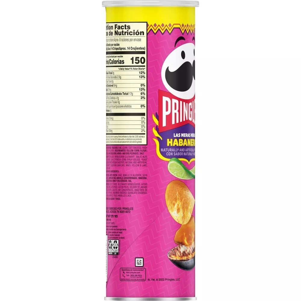 Heat up snacking moments with the smoky, spicy flavor and fun shape of Pringles Las Meras Meras Habaneras Potato Crisps Authentic Mexican flavors come to life with the hot and tangy taste of char-grilled habanero peppers, lime, and salt from edge to edge Always tasty, never greasy; Kosher Dairy; Contains milk and wheat ingredients Stack, snack, and savor at home and on the go; Pop open a can for gaming, sports watching, party time, or any time Includes one, 5.5oz can of ready to eat potato crisps; Packaged for freshness and great taste What happens when you combine the taste of grilled habanero peppers with the light, crispy crunch of Pringles? You get a punch of spiciness that's outrageously delicious. Each Mexican inspired crisp brings a bold, mouthwatering taste of roasted habanero chili peppers, lime, and salt for a taste experience that hits the spot every time. Stacked in a convenient can, Pringles makes it easy to create your own snacking moments whenever and wherever life takes you; Stock your pantry with Pringles as tasty snacks for the whole family. Pop open a can to crank up the flavor when cranking up music or movies. Reach for some when watching sports or playing video games. Serve Pringles as the perfect party food when you're with friends. However you enjoy them, Pringles Las Meras Meras Habaneras Potato Crisps bring that zesty, flavorful heat that keeps you coming back, stack after stack Ingredients Dried Potatoes, Vegetable Oil (Corn, Cottonseed, High Oleic Soybean, And/Or Sunflower), Degerminated Yellow Corn Flour, Cornstarch, Rice Flour, Maltodextrin, Mono- And Diglycerides, Salt, Contains 2% Or Less Of Citric Acid, Monosodium Glutamate, Malic Acid, Sugar, Spice, Onion Powder, Garlic Powder, Corn Syrup Solids, Yeast Extract, Lime Juice Concentrate, Sodium Diacetate, Natural And Artificial Flavor, Disodium Inosinate, Disodium Guanylate, Whey, Yellow 6 Lake, Wheat Starch, Yellow 5 Lake Track Page Views With Auctiva's Counter