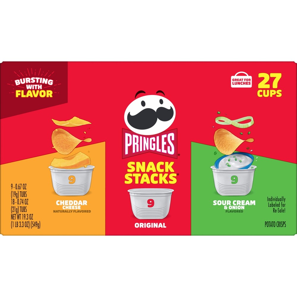 Enjoy a crispy, hearty, just-right potato taste in three delicious flavors. This assortment includes single-serve cups of original, cheddar cheese, and sour cream and onion chips. They're light, crispy, non-greasy, and full of salty flavor. These handy little cups are easy to take on the go. Create snack time on the go; grab one for an after-school pick-me-up or pack it for school lunches. Bring these portable snacks to game time and pack some for other Pringles fans. Keep this ready-to-go snack in your pantry or at your desk for a treat. Share this assortment at your next picnic or barbecue to add flavor and fun to your day with family and friends. Get your hands on Pringles and enjoy a tantalizing selection of flavors that will keep you coming back for more bite after bite. Pringles Assorted Potato Chips, Lunchtime Snack, 27-Count: Pringles Assorted Potato Chip Cups, Three Delicious Flavors: Cheddar, Original, and Sour Cream and Onion; Shelf-Stable Three flavors of stackable chips that are packed with mouthwatering goodness from rim to rim for a delicious treat. A delicious, non-greasy snack; Kosher certified; contains milk and wheat. Single-serve chip cups are perfect for school lunch boxes, backpacks, or tote bags; easy to take on the go. Contains one 19.3-ounce box with nine cups each of Sour Cream and Onion, Original, and Cheddar.
