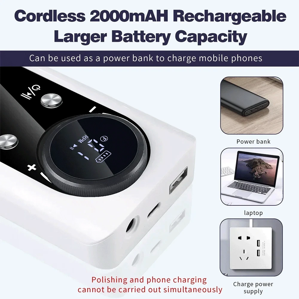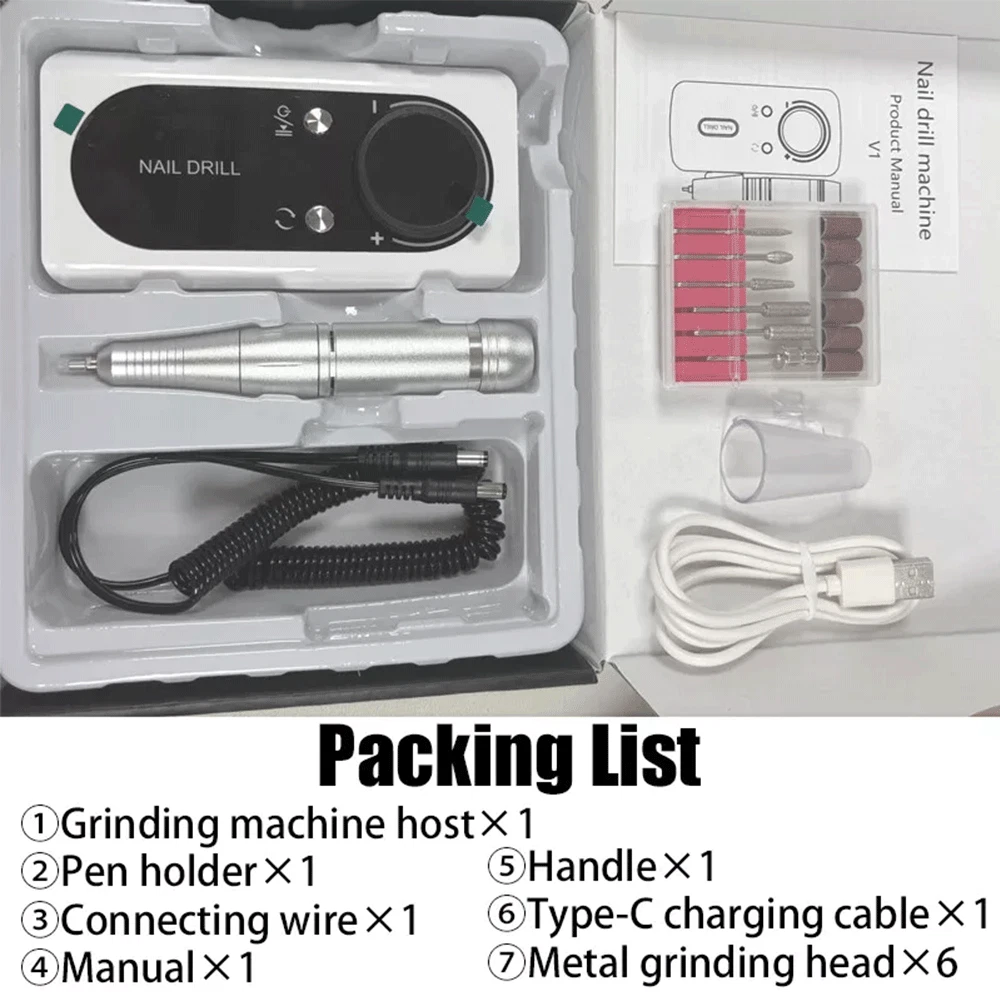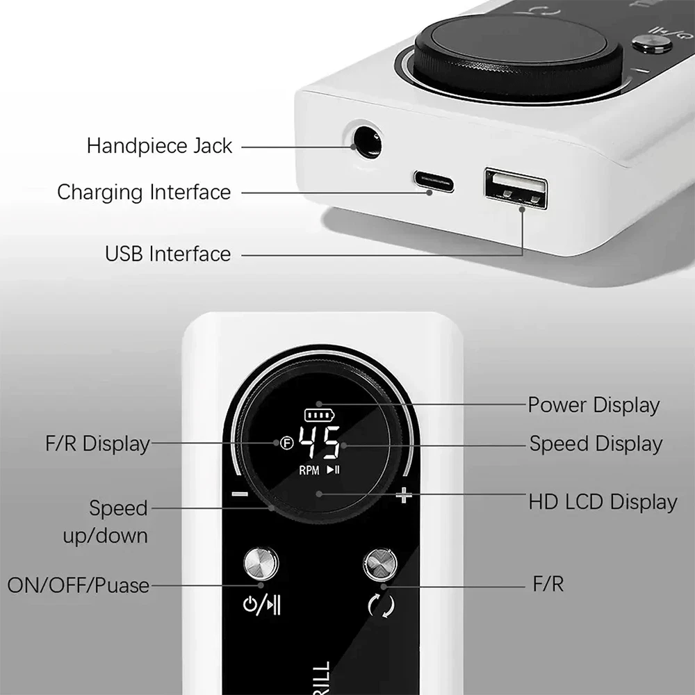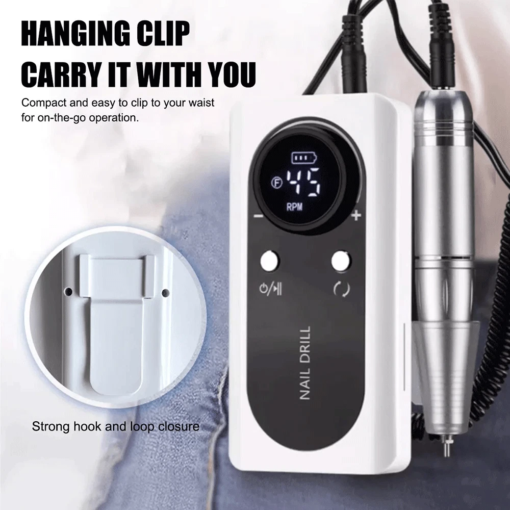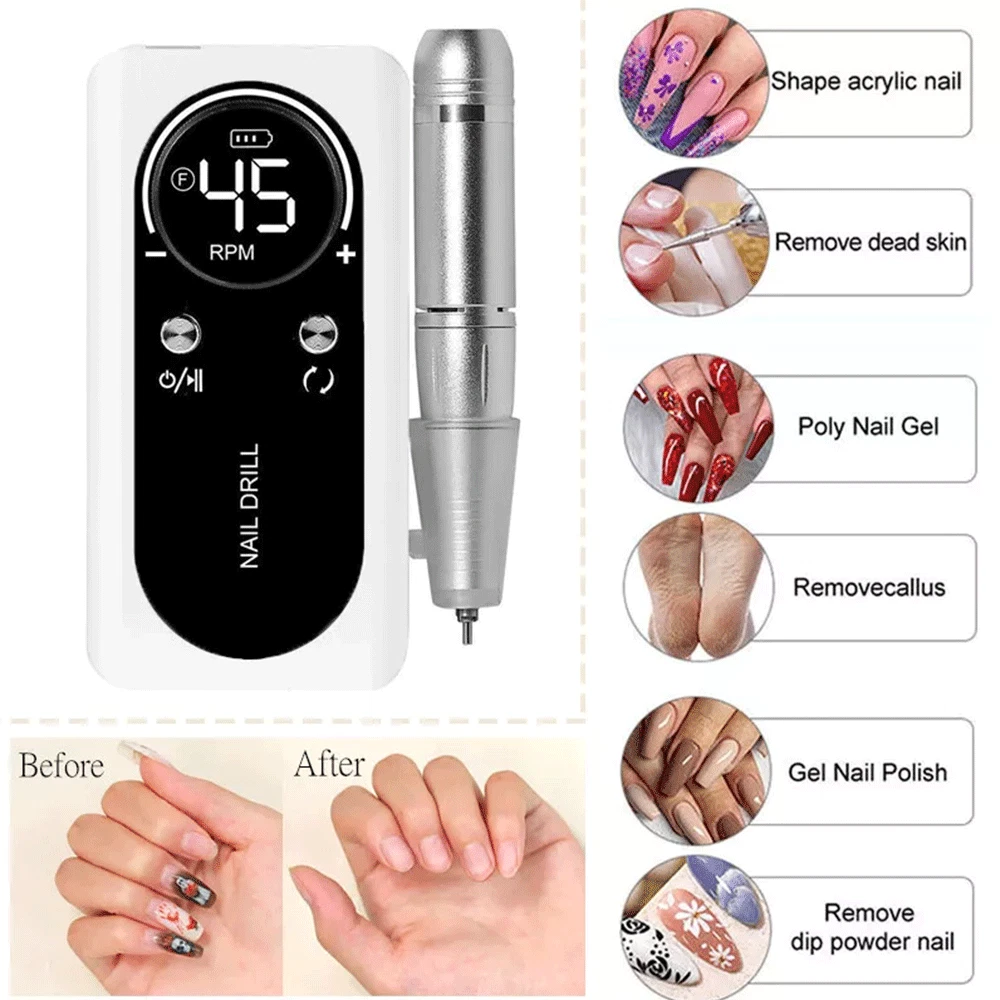 Description • High Speed of 45000RPM : The nail drill machine has a high speed of 45000RPM, making it perfect for filing and sanding nails quickly and efficiently. • Rechargeable Battery : The nail drill machine comes with a rechargeable battery, eliminating the need for frequent charging and making it more convenient to use. • Portable Design : The nail drill machine has a portable design, making it easy to carry around and use on-the-go, perfect for travel or at-home use. • Compatible with Gel Nails : The nail drill machine is compatible with gel nails, allowing users to file and sand their nails with ease, achieving a professional look at home. Note: When the host is charging, the number on the display must be "00" to charge the host, and the grinding pen and the host cannot be charged at the same time (because there is a protection program to avoid damage to the host) Specifications: Variable Speed: 0 - 45000RPM(adjustable) Battery capacity: 2600 mAh Charging Time: 3 hours Working Time: Up to 10 hours Bits Size: 3/32 inches Nail Drill Machine Size: 5.7 x 2.75 x 1 inches Box Size: 9 x 7 x 2.2 inches Input Voltage Range: AC100-240V / 50-60Hz Advantages: This new sander has a detachable back armor and can be placed flat directly on the table, unlike previous sanders. 【 High Quality & Aesthetically 】 45000RPM Electric nail drill is made of high-quality materials, and it is very textured in the hand. The design of colorful makes the nail drill look more beautiful and more advanced. [Max Speed 45000RPM] Rechargeable nail drill matched with power bank, full charge 3 hours can work up to 10 hours, the speed can be adjusted at 0-45000RPM, easier and safer for beginners use, the max speed is up to 45000PRM with a speed control button, which is great for acrylic nails. 【 Low Heat/Noise/Vibration 】 Nail drills for acrylic nails professional was designed with a brushless motor, aluminum alloy body, high-quality bearing and cooling system inside, which has good heat dissipation, works smoothly and makes the electric file low heat, low noise, and low vibration. 【 LCD Smart Screen 】 The LCD smart screen can display speed, rotation direction and remaining power clearly, so you can operate based on your needs, the mini pen-sized electric nail file can be held and carried easily anywhere, with forward/reverse direction, this electric nail drill is convenient for both left and right-handed people. 【 Portable Size 】 With a portable belt clip design at the small size power bank, this nail drill machine is more lightweight to allow you to hang it on your waist loop easily, which will not make your hands feel tired after long-term use. The nail filer electric is compact enough to pack into your bag or luggage to enjoy the nail art DIY anytime anywhere. 【 Multifunctional 】 Professional nail drill is packed with 6 nail drill bits and 6pcs sanding bands, meet your different needs, the acrylic nail drill can be used for grinding, cutting, polishing, acrylic powder, carving, and removing gel nail, cuticles and dead skin without hurting hands and nails. with different kinds of nail drill bits, you can quickly choose the desired nail drill bit, easy to use.