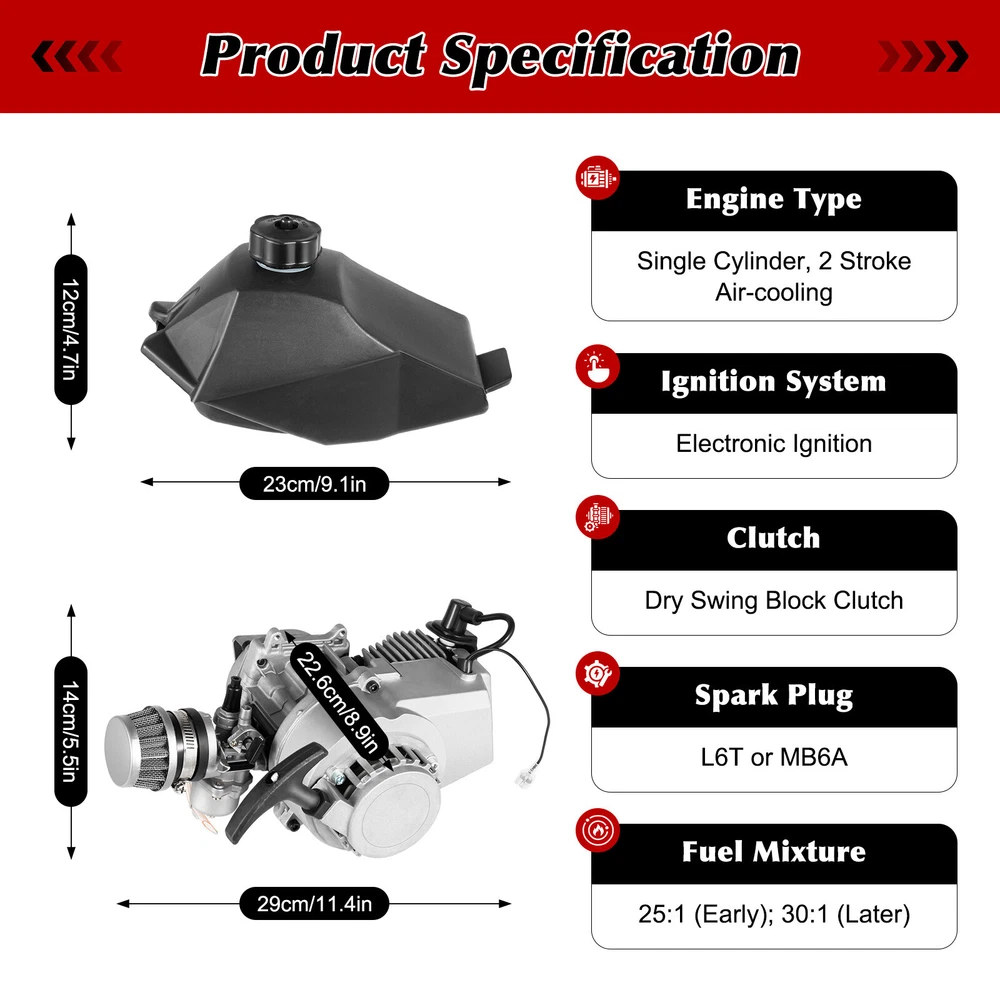 Specification Engine Type: Single Cylinder, 2 Stroke, Air-cooling Material: Aluminum Color: Silver, Black Ignition System: Electronic Ignition Start Mode: Pull Rope Start Shifting Way: Sprocket Clutch: Dry Swing Block Clutch Displacement: 49.85CC Max. Power: 1.9kw/7000rpm Rated Power: 1.7kw/6000rpm Continuous Power: 1.6kw/5500rpm Overload Power: 1.83kw/6500rpm No-load Speed: 12500rpm Max. Speed: 48km/h Max. Torque: 2.7N.M/6500rpm Max. Horsepower: 3PS Max. Load Capacity: 180kg/396.8lbs Min. Fuel Consumption: ≤610g/kW.h Spark Plug: L6T or MB6A Spark Plug Gap: 0.5mm/0.02in Bore * Stroke: Φ44*32.8mm/1.7*1.3in Carburetor Type: H117B Reduction Ratio: 1:1 Noise Level: 100.7dB (SPL); 116.9dB (SWL) Fuel Mixture (90# Gasoline : 2-stroke Engine Oil): 25:1 (Early); 30:1 (Later) Fuel Tank Capacity: 1.2 Pro 49cc Bike Bicycle Motor 2 Stroke Petrol Gas DIY Motor Engine Kit ATV Scooter Description This excellent 2-stroke bicycle engine kit is equipped with a powerful and efficient 0.32gal large-capacity fuel tank, providing sufficient endurance. This well-designed engine delivers powerful torque and excellent acceleration response, ensuring seamless driving in various environments while saving fuel consumption, and achieving a perfect balance between power performance and fuel economy. Whether it's for cross-country adventure enthusiasts or professional drivers, it's your ideal choice. Come and purchase this kit, and enjoy the peak of speed and passion! Key Features Durable Design: Designed with premium aluminum, this engine has high hardness, wear resistance, and corrosion resistance. So it can adapt to complex environments and conditions. Effective Cooling System: By adopting an air cooling system, the temperature of the engine can be quickly reduced, effectively preventing overheating and ensuring smooth and long-lasting driving. Powerful Engine: The 2-stroke engine can provide higher intake and exhaust efficiency, saving energy and fuel (Fuel Consumption: Min. ≤610g/kW.h). It can provide stronger power (Max. Power: 1.9kw/7000rpm) during driving and ensure that your drive will be very smooth and powerful. Easy to Operate: The engine features a electronic ignition system, which leads to higher energy and ignition efficiency. So you can start the engine quickly and safely. Large Capacity: Designed with a large capacity fuel tank (0.32 gal), this engine can work for a long time and meet the needs of long-distance driving (15-20km with full oil). It ensures reliable performance without frequent refilling. Outstanding Performance: With its outstanding performance parameters, this well-designed engine can reach a Max. speed of 48km/h. In addition, it has extraordinary load-bearing capacity (396.8 lbs), adapting to the various needs of different groups of people, and ensuring excellent power performance in any situation. User-friendly Design: Compared to other engine kits, this one has the upgraded CVT gearbox, which effectively improves the operational efficiency and response speed of the entire system. It is also equipped with a stable bearing to ensure its operation process smoothly. Protective Shipping: Our product comes with protective pearl cotton to prevent any damage during transportation, ensuring that it arrives in perfect condition. Satisfaction Guarantee: No matter what problem you encounter or have any questions, please contact us. We will reply and solve the problem for you as soon as possible. Details Practical Carburetor: It is equipped with a carburetor, which can mix oil and gas evenly. Air Filter: It is equipped with an air filter, which can effectively prevent impurities from entering the cylinder. Pull Rope Start: Compared to electric starting, the rope starting engine has a simpler structure and more convenient operation. Application It is fit for 49cc 2-stroke pocket bike, mini dirt bike, beach bike, ATV or scooter. Specification Engine Type: Single Cylinder, 2 Stroke, Air-cooling Material: Aluminum Color: Silver, Black Ignition System: Electronic Ignition Start Mode: Pull Rope Start Shifting Way: Sprocket Clutch: Dry Swing Block Clutch Displacement: 49.85CC Max. Power: 1.9kw/7000rpm Rated Power: 1.7kw/6000rpm Continuous Power: 1.6kw/5500rpm Overload Power: 1.83kw/6500rpm No-load Speed: 12500rpm Max. Speed: 48km/h Max. Torque: 2.7N.M/6500rpm Max. Horsepower: 3PS Max. Load Capacity: 180kg/396.8lbs Min. Fuel Consumption: ≤610g/kW.h Spark Plug: L6T or MB6A Spark Plug Gap: 0.5mm/0.02in Bore * Stroke: Φ44*32.8mm/1.7*1.3in Carburetor Type: H117B Reduction Ratio: 1:1 Noise Level: 100.7dB (SPL); 116.9dB (SWL) Fuel Mixture (90# Gasoline : 2-stroke Engine Oil): 25:1 (Early); 30:1 (Later) Fuel Tank Capacity: 1.2L/0.32gal Fuel Tank Size: 23*12*12cm/9.1*4.7*4.7in Engine Dimensions: 29*14*22.6cm/11.4*5.5*8.9in Package Size: 34*21*23.5cm/13.4*8.3*9.3in Net Weight: 3.85kg/lbs Gross Weight: 4.3kg/lbs Package Included 1* Engine 1* 25H-136L Chain 1* Kill Switch 1* Throttle Grip 1* Left Grip Cover 1* Fuel Tank 1* Throttle Cable Other Accessories for Installation Notes Please check the parameters carefully before making payment. Please allow the slight color difference caused by the shooting light and 1-3cm error due to manual measurement, and make sure you do not mind before ordering. Payment Delivery details Terms of sales About us Contact us Payment We accept ebay payment 。 Fees such as import duties, taxes are not included in the item price or shipping costs. These charges are the buyer's responsibility. Delivery details Shipping: 2-9 working days to: USA Terms of sales We maintain high standards of excellence and strive for hundred percent customer satisfaction. Feedback is very important to us. We hope that you contact us immediately before you give neutral or negative feedback, so that we can address your concerns. It is impossible to address issues if we do not know about them! About us Your satis faction is our ultimate goal. We work hard to earn your trust and future business. Our certi