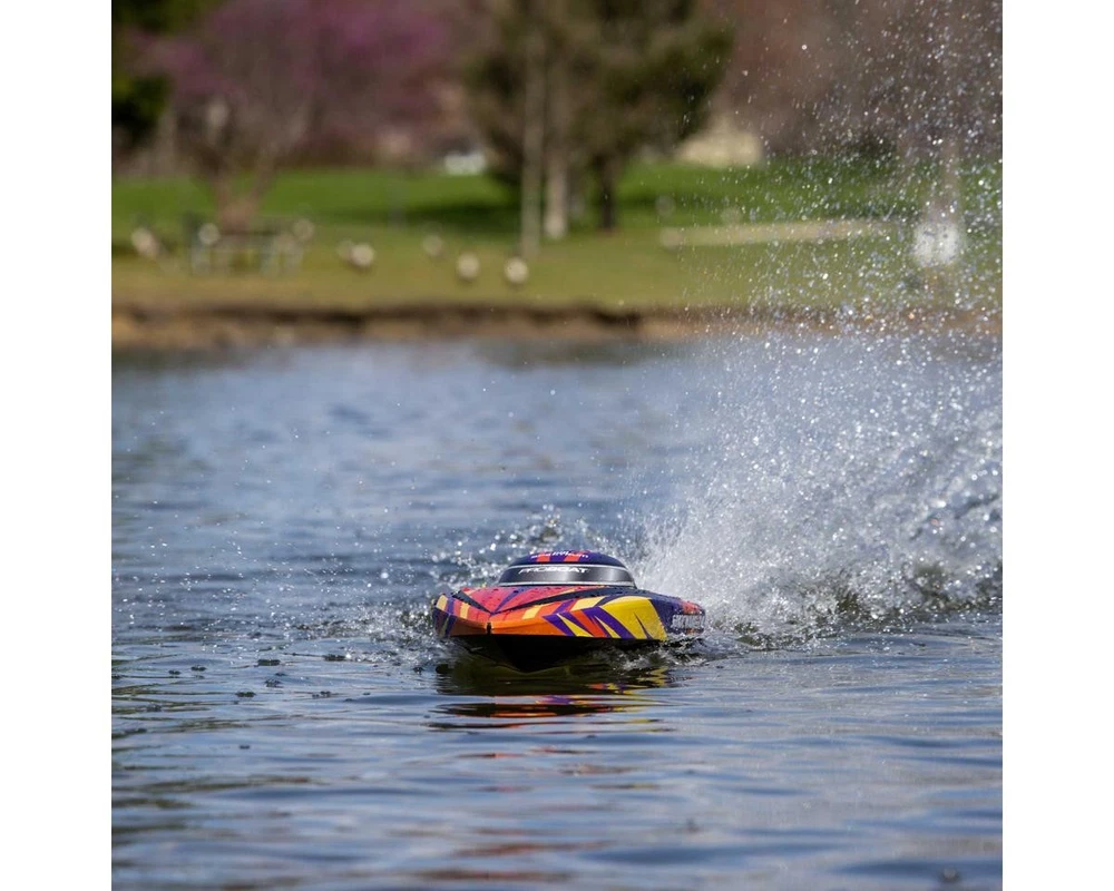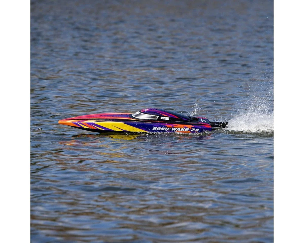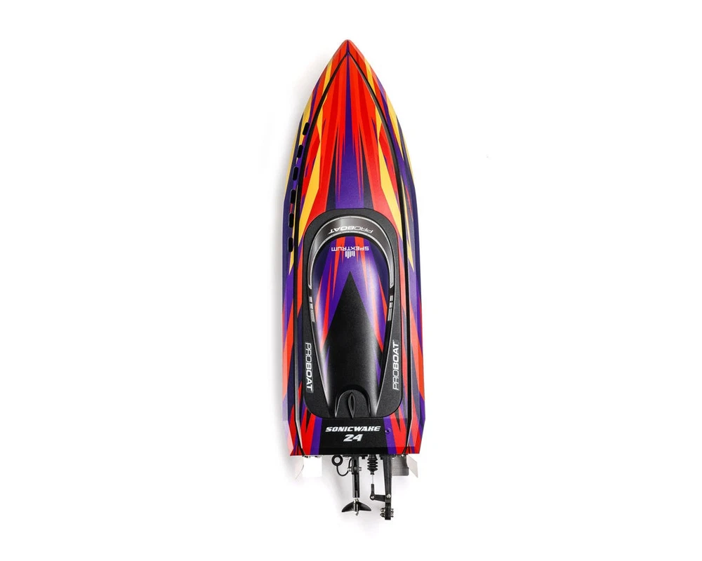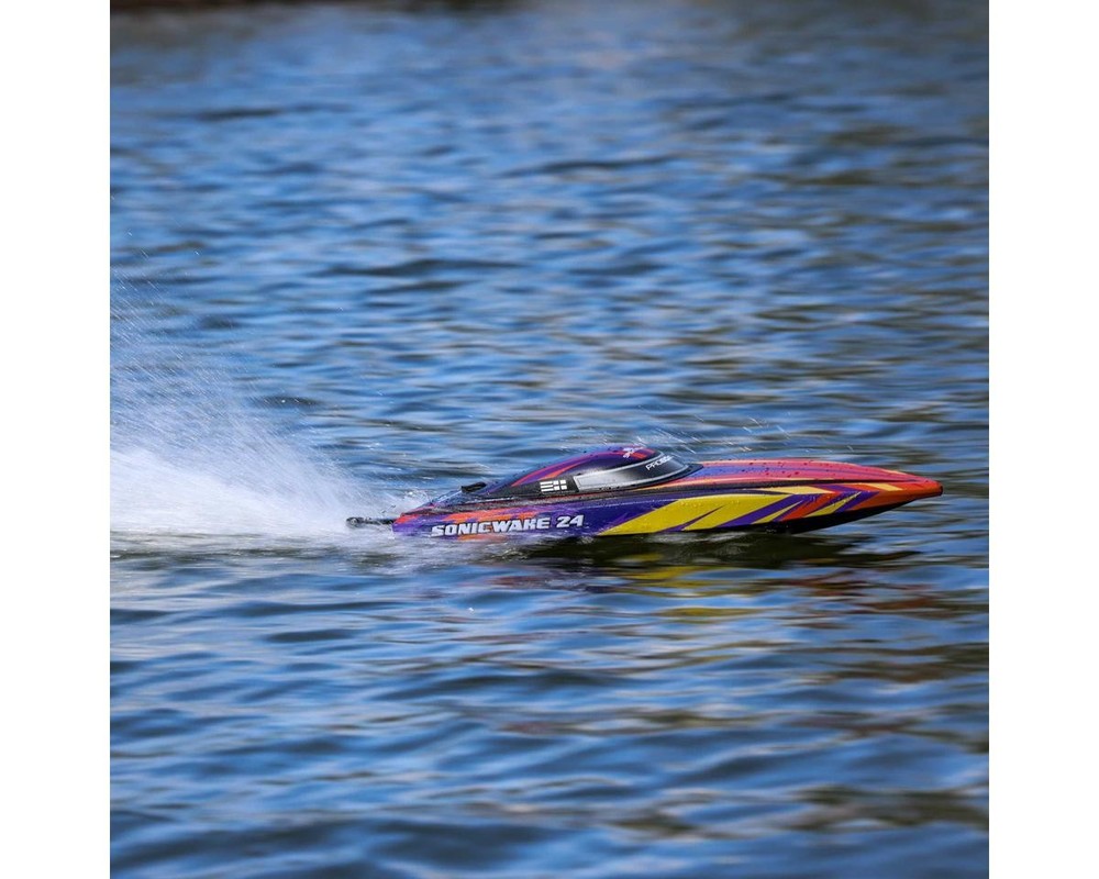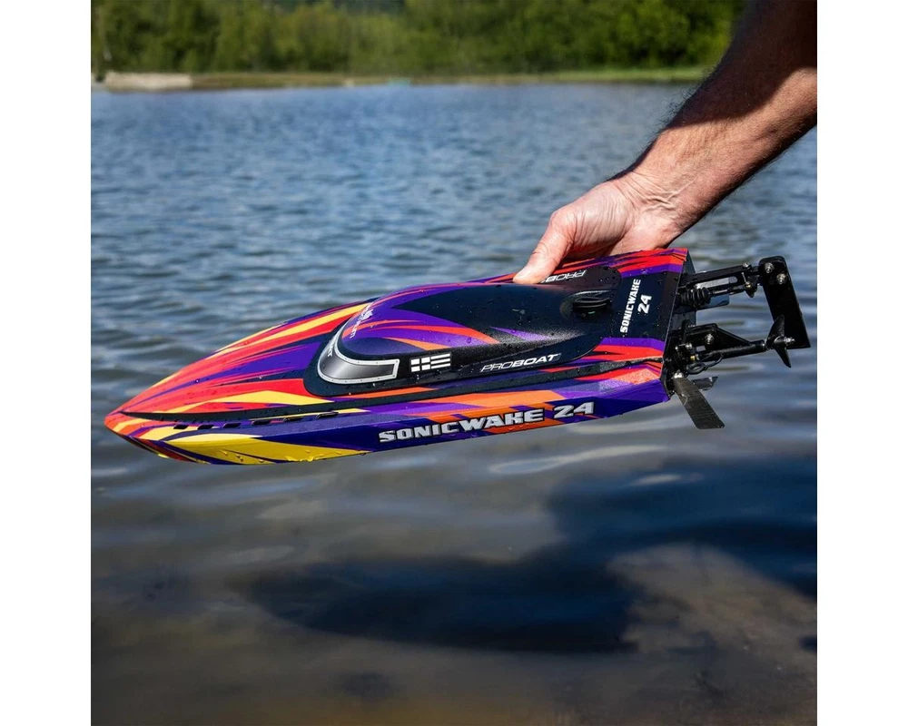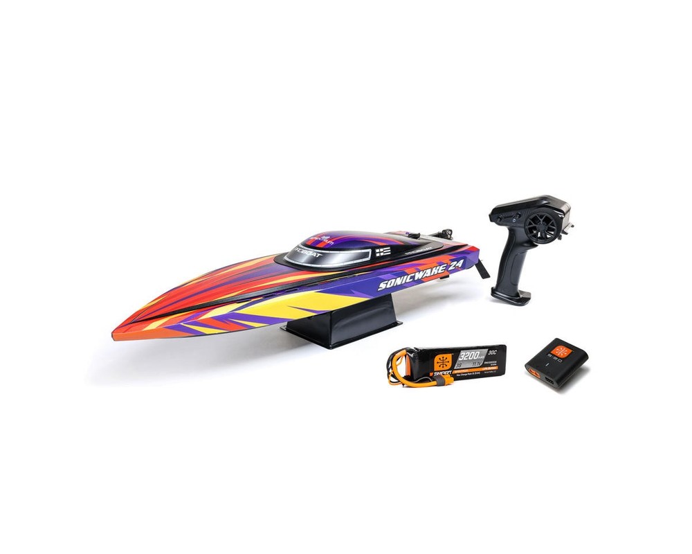Ready-to-Run Boat with Extreme Brushless Performance Take your RC boating to the next level with the Pro Boat Sonicwake 24" Self-Righting RTR Deep-V Brushless Boat. With thrilling speeds, beginner-friendly features, and a compact size perfect for small ponds or park lakes, this boat blends performance and convenience in a ready-to-run design. Whether you're just getting started in the hobby or are an experienced boater looking for a fast, durable, and easy-to-use model, the Sonicwake 24" delivers serious fun without the need for extra gear or complicated setup. Just charge the battery, add water, and you're ready to rip! About the Sonicwake 24" Boat Powerful Brushless Performance At the heart of the Sonicwake 24" is a factory-installed Spektrum brushless power system built for excitement. The combination of a Spektrum 3542 2500kV Brushless Outrunner Marine Motor and a 50A ESC produces extreme top speeds, making it fast enough to leave a wake behind and get your adrenaline going. Designed with performance in mind, the deep-V hull easily cuts through chop and maintains stability at high speeds, even in rougher water conditions. A Pro Boat servo delivers strong, precise steering for confident control, while the SLT2 2-channel 2.4GHz radio system ensures a responsive connection with minimal interference. Self-Righting Convenience The Sonicwake 24" takes the fear out of flipping with its built-in self-righting hull design. If the boat overturns, it automatically flips itself back upright within seconds, so you won't be stuck retrieving it from the water. This makes it a great choice for less experienced RC boaters, while also allowing seasoned users to push it hard without hesitation. The boat's injection-molded ABS hull and canopy are built to take on hits from rocks or debris, and a breakaway rudder helps prevent damage by swinging away on impact rather than snapping off. Simply push it back in place and continue racing. Smart Battery & Charging System Included with the Sonicwake 24" is a Spektrum 3S 3200mAh 30C Smart LiPo Battery that delivers ample power for high-speed runs, along with an S120 USB-C Smart charger for quick, safe recharging. Just plug the charger into a USB port, connect the battery, and the Smart technology handles the rest. The boat features Pro Boat's SSL (Strap, Slide, Lock) battery system, which makes installing or removing the battery tool-free and hassle-free. Combined, this system offers incredible ease of use and ensures that your boating time is focused on fun, not frustration. Features: Self-righting deep-V hull design for worry-free operation Factory-installed brushless power system capable of thrilling speeds Streamlined molded ABS hull with double-sealed canopy Breakaway rudder swings back on impact to prevent damage High-torque water-resistant steering servo for precise control Spektrum SLT2 2.4GHz radio system with interference-free operation Spektrum Smart-compatible electronics for safer, more efficient charging SSL battery mounting system for quick, tool-free changes Balanced hull size ideal for ponds, small lakes, and tighter spaces Pre-trimmed, ready-to-run setup requiring no assembly or tuning Includes: (1) Sonicwake 24" Self-Righting RTR Deep-V Brushless Boat (1) Pre-Installed Spektrum 3542 2500Kv Brushless Outrunner Marine Motor (1) Pre-Installed Spektrum 50A Smart Brushless Marine ESC w/IC3 Connector (1) Pre-Installed Pro Boat 5.3kg Analog Standard Servo (4.8-6V) (1) Pre-Installed Spektrum SR215 DSMR 2-Channel Sport Receiver (1) Spektrum 3S 3200mAh 30C Smart LiPo Battery (11.1V) w/IC3 Connector (1) Spektrum S120 USB-C Smart Battery Charger (1) Spektrum SLT2 2-Channel 2.4GHz Radio Transmitter (1) Boat Stand (4) AA Batteries for Transmitter Product Manual Needed To Complete: Nothing! Everything you need is included. Specifications: Scale Standard Hull Type V-Hull Power Source 3S LiPo (11.1V) Motor Type Brushless Length 24in (610mm) Width 7.09in (180mm) Height 4.3in (109mm) Weight 45.6oz (1292.74g) Material Injection Molded ABS Completion Level RTR* *Tech Note: Ready-to-Run models come equipped with all electronics and include the transmitter needed for use. Please check the "Needed To Complete" above to make sure you have everything you need to get out and enjoy your RC model. Manuals: User Manual About Us | View Store