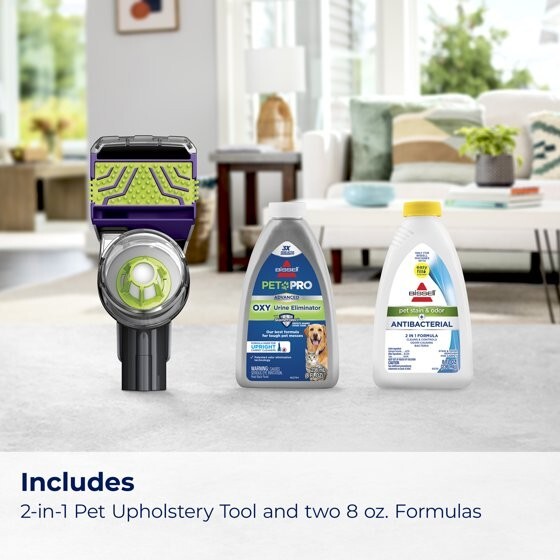 We know pets make messes. Whether it's tracked-in mud or bathroom accidents, BISSELL® ProHeat 2X® Revolution® Pet Pro Advanced Upright Carpet Cleaner is built to handle those messes — and more — with ease only weighing 18 lbs. This machine includes our energy efficient TurboStrength™ Motor Technology that delivers powerful suction and a quiet clean. Plus, with CleanShot® pretreater, you can penetrate tough spots and stains. Additionally, the ProHeat 2X® Revolution® Pet Pro Advanced carpet cleaner comes with 3 different cleaning modes: MAX Clean Mode to remove embedded dirt, stains and allergens, Deep Clean Mode for tough stains and spills, and Express Clean Mode to dry your carpets in about 30 minutes.* Heatwave Technology® helps maintain the water temperature throughout cleaning. Plus, each machine comes with an EZ 1PC Cleanup Removable Brush Roll Cover to make the clean up after the clean quick and easy. Each box comes with: the 2-in-1 Pet Upholstery Tool, a trial size of BISSELL® ADVANCED PET PRO OXY Urine Eliminator formula, and a trial size of BISSELL® Pet Stain & Odor + Antibacterial formula in fresh scents. All of this cleaning power comes in a lightweight and maneuverable machine with a low-profile foot that easily gets under furniture. But this machine doesn't just pick up after pets, it helps save them, too. BISSELL proudly supports BISSELL Pet Foundation® and its mission to help save homeless pets. When you buy a BISSELL® product, you help save pets. We’re proud to design products that help make pet messes, odors and pet homelessness disappear. *Express Clean Mode (reference instruction in user guide). Tested on new carpet with protectant. Results may vary. OUR BEST CARPET CLEANING SYSTEM.* Removes the toughest pet stains & odors — including skunk odors. TURBOSTRENGTH™ MOTOR TECHNOLOGY. Delivers 40% stronger suction and 50% more quiet with an energry efficient clean. ATTACKS TOUGH SPOTS & STAINS. The CleanShot® pretreater delivers a concentrated stream of cleaning solution right where you need it. 3 MODES OF CLEANING. MAX Clean Mode delivers professional grade cleaning to remove deep down embedded stains, dirt and odors while EXPRESS Clean Mode delivers dry carpets in about 30 minutes.* EZ CLEANUP BRUSH ROLL COVER. Easily clean the Dual DirtLifter® Power Brushes with the removable 1-piece brush roll cover. HEATWAVE TECHNOLOGY®. Helps maintain the water temperature during the clean. LIGHTWEIGHT DESIGN. Weighs less than 18 pounds with a Low-Profile Foot so it's easy to maneuver around furniture. 2-IN-1 PET UPHOLSTERY TOOL. Removes pet hair, stains and odors from upholstery and more. FORMULAS INCLUDED. BISSELL® Pet Stain & Odor + ANTIBACTERIAL Formula eliminates more than 90% of odor-causing bacteria and BISSELL® ADVANCED PET PRO OXY Urine Eliminator removes tough stains with the power of OXY. Keep your carpets looking and smelling clean and fresh. EVERY PURCHASE SAVES PETS™. BISSELL proudly supports BISSELL Pet Foundation® and its mission to help save homeless pets. *Express Clean Mode (reference instruction in user guide). Tested on new carpet with protectant. Results may vary. *Stain and odor removal system includes ADVANCED PET PRO OXY Urine Eliminator formula, 2-in-1 upholstery tool, CleanShot® Pretreater, EZ Clean Brush Roll Cover.