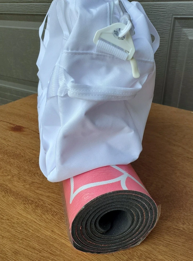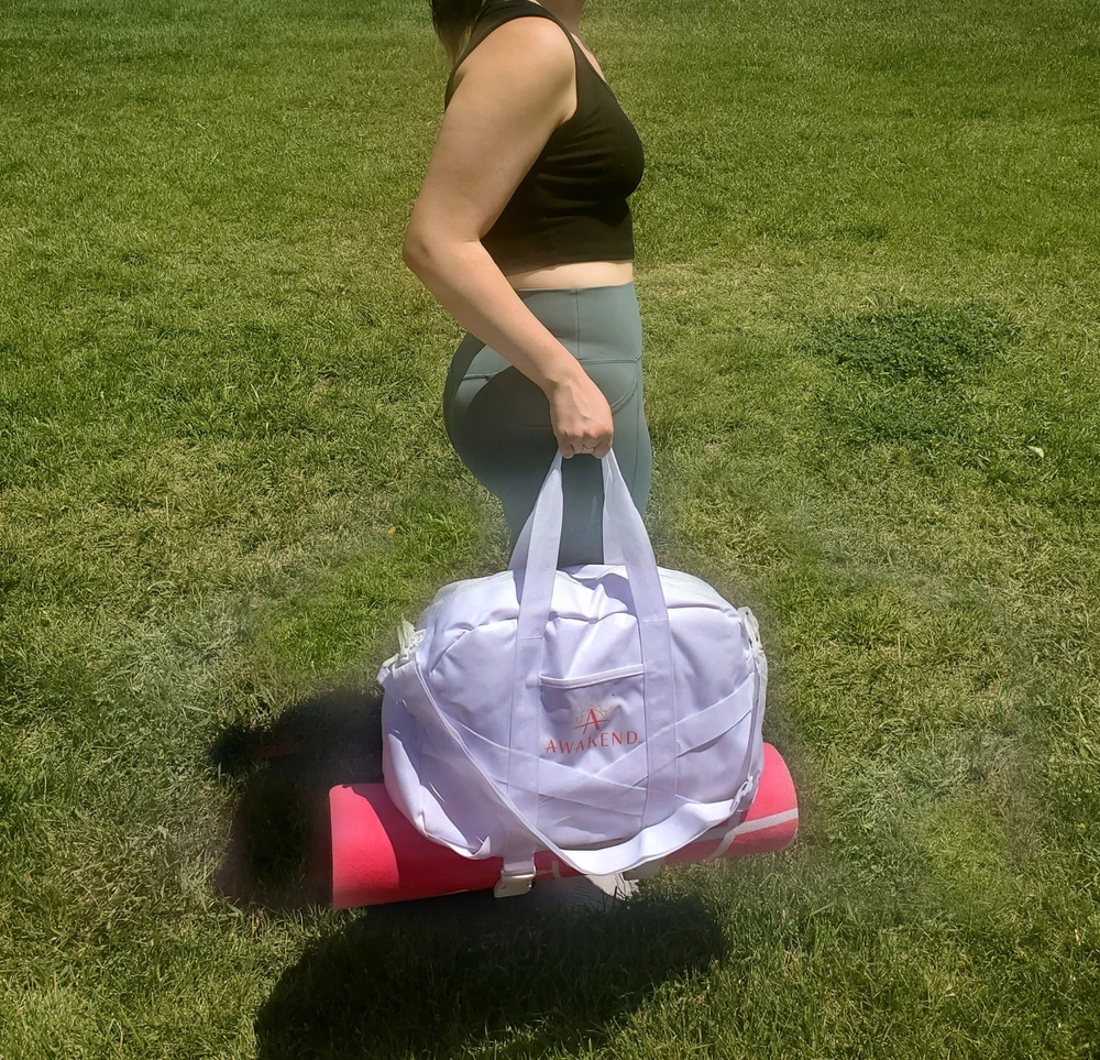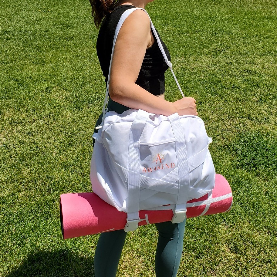 All items are NEW and branded with “Awakened”. This is a professional yoga mat, not the cheapfoam mats purchased at big box stores. The mat measures 68” long x 24” wide and the surface has a softmicrofiber texture. The duffle baghas a large zip opening and offers easy access to items while adjustable strapshold the yoga mat in place. Bag dimensions: 19” long x 8” wide x 13” tall.Strap length when fully extended: 50” Volume: 40L. Carry it by the handles oracross the body with the detachable strap. Interior pocket for your small itemsor cell phone. Also includedis a 20oz glass water bottle covered in a silicone wrap and a bamboo top.Bottle measures 9.5” tall. The journal measures 7” wide x 10” tall and comeswith a pen.