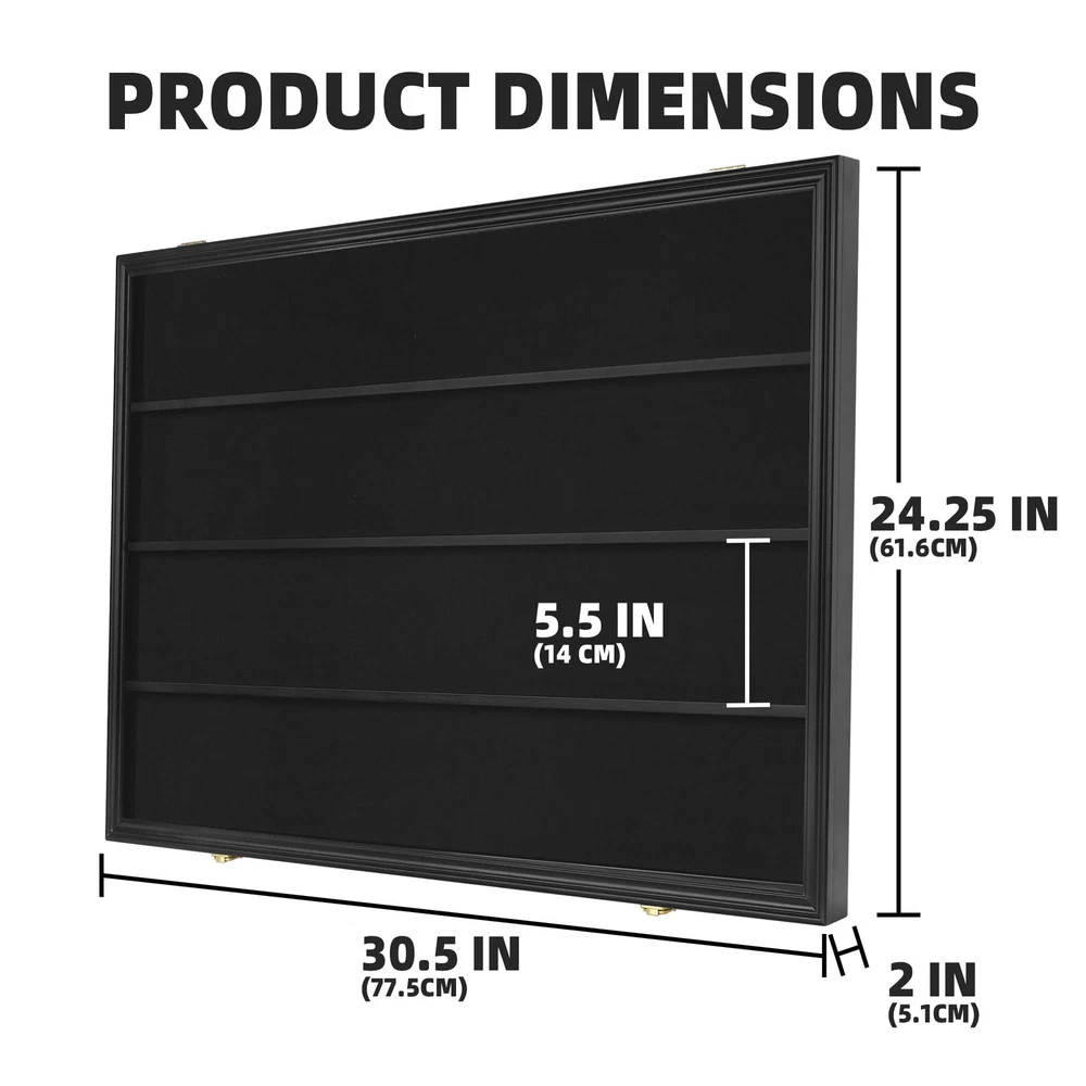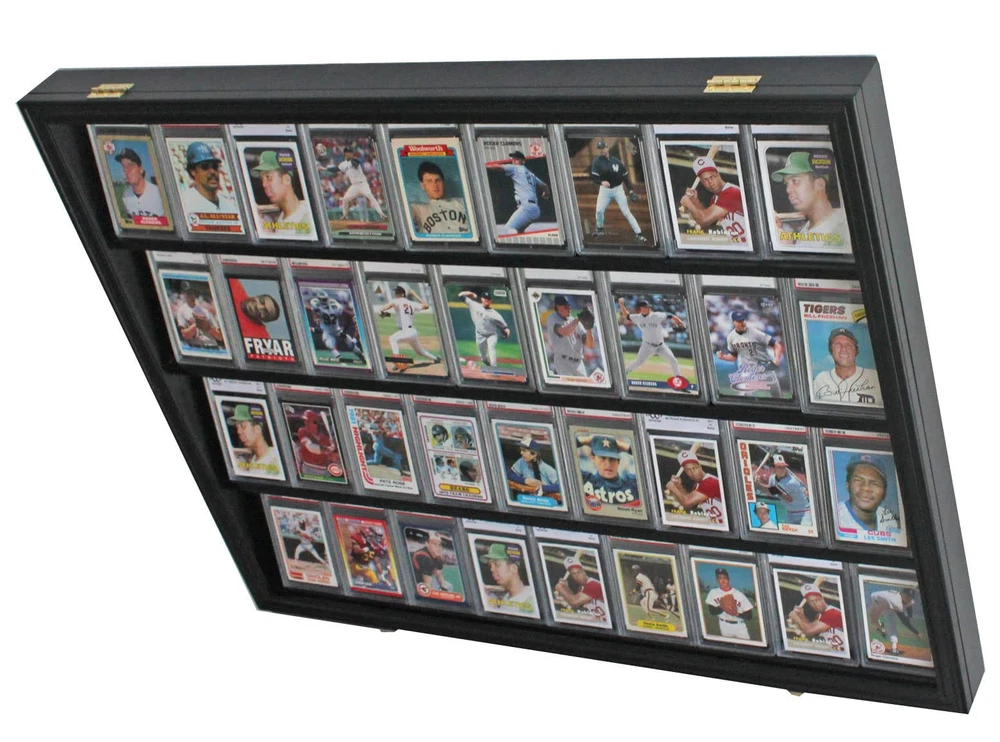 Black Finish. Cards NOT Included. Collector's choice display case for sports graded cards graded/ungraded up to 5.5" tall. . Please measure cards to make sure they are no more than 5.5" height. So, this would only fits graded Professional football, basketball, baseball, hockey trading cards in plastic cases that are no taller than 5.5". You can display 36 graded cards or 48 hard sleelves total. Dimensions: 30.5" W X 24.25" H X 2"D, baseball card display case is made of Grade A+ acrylic, with 96% transparency, 98% UV protection. It will protect the cards to fade while providing very transparent view for the best showing of the cards. The lockable anti-theft locks keep your sports cards memorabilia or collectibles from inquisitive hands. Metal brackets are already installed on the back for hanging. Wall hooks included. While this would be of great use if you are a card collector it can also be a great unique gift for someone who collects sports trading cards are an hobby.