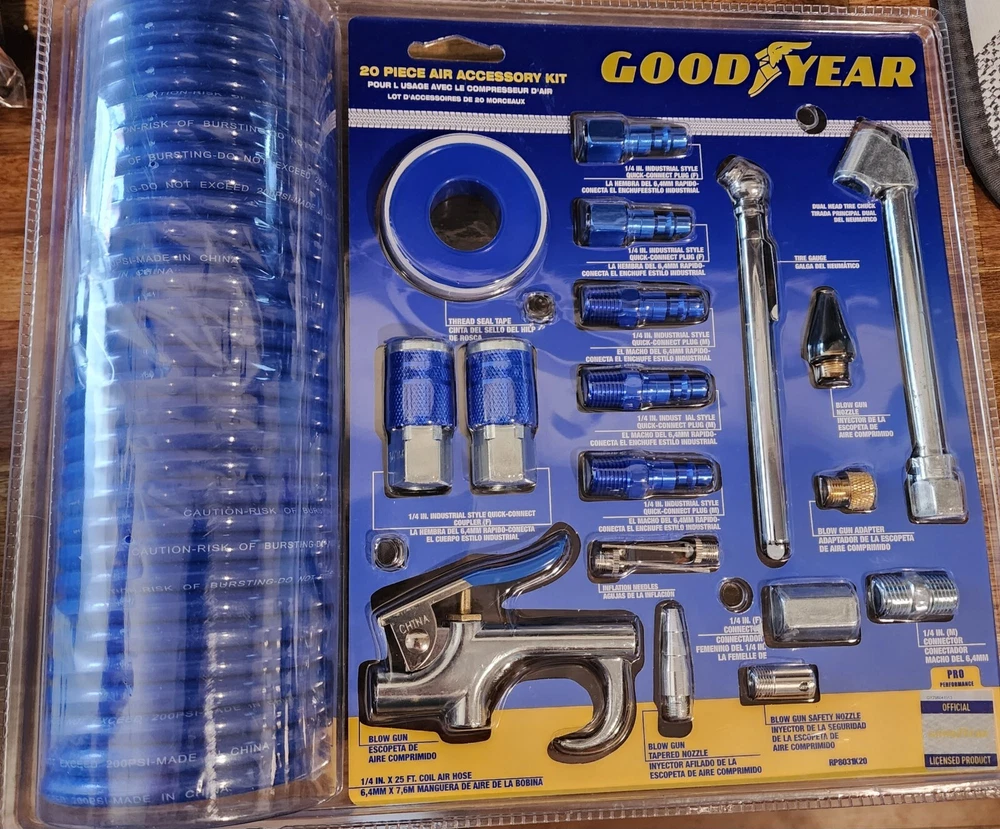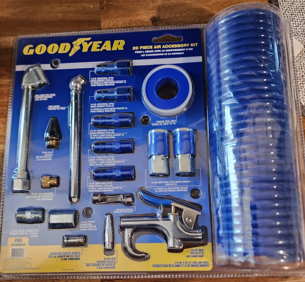 Introducing the Pro-Performance Good Year 20 piece air compressor accessory kit, an essential set for your air tools collection. This kit includes 20 durable tools, all crafted with precision to provide the best performance and long-lasting service. The kit is manufactured in China and is covered by a lifetime manufacturer warranty. The kit's blue color adds a stylish touch to the tools. This set is perfect for anyone who needs a reliable and efficient air compressor accessory kit. Get yours today!