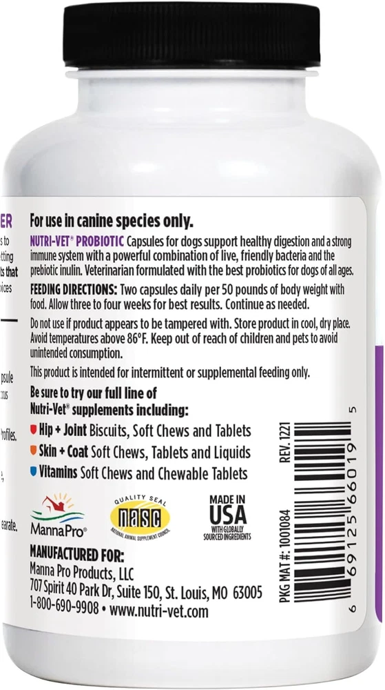 DOG DIGESTIVE SUPPORT - Discover Nutri-Vet Probiotics Capsules for Dogs; Specifically designed to balance good and bad bacteria, these probiotics for dogs support your dog's digestive health, making it a must have for your pet care arsenal INULIN -INFUSED IMMUNITY BOOST - Empower your dog's immune system with prebiotic inulin in our dog probiotics; This potent ingredient fosters the growth of good bacteria which helps promote a healthy immune system NITRITE REDUCE - Our capsules contain Streptococcus to minimize nitrites; Each bottle offers 60 capsules of digestive probiotics for dogs, blended for optimal gut health; It's the daily dose of wellness your dog deserves VETERINARIAN FORMULATED - Crafted with care by professionals, our pet probiotics for dogs are formulated by experienced veterinarians; Made with your pet in mind, our dog supplements ensure quality and safety for your dog MADE IN THE USA - Proudly made in the USA with premium globally sourced ingredients, our capsules carry the National Animal Supplement (NASC) quality seal; We offer dog gut health probiotics that are more than just effective, they're a symbol of quality, love, and care Nutri-Vet Probiotics capsules for dogs combine multiple, live, “friendly” bacteria with the prebiotic inulin, a natural ingredient that beneficially stimulates the growth of good bacteria. This powerful combination helps support a strong immune system and promote vitality in dogs of all ages.