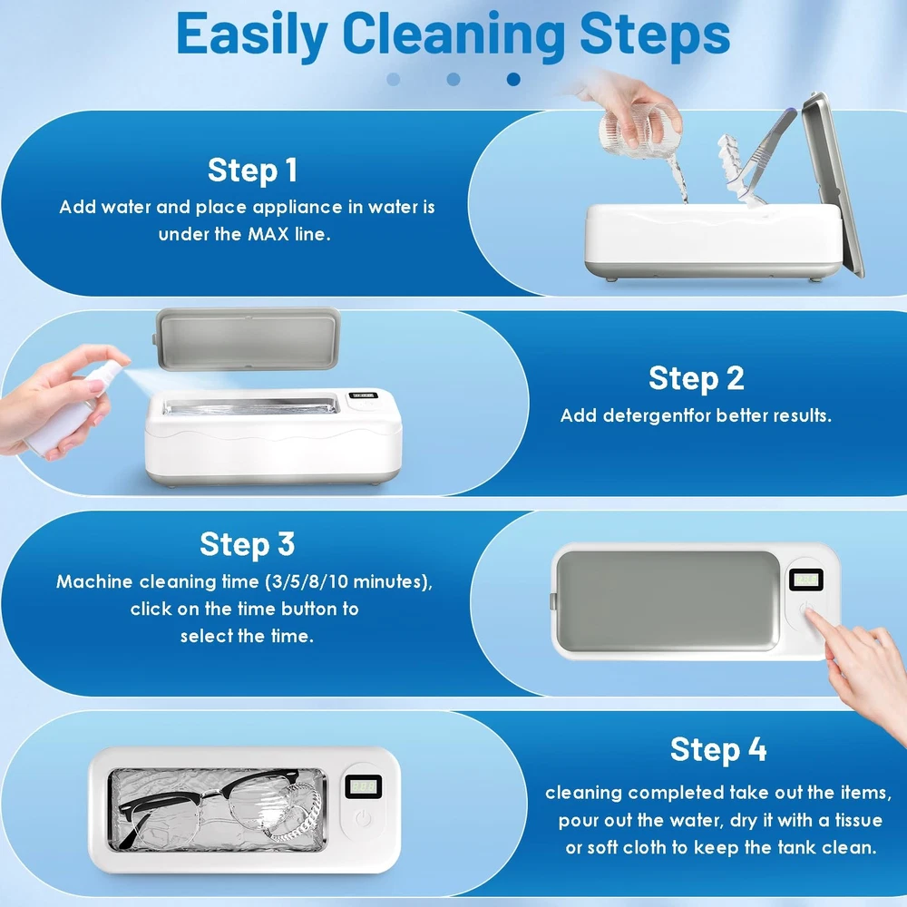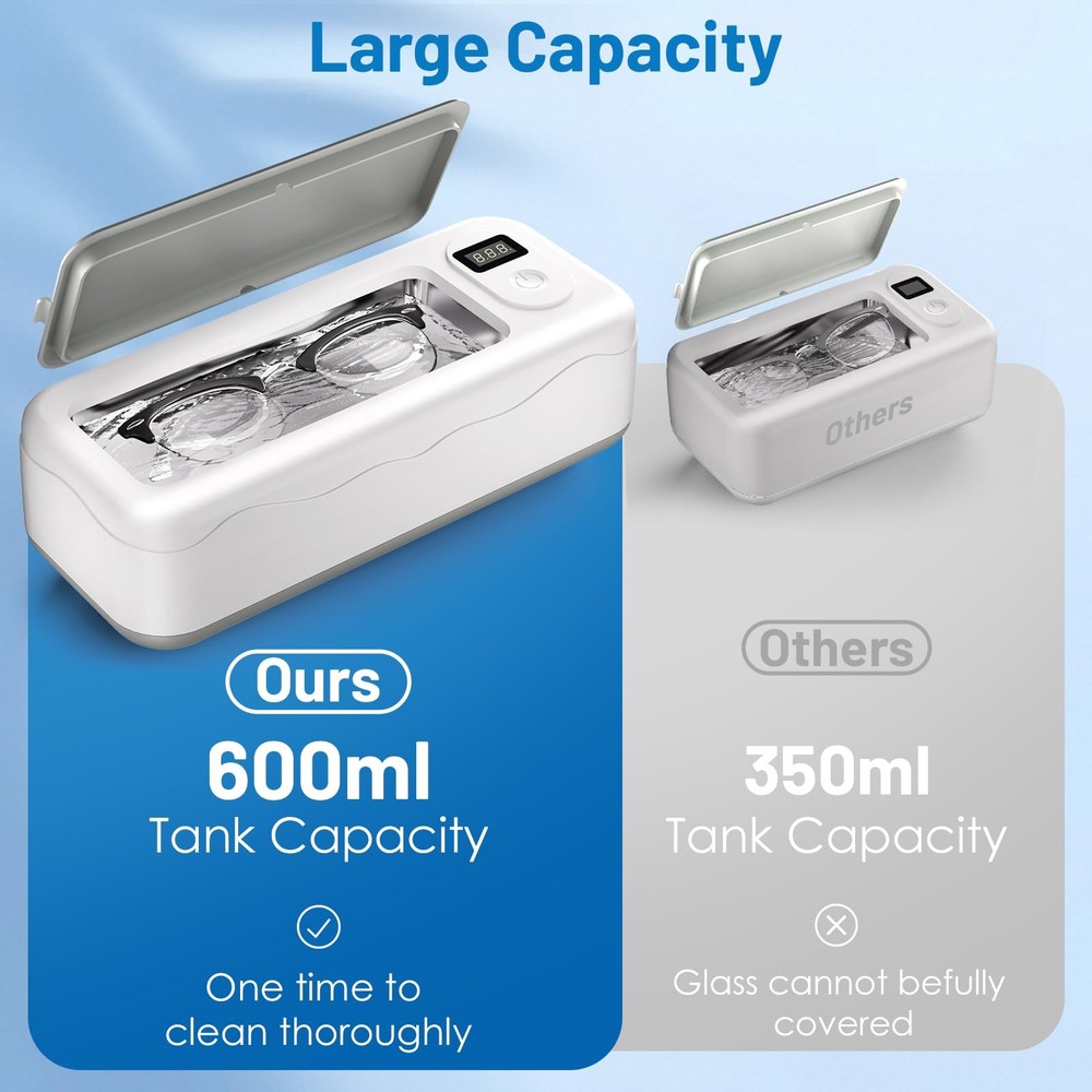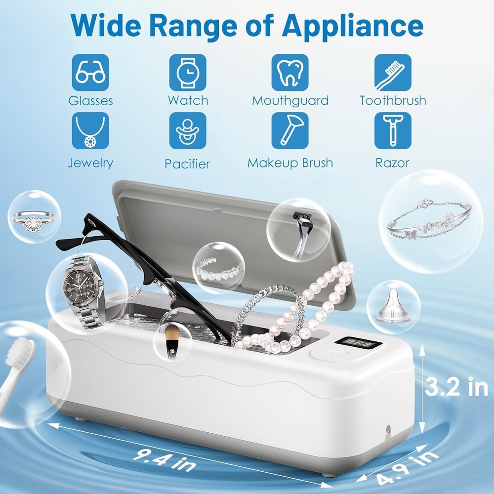 Ultrasonic Jewelry Cleaner 💎Professional-Grade Ultrasonic Cleaning Power-- Our engineered reliable, high-frequency ultrasonic jewelry cleaner delivers professional results at home. The 45,000Hz ultrasonic waves generate millions of microbubbles to deep clean hidden dirt and grime—no scrubbing needed. 🏠 For Home & Professional Use-- Refresh your valuables in minutes. This ultrasonic cleaner safely restores shine to rings, earrings, silver necklaces, eyeglasses, watch bands, dentures, coins, tools, and more. (Note: Do not remove tarnish.) 🌀 4 Cleaning Modes with Digital Display-- Choose from four preset cleaning cycles—180s, 360s, 480s, and 600s—at the touch of a button. The LED display shows real-time progress, and the built-in degas function enhances performance by eliminating trapped air. 📦 Large 20oz Stainless Steel Tank-- Built to handle more items in one go, the 600ml tank is made of durable 304 stainless steel, offering excellent resistance to corrosion and wear. Includes a watch holder for added convenience. 🔇 Low-Noise, Safe, and Easy to Use-- It is designed with four anti-slip feet to stay firmly in place and reduce vibration noise. The automatic shut-off and user-friendly one-touch control make it effortless to operate—even for first-time users.