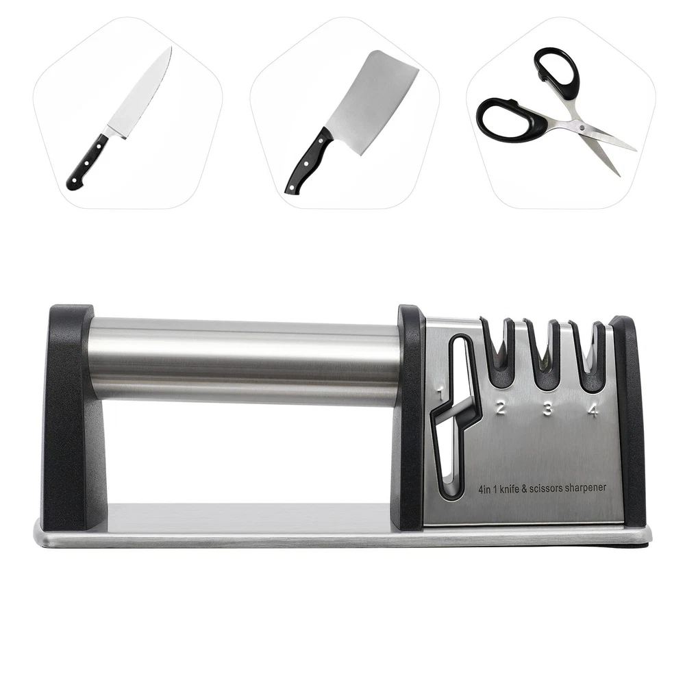 4 Stage Knife Sharpener Professional Ceramic Tungsten Kitchen Sharpening Tool Description The wear and tear of knives is inevitable, but fortunately, with this knit sharpener, you can easily sharpen them again! Four different sharpening slots can meet your various needs, keeping your kitchen free of dull knives for a more enjoyable cooking experience! Key Features 4-in-1 Function: Four different precision and material grinding slots allow it to adapt to more knives and even scissors. Tungsten steel, diamond, and ceramic can be distinguished into three gears: coarse, medium, and fine. The dedicated scissor groove is suitable for the daily sharpening of scissors, making the sharpening process more effective and labor-saving. Selected Material: It is mainly made of sturdy and durable food-grade stainless steel and ABS, allowing you to rest assured that it comes into contact with the knives. Selected tungsten steel, diamond, and ceramic sharpening stone allow you to quickly polish your knives and scissors. Easy to Use: The ergonomical round handle is both suitable for right- and left-handed users to hold comfortably with one hand. The large spacing allows you to easily align the knife with the grinding slot, and the one-way backward pull operation is simple and labor-saving. High Stability: The large PVC anti-slip pad at the bottom can increase the friction between the base and the table, making it stand more stable and less prone to shaking or falling during use, and also protecting the table from scratches. It helps you maintain good posture when using it while also protecting you from injuries caused by sliding when sharpening your knife. Shiny Appearance: The wire drawing process makes it more shiny and less prone to scratches, ensuring aesthetics and practicality. Easy to Clean: Its surface is smooth and not prone to dust or water stains. After sharpening the knife, you can clean it with a soft bristle brush or rinse it with running water then wipe it dry with a dry towel. Convenient Storage: This small (8.66 * 2.6 * 3.07in) and lightweight (0.64 lbs) knife sharpener can be easily stored in the kitchen drawer without taking up too much space. Buy with Confidence: We have been working hard to provide better service and quality for our customers, which is our goal. If there is any problem with our products, please contact us in time. Details V-shaped Groove: The V-shaped groove is designed to keep the knife stable so that you can pull the blade through even pressure. Round Corners: Its edges have been rounded to prevent scratches during use. Smooth Surface: Our knife sharper with fine processes has a smooth and burr-free surface that can better care for your skin, improving you with a compatible user experience. Application It can be used to polish chef knives, kitchen knives, bone cutters, fruit knives, scissors, bayonets, hunting knives, pocket knives or any other non-serrated blades, etc. to improve the sharpness of the knife. How to Use Place the knife into the corresponding grinding hole, keeping it perpendicular to the countertop. Hold the handle of the sharpener with one hand, and press it down with appropriate force with the other hand. Repeat pulling the knife back several times. Grinding the blade tip: When the curved part of the blade passes through the blade groove, the handle should be slightly raised and the blade tip inserted into the blade groove. The larger the curvature of the blade, the more it is necessary to lift the handle. Grinding scissors: Open the scissors and insert them into the grinding groove. Then clamp the polishing rod with the scissors blade. Press forward evenly and then pull back to clamp. Repeat this process several times. The scissors will immediately sharpen. Slot Introduction The grinding slot #1: It is used for sharpening scissors. Open the scissors and insert them into the grinding slot. Then clamp the grinding rod with the scissor blade. Press them evenly forward and pull them back clamping. Repeat this process several times. The scissors will be instantly sharp. The grinding slot #2: Use this slot only when your knife is particularly dull. Pull the knife vertically backwards three times. Sharpening is carried out once every six months or only if necessary. The grinding slot #3: It is used for daily maintenance and grinding of knives, so that sharp knives are always available. It is recommended to use it once a week. The grinding slot #4: It is used to remove small burrs on the blade. Repeat the process two to three times in the same direction. Specifications Color: Silver, Black Material: Food-grade Stainless Steel, ABS, PVC, Ceramic, Diamond, Tungsten Steel Surface Treatment: Wire Drawing Number of Items: 1 Gross Weight: 0.34kg/0.75lbs Net Weight: 0.29kg/0.64lbs Product Size: 22*6.6*7.8cm/8.66*2.6*3.07in Package Size: 22.7*6.5*8.8cm/8.93*2.56*3.46in Package Included 1*Knife Sharpener Notes Please note that ceramic knives, notched knives, serrated knives, axe, pedicure knives and butcher knives are not applicable to this product. Please do not place this product within the reach of children. The blackening of ceramic grinding stones after use is a normal condition and does not affect their use. After sharpening the knife, please use a soft bristle brush to clean it, and do not wipe it with your fingers to avoid injury. If you need to wash it with water, please dry it with a dry towel after cleaning to prevent rusting. Please keep a certain distance between your body and this product when using it to avoid hurting yourself if you accidentally drop it. Please allow the slight color difference caused by the shooting light and 1-3cm error due to manual measurement, and make sure you do not mind before you order. Payment Delivery details Terms of sales About us Contact us Payment We accept ebay payment 。 Fees such as import duties, taxes are not included in the item price or shipping costs. These charges are the buyer's responsibility. Delivery det