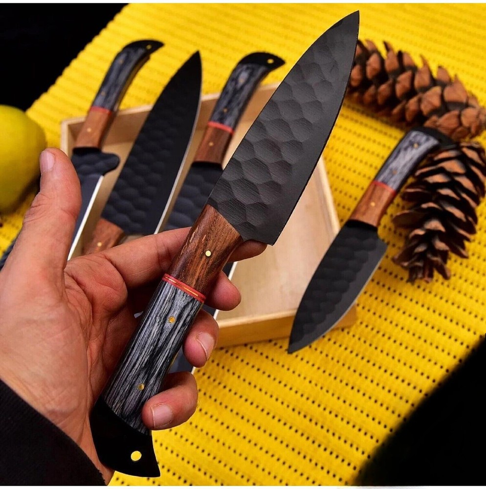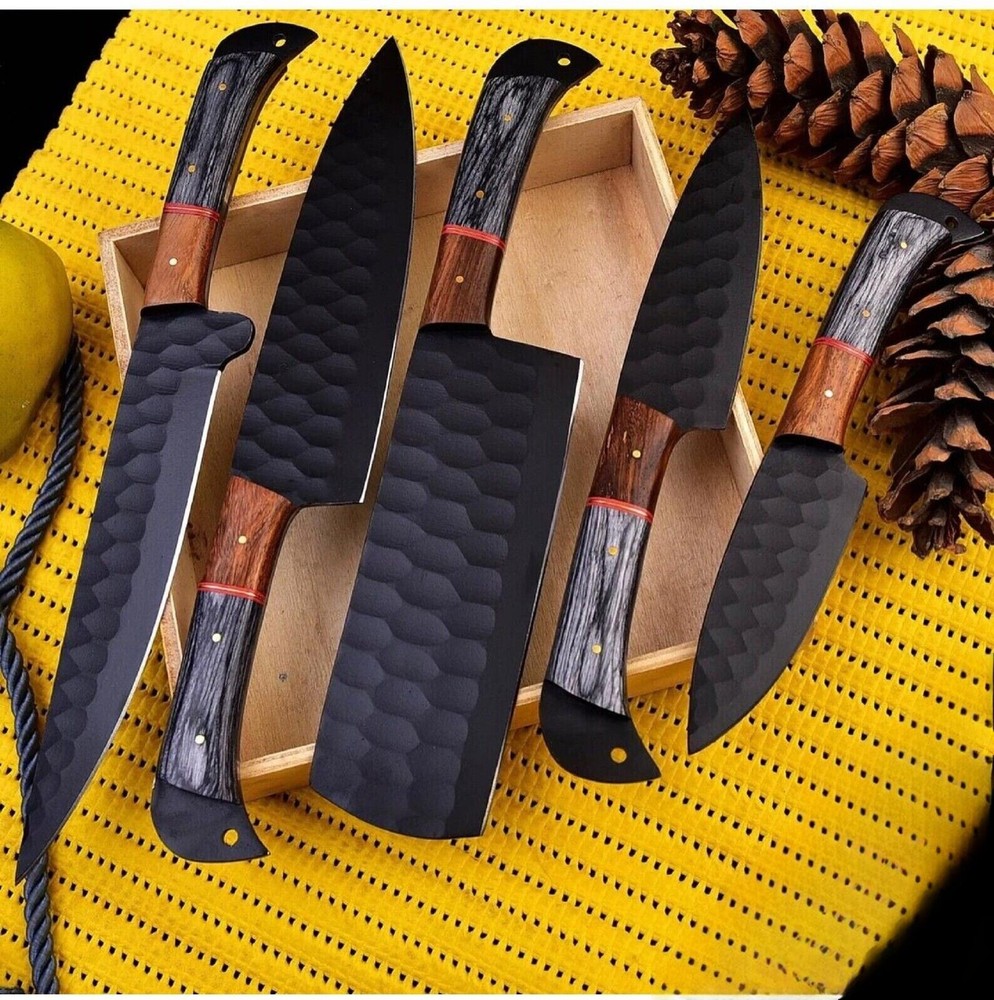 Professional 5 Piece Damascus Chef's Set Perfect for Kitchen Perfect for Gifting Are You Looking For A Chef Knife Set That Can Keep Up With Your Cooking Skills? Look No Further Than The Damascus Steel Professional Chef Knives. Our Chef Knives Set Made From The Highest Quality Materials And Designed For Precision And Durability. Our Knife Set Is A Must-Have For Any Professional Or Home Cook. Also To Their High-Quality Blades, Our Best Chef Knives Also Feature Comfortable And Ergonomic Handles. The Handles Are Designed To Fit Comfortably In Your Hand, Providing A Secure And Stable Grip As You Work. This Means You Can Chop, Slice, And Dice With Precision And Ease, Reducing The Risk Of Accidents In The Kitchen. BEST KITCHEN CHEF KNIVES Innovative, Traditional, Precise Ergonomic Handle, With Classic Look Easy To Clean, Very Hygienic Custom Handmade Stainless steel blades User-friendliness Authentic Craftsmanship Best Gift For Your Love Once & Friends PRODUCT SPECIFICATION Handmade Leather Sheath Included High Quality Materials for Durability Fully Handmade Item, No Pre-Bought Parts RESTRICTION You Must Be Over 18 Years Of Age To Purchase These Products, The Buyer is Fully Responsible For Local Laws And Regulations Concerning the Purchase And Possession Of Knives, Swords, And Other Cutlery Tools, By Making A Purchase You Are Confirming Our Age Policy. HAVE A SAFE SHOPPING PLEASE LEAVE A HONEST REVIEW