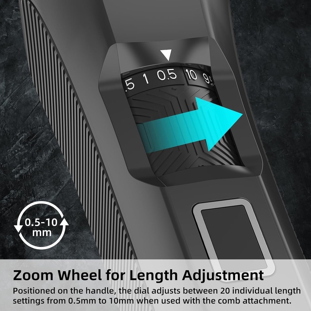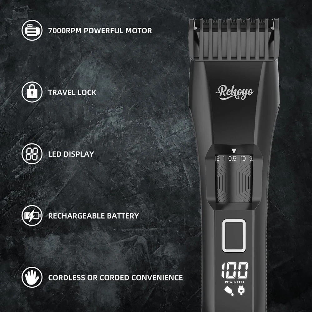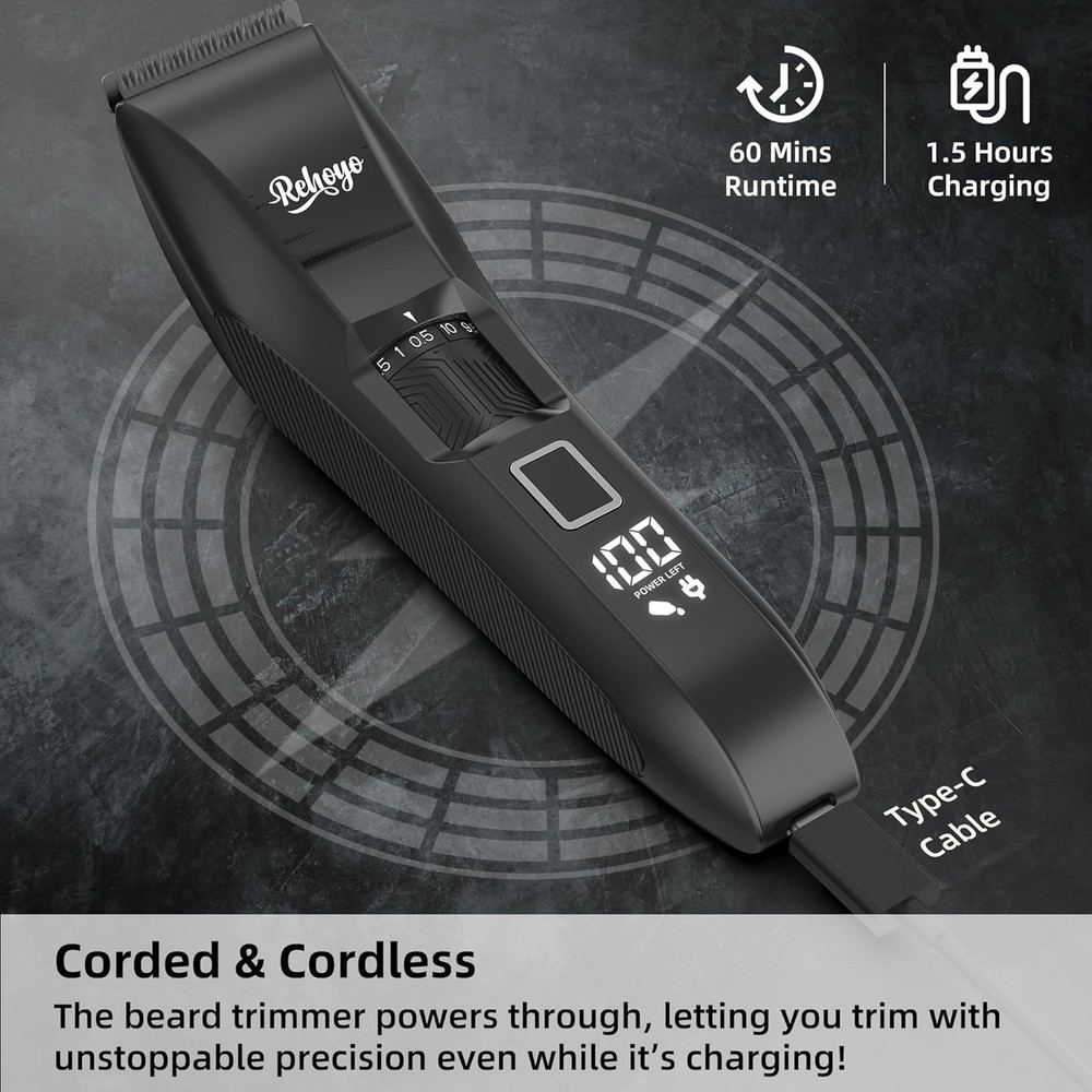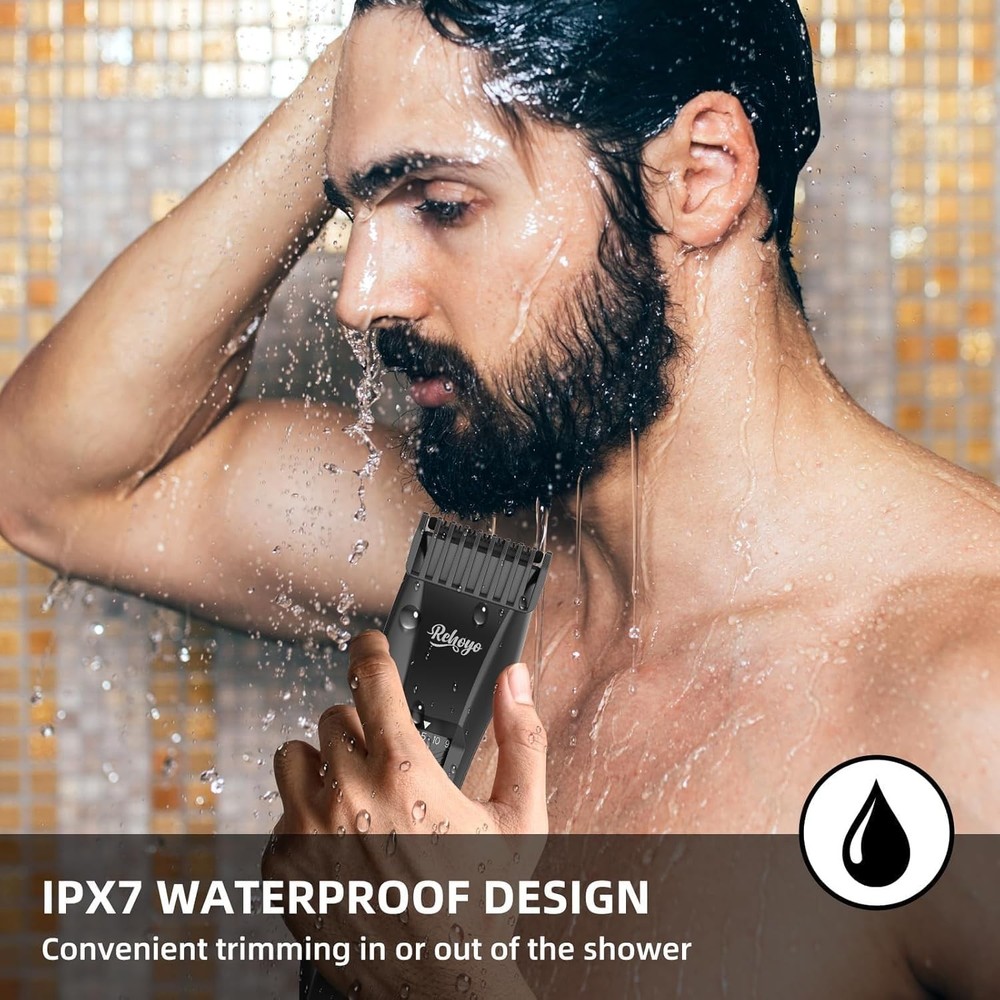 Precision Beard Styling with 20 Adjustable Lengths: The REHOYO BeardFix beard trimmer offers 20 adjustable length settings, ranging from 0.5mm to 10mm, giving you full control over your grooming routine. With a simple twist of the dial, you switch effortlessly between different beard styles without needing to change attachments. From a close stubble to a long beard, facial hair trimmer is designed for versatility, catering to every man's unique grooming preferences. IPX7 Waterproof for Wet and Dry Use: Experience unparalleled convenience with the REHOYO waterproof mens beard trimmer for men, featuring an IPX7 waterproof design. Use it confidently in the shower or easily clean it under running water for a quick, hygienic experience. Whether you prefer a quick dry trim or a thorough wet shave, the REHOYO electric beard trimmer for men adapts seamlessly to your lifestyle. High-Precision Trimmer Blade: The REHOYO mustache trimmer for men comes equipped with a HIGH-PRECISION stainless steel blade, engineered to deliver smooth, precise cuts every time. Perfect for defining edges, shaping sideburns, and detailing facial hair, the rust-resistant blade stays sharp for longer, ensuring a smooth grooming experience. The mens beard trimmer is ideal for those who demand accuracy and professionalism in their grooming routine. LED Display & Travel Lock: Stay informed and in control with the advanced LED display that shows battery life and length settings at a glance. The professional beard trimmer for men has a built-in travel lock feature that prevents accidental activation, making it an excellent companion for travel. The rechargeable and cordless hair trimmer is designed for convenience, allowing you to maintain your grooming routine anywhere, anytime, without hassle. Type-C Charging & Powerful Motor: Featuring fast Type-C charging, the REHOYO beard shaver for face and body providing 60 minutes of uninterrupted use on a full charge. Its powerful 7000 RPM motor delivers a smooth and comfortable trimming experience, effectively handling all hair types, from fine to thick. The high-speed motor minimizes pulling and tugging, offering consistent and reliable performance for all your grooming needs. Perfect Gift for Men: Combining advanced functionality with a sleek design, the REHOYO BeardFix men's mustache trimmer makes the perfect gift for any occasion. Its versatility and durability make it a thoughtful present for birthdays, Christmas, or special milestones. Show someone you care with this professional grooming tool, a gift that will be appreciated and used regularly by any man who values style and convenience.