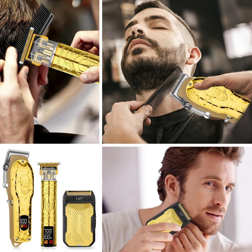 Professional Hair Clipper Set for Men Electric Shaver Razor Cordless Hair Cutting Barber Clippers Beard Trimmer Men’s Grooming Kit Gifts for him (Gold) Product Details Color: Gold Brand: LQT MPN: LQT-300 kit UPC: 797999867508 EAN: 0797999867508 Brand: LQT Battery Description: Lithium-Ion Included Components: Barber Cape, Guide Combs, Cleaning Brush, T-blade Trimmer, Hair Clipper, Barber's Comb, USB Cable See more Runtime: 2 hours Unit Count: 1 Count Package Dimensions : 11.93 x 7.87 x 3.43 inches; 2.55 Pounds Item model number : LQT-300 kit Batteries : 1 Lithium Ion batteries required. (included) Date First Available : November 8, 2024 Manufacturer : LQT Country of Origin : China PROFESSIONAL HAIR CLIPPERS SETThe LQT professional hair clipper set perfectly matched to create any hairstyle you want,metal embossed body design,unique scissors logo,this haircut kit not only can show your style taste,but also meet your daily haircut needs,perfect for home use,barbershop and travel. UPGRADE ACCESSORIES The LQT clippers for men equipped with 4 guide combs(,3,6,10,13,mm) ,The T-blade trimmer equipped with 4 guide combs (1.5,2,3,4,mm),a barber cape,3 cleaning brush, 3 USB charging cables,a barber's comb, Suitable for both professional in a salon or barbershop and home hair cuts as well as beard trimming. Powerful motor and large capacity batteryThe LQT hair clipper contains a high-capacity battery that can be used for 120 minutes after 2 hours of charging. The engraving machine can be used for 3 hours after 3 hours of charging. The shaving machine can be used for 160 minutes after 1.5 hours of charging, and can be connected to a USB adapter, laptop, and car charger using the USB charging port. SUPER SHARP & SKIN-FRIENDLY BLADEThe blades are made up of high quality stainless steel,men hair clippers allow you to easily design your hairstyle and shape the edges. Full metal body, Sharp and safe blade design,Even if you trim the thickest hair, it will not pull any hair. The R-shaped obtuse edge design makes gentle contact with the skin and will not harm your skin. Only the blades can be rinsed,easy to clean. Gifts for Men & Women This electric trimmer set can satisfy daily hair trimming and can also be used as an electric shaver for shaving and trimming body hair, etc.It is an all-in-one set and is very suitable as a gift for a partner who likes to trim hair at home. It can be given as a birthday gift, Christmas gift, Valentine's Day gift, Father's Day gift, Mother's Day gift.