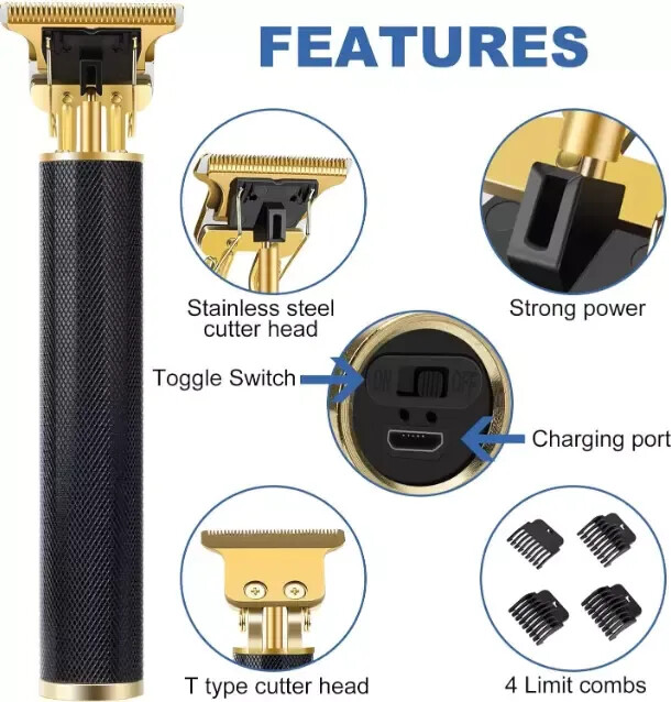 Cordless Professional Hair Clippers Trimmer Kit Men Cutting Machine Barber Salon US Warehouse - FREE & FAST Shipping in USA Product Description: 【T-Style Zero-Gap Cutter Head】 Adorned with a precision-crafted T-shaped stainless steel cutter head, 4cm wide, this clipper seamlessly blends artistry with function. Its razor-sharp blades glide through hair effortlessly, ensuring a smooth cut without any skin irritation. A protective cover shields the cutter head from wear, allowing for hassle-free cleaning under running water. 【Mighty Copper Core Motor】 Powered by a robust copper core motor, this beard trimmer operates smoothly, conquering even the toughest hair with ease. Its 8500 rpm speed, coupled with low-frequency vibrations and a whisper-quiet operation under 60 decibels, ensures a serene grooming experience. 【Precision Length Control】 Embrace versatility with 4 adjustable guide combs (1.5mm, 2mm, 3mm, 4mm), tailored to your every styling need. Achieve salon-worthy precision at home, effortlessly controlling hair length for a personalized look. 【USB-C Convenience, Long-Lasting Power】 Equipped with a 1200mAh high-capacity lithium battery, this hair clipper ensures 180 minutes of cordless freedom after just 3 hours of charging. Its USB-C port seamlessly connects to various devices, making it the perfect travel companion for families and globetrotters alike. Note: Optimal charging with a 5V/1A adapter is advised. 【Elegant Portability, Effortless Handling】 Boasting a sleek, lightweight design, this hair clipper slips seamlessly into your travel bag. Its ergonomic handle and one-button operation under the fader add to its user-friendliness, ensuring a safe and comfortable grooming session, whether at home or on the go. Cleaning is a breeze – simply rinse the blade under water, remembering not to submerge the entire clipper. Feedback: 1.Any question for your order, please contact us in time, we will reply to you within 24-48 hours and give you a satisfactory answer. 2.If you are satisfied with our products and services, hope to take up a little precious time to leave feedback reviews for our products.Thanks! 3.Your satisfaction is our effort. Welcome to order again! Have a great day! Our Policy: 100% Satisfaction Guarantee 30 Days Return and Refund Guarantee Free and Fast Shipping in USA, US Warehouse 15% of restocking fee will be charged for return it
