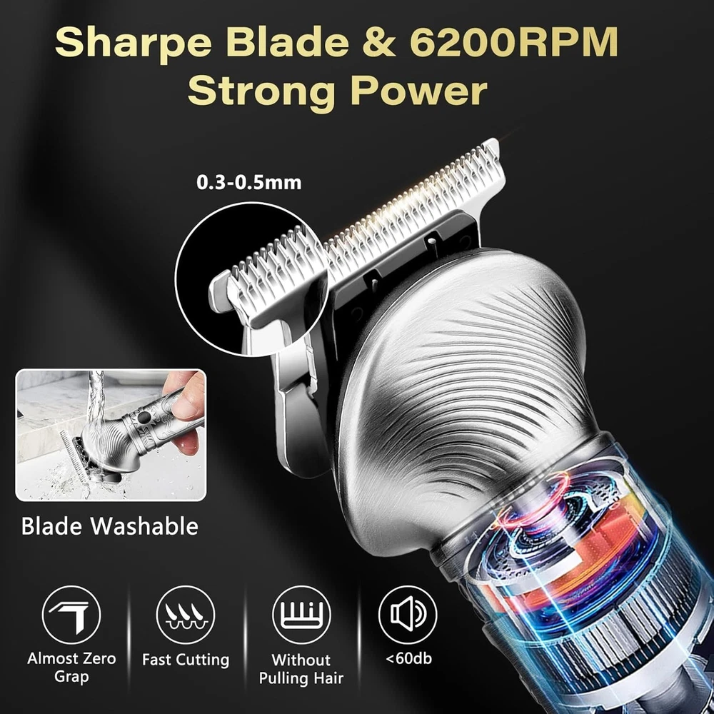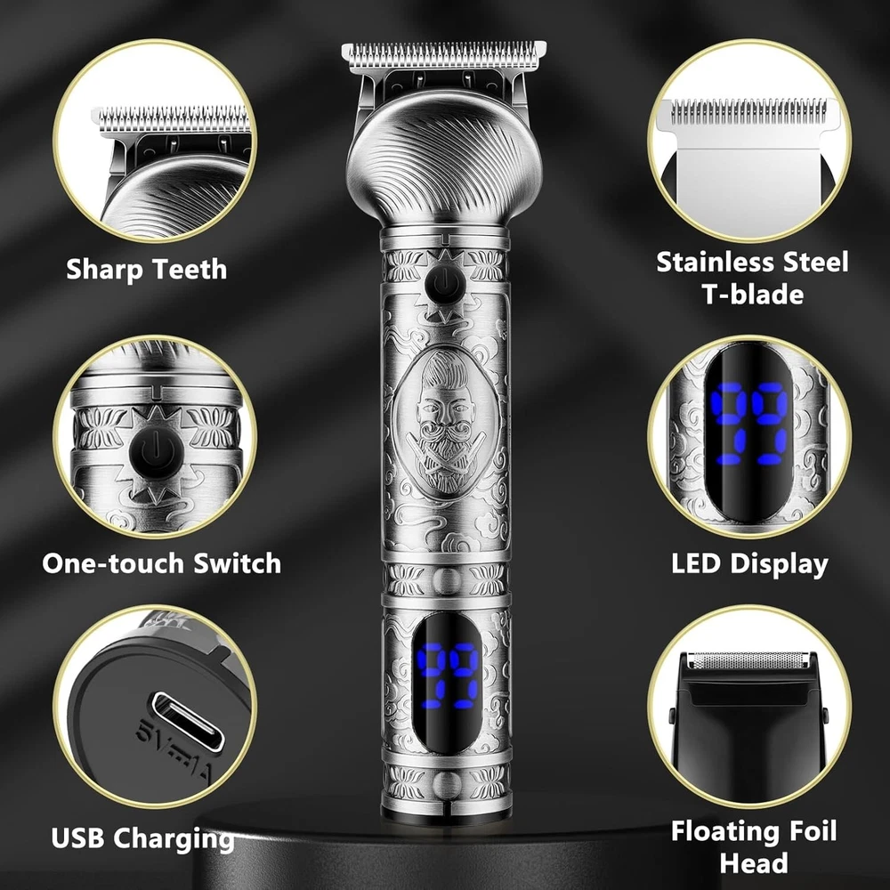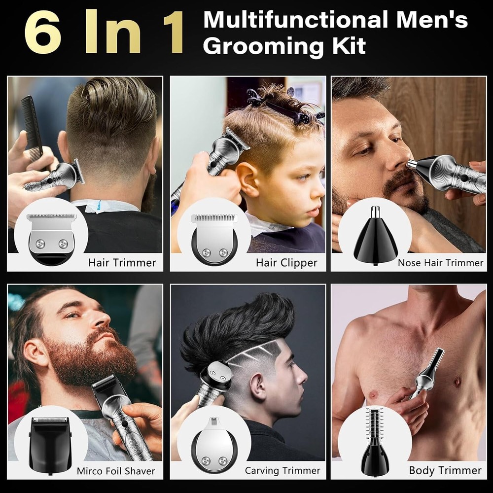 Beard Trimmer for Men, Hair Clipper Trimmer for Men, Cordless Beard Grooming Kit Description : [6 in 1 Beard Grooming Kit] -The beard trimmer grooming kit includes 6 detachable trimmer heads, a T-blade body nose hair face trimmer equipped with 4 guide combs (1.5/3/6/9mm), a hair cutting razor equipped with 4 guide combs (1.5/3/6/9mm), a design trimmer, a micro shaver, a nose trimmer, a body shaver. The The beard trimmer includes 18 accessories, meet the daily electric trimmer's needs. [ Zero Gapped & T-Blade] - The zero gapped t-blade clippers is made of high quality stainless steel with self-sharpening capability. Beard trimmer for men is sharp enough to cut through fine, coarse and thick hair/beard without pulling hair or hurting the scalp. The hair clippers blade (not the body) can be rinsed under running water and be included brush for thorough cleaning. [ Powerful Motor ]- Full metal body design, comfortable grip, 6 replacement heads are very easy to install. Equipped with a powerful 6200 RPM motor and self-sharpening blade. You can easily trim hidden hairs with the electric trimmer, even in narrow areas such as the abdomen, back and buttocks. The silent upgrade motor allows you to sleep at night and in the morning without disturbing your family. [ LED Display & USB Fast Charge] - Professional close hair and beard trimmer for men has a large built-in smart LED display that shows the battery level and reminds you to recharge for trimmer for men. Plus Type-C fast charging, hair clippers for men can be fully charged in just 2 hours and can shave for 180 minutes on a full charge. No more worry about the electricity of the beard trimmer. [Ergonomic Design ] - Electric razor for men use for body/beard/face/nose/ear hair trimmer easy to hold and use, you can hold the trimmer for a long time, but hand and arm won't feel sore. Weighing less than 200g, hair clippers is easy to use even for women, beginners. Retro body design, atmospheric and aesthetic, sure your husband/dad/boyfriend will love this.