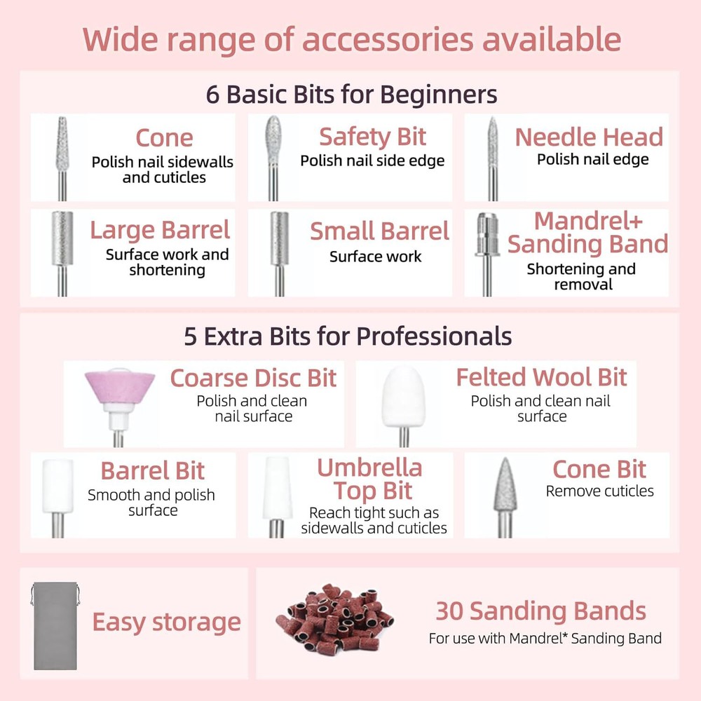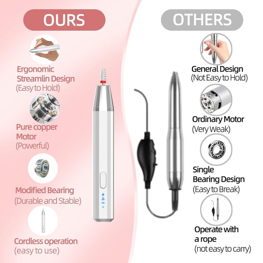 Cordless Nail Drill, Professional for Acrylic, Portable Nail Drill Machine Kit, Manicure Pedicure Polishing Shape Tools,Black Product Details Package Dimensions : 7.91 x 3.19 x 1.65 inches; 7.83 ounces Batteries : 1 Lithium Polymer batteries required. (included) Manufacturer : MJL US Brand: Midgaleuang Material: Acrylonitrile Butadiene Styrene (ABS) Power Source: Battery Powered Maximum Rotational Speed: 1.5E+4 RPM Manufacturer: MJL US Multifunctional for Mandicure and Pedicure: With adjustable speeds and forward/reverse direction options, Supplied with 11 nail drill and 30 grit packs. you can customize your various manicure and pedicure routine to your liking Cordless & Easy to Use: Say goodbye to messy cords and heavy equipment! , making it easy to use and carry with you wherever you go. Its pen-shaped design also makes it comfortable to hold and use, very friendly for beginners.Efficient heat dissipation, low noise and vibration, it is suitable for both individual home use and salon use. New Technology for More Comfort:This nail drill is built to last, with an upgraded motor and overload protection mechanism that extends its service life. Plus, its spring structure makes it quiet and low-vibration for a more pleasant experience Speed and Direction Control:With variable speed control of 0-15000 RPM, the nail drill is equipped with forward and reverse rotation directions which are suitable for any right-handed or left-handed use making it easier for the nail file to smooth your nails. Sincere Service.electric acrylic nail drill is for nail lovers and beauty lovers.If you want to give him as a gift, he won't disappoint!We offer up to two years of quality assurance service, if you have any questions please feel free to contact us, we will do our best to help you!