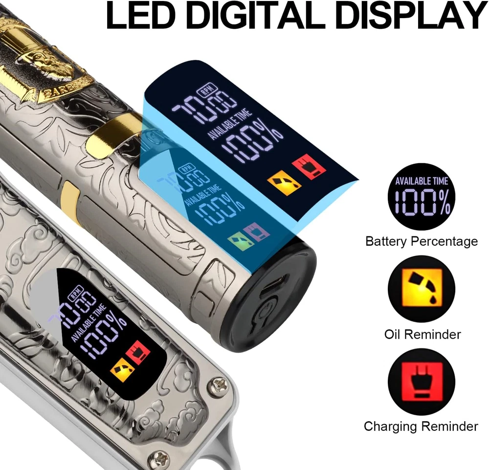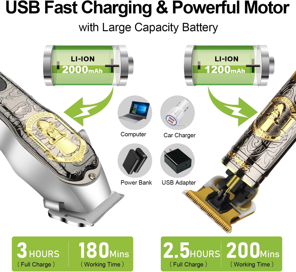 【Hair Clippers Kit for Barbers】: Our professional barber combo includes: A cordless hair clipper equipped with 8 guide combs (3/6/10/13/16/19/22/25 mm), a t liners clippers for men equipped with 6 guides (1/2/3/4/5/6 mm), lubricating oil, cleaning brush, 2 USB charging cable, and a barber's comb. 【Powerful Motor & Adjustable mens Hair Clippers】: This wireless hair clipper machine has a 10W powerful motor with a speed of 7000 RPM. The left adjustment level change adjusts 4 different cutting lengths(0.5-1.7 mm). 【Smart LED Display】: The LED displays can clearly display the remaining battery percentage, speed, fuel quantity reminder, and charging reminder. 【High Capacity Battery】The hair clippers are wireless for hair cutting built-in rechargeable 2000mAh high-quality lithium-ion battery, charged for 3 hours to provide up to 180 minutes of running time. The beard trimmer for men can run for at least 200 minutes after 2.5 hours fully charged. 【WARRANTY & AFTER-SALE SERVICE】We provide a year warranty on the barber clippers professional sets. If you have anything, please directly contact us and we will reply to you within 24 hours. Product Description Great Clipper Set! HINEA PRO-A Brand that Focusing on Producing Great Products. The video showcases the product in use. The video guides you through product setup. The video compares multiple products. The video shows the product being unpacked. 1 Leading Quality 2 Super Battery Life 3 Sharp Blades 4 Powerful Motor 5 Long Working Hours Barber Set Black HIENA PRO Barber Set Smart LED Display Super Battery Life Powerful Motor Adjustable Blades Smart LED Display Super Battery Life Powerful Motor Adjustable Blades Smart LED Display Super Battery Life Powerful Motor Adjustable Blades Smart LED Display Super Battery Life Powerful Motor Adjustable Blades Dragon Barber Set black Classic Black Gold Golden Pure Black Set HIENA PRO hair clipper set waterproof? No, this cordless clipper is not waterproof, please do not put this barber clippers professional sets into water, you can use a brush to clean it. Can the HINEA PRO wireless hair clippers kit be used while charging? Sure, Our Hair Clippers and T-Blade Trimmer Set can be used while wired and wireless. Are the blades of the HINEA PRO barber set universal and where can I buy them? If you need a replacement blade, you don't need to buy one, we'll send you a new one blade right away. Home & Barber Use Best Gift Choice Adijustable Length