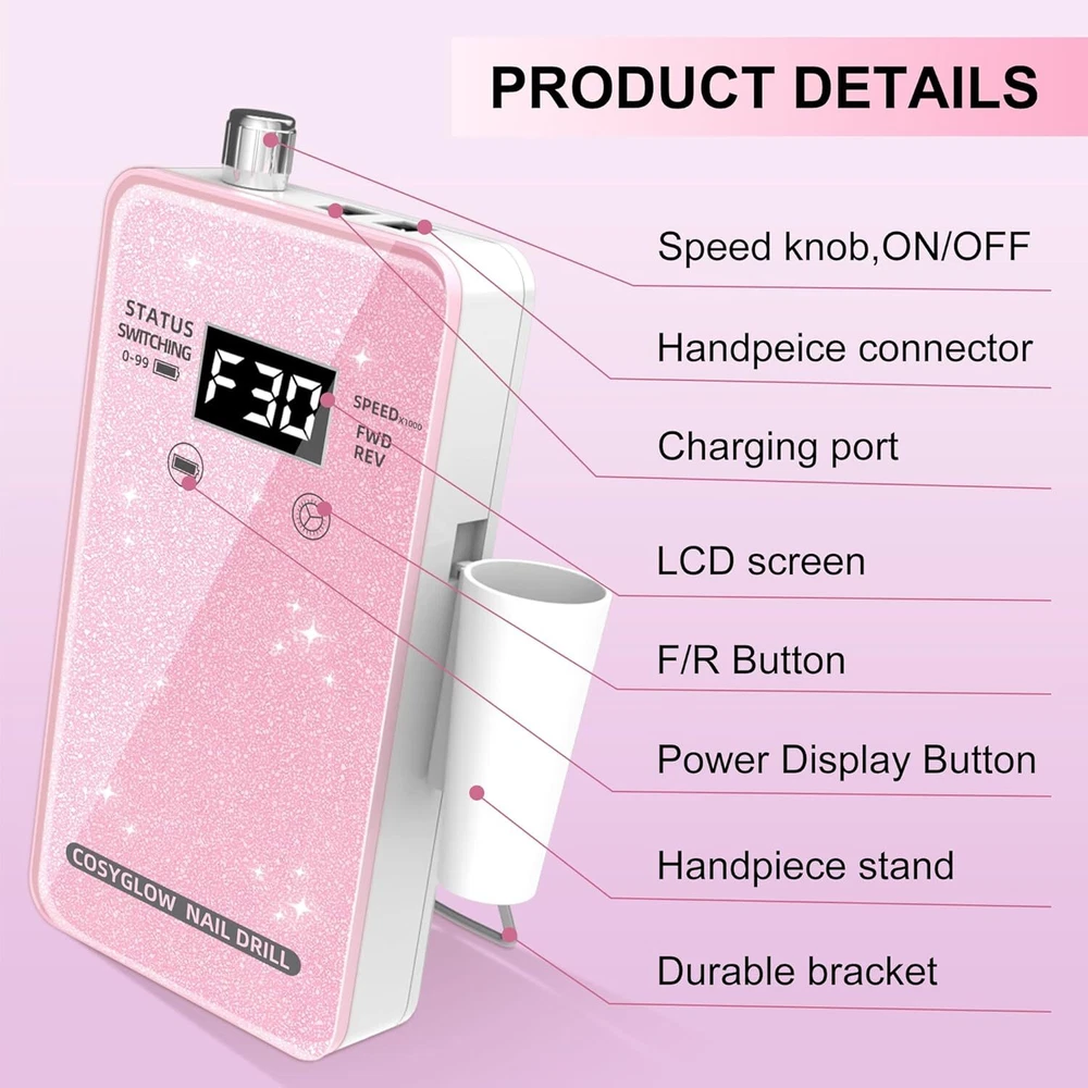 Professional Electric Nail Drill File:COSYGLOW Glitter Portable Cordless Pink Product Details Product Dimensions : 3.5 x 1.5 x 5.5 inches; 1.39 Pounds Item model number : R9 Plus Batteries : 1 Lithium Ion batteries required. (included) Manufacturer : COSYGLOW Country of Origin : China Brand: COSYGLOW Material: Metal, Acrylonitrile Butadiene Styrene (ABS) Model Name: R9 Plus Product Dimensions: 3.5"L x 1.5"W x 5.5"H Item Weight: 0.63 Kilograms Glitter Design Portable Nail Drill: This nail drill made of sturdy and durable reinforced glass and ABS material. It has a beautiful appearance and unique design. The specially designed glittery accents not only enhance the aesthetic appeal of the nail drill but also add an eye-catching sparkle. Adjustable Speed up to 30,000 RPM: Equipped with high-quality bearings, this professional nail drill allows you to smoothly operate at speeds ranging from 0 to 30,000 RPM by simply rotating the speed control knob. This makes it an ideal nail drill machine for both experienced salon technicians and beginners starting their nail care journey at home or in the salon. Low Heat & Low Noise & Low Vibration: Our electric nail drill is durable, low heat, low noise and low vibration. The aluminum alloy shell and the ventilation holes prevent the handpiece from overheating; lightweight and ergonomic design makes it comfortable to use. The handpiece fits 3/32-inch drill bits. The twist locking chuck for easy drills replacement. Large battery capacity and Rechargeable: With a large 3600mAh battery capacity, this electric nail file can be used anytime, anywhere. The included adapter allows you to conveniently recharge the cordless nail drill, which can provide 8-10 hours of runtime after a 2-3 hour full charge. Multifunctional Nail Kit: With 11 kinds of professional nail drill bits and 36pcs sanding bands, This nail drill can meets all your multiple manicures needs for trimming, grinding, carving, cutting, polishing for all nail arts as well as cuticle removal. This beautiful nail drill kit makes an excellent gift option, whether for personal use or for friends and family.