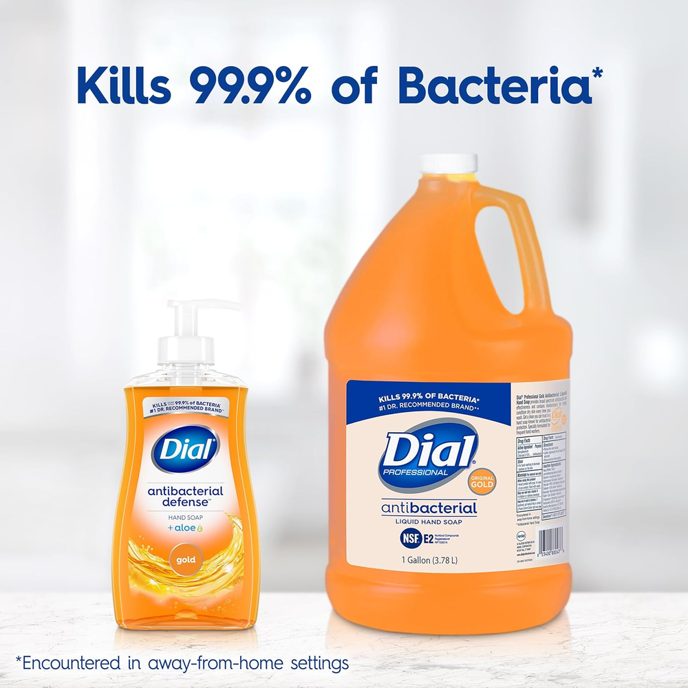 #1 Doctor Recommended Antibacterial Hand Soap Brand Kills 99.9% of bacteria encountered in away-from-home settings. Broad Spectrum Antibacterial Effectiveness Dermatologist-Tested Gently cleanses skin without drying NSF: Nonfood Compounds Program Listed E2 Registration No. 155014 Dial® Gold Antibacterial Liquid Hand Soap kills 99.9% of bacteria encountered in away-from-home settings. Provides broad spectrum antibacterial effectiveness and contains moisturizers to help condition dry skin every time you wash. Can be used in any commercial or professional setting.