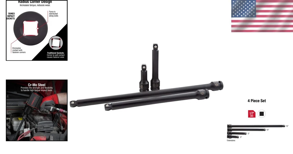 Professional Grade Wobble Drive Extensions - 4 Piece SAE Set with Storage Case ‹ › ‹ › ‹ › ‹ › ‹ › ‹ › ‹ › Professional Grade Wobble Drive Extensions - 4 Piece SAE Set Elevate your automotive repair experience with this premium 4-piece SAE set of wobble drive extensions, meticulously crafted for strength and durability. Perfect for professionals and enthusiasts alike, this set is the ultimate companion for any high-torque impact tool. Key Features: CR-MO Steel: Crafted from high-grade chromium-molybdenum steel, these extensions provide unparalleled strength and flexibility to withstand high torque impact tasks. Radius Corner Design: Innovatively designed to reduce wear and enhance torque efficiency, this feature places force directly on the fastener walls, extending their lifespan. Wobble Drive: A unique 15-degree offset in all directions allows for greater maneuverability in tight spaces. Steel Ball Retainer: Securely designed on the male end to keep sockets in place, preventing accidental drops and ensuring safety during use. Dual Size Markings: Permanently marked with laser etching and roll stamping for easy and instantaneous identification of sizes. Storage Tray: A dedicated, heavy-duty blow molded storage case is included for convenient transport and organization. Meets ANSI Standards: Each extension has been rigorously tested to ensure peak performance and durability. Set Includes: 3” Extension 5” Extension 10” Extension 15” Extension Why Choose Our Wobble Drive Extensions? This 4-piece set emphasizes quality, versatility, and longevity, making it an essential addition to any mechanic's toolkit. Whether you’re tackling routine maintenance or complex automotive repairs, these extensions offer the reliability you need to get the job done with confidence. Invest in tools that work as hard as you do. Order your Professional Grade Wobble Drive Extensions 4 Piece Set today and experience the peak of performance and convenience! Shipping Free & Fast Shipping - We offer free shipping to most of the USA with a normal delivery time of 3-7 days. However, due to the current situation, additional delivery time (up to 3 weeks) may be required for some items. Alternative Carriers - We may use alternative carriers (e.g. USPS, FedEx, UPS, etc.) to ensure your package arrives safely and on time. Due to the use of multiple carriers, we are unable to provide a tracking number automatically. Handling Time - Orders are processed and shipped within 1-2 business days of receiving cleared payment. Shipping Restrictions - Shipping to Alaska, Hawaii, Puerto Rico, Guam, and other US territories may incur shipping charges or delivery restrictions. Please contact us before ordering, or your order can be refunded/cancelled. State Restrictions - There may be restrictions based on your state of purchase. For example, certain items may not be shipped to California due to state regulations. Contact for Tracking Updates - If you require tracking updates or have any concerns about the delivery of your order, please feel free to contact us, and we will be happy to assist you. Return Please see our eBay Return Policy. Thank you. Payment We accept all major credit cards, PayPal, and Apple Pay for your convenience. Your payment information is secure and encrypted to ensure a safe and seamless transaction. Please complete your payment within 3 days of purchase to avoid any delays in shipping. Feedback Your feedback is extremely important to us. We strive to provide the best products and customer service possible. If you are satisfied with your purchase, please take a moment to leave us a positive review. If you have any concerns or issues with your order, please contact us before leaving negative feedback. We are committed to resolving any problems and ensuring your satisfaction. Contact Us If you have any questions or concerns, please feel free to reach out to our customer support team. You can contact us through the eBay messaging system. We are available Monday to Friday, 9:00 am to 5:00 pm EST, and we will do our best to respond to your inquiry within 24 hours. Thank you for supporting our small family business! Manufacturer Part Number: Impact Extension Set UPC: Not Set Unit Quantity: 4 Tools Included: Extension,Wobble extensions,Blow molded case System of Measurement: SAE Size: 3,5,10,15 Brand: Unbranded Socket Type: Impact Drive Type: Specialty Drive Size: 1/2in. Surface Finish: Steel Warranty: No Warranty Number of Pieces: 4 Country/Region of Manufacture: Not Set Unit Type: oz Set or Single Item: Not Set