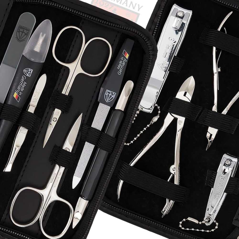 Exclusive 11-Piece MANICURE - PEDICURE - GROOMING ? NAIL CARE set - ?Made in Solingen/Germany? by THREE SWORDS Contents: Cuticle scissors, nail scissors, nail clipper, toe nail clipper, cuticle remover, tweezers, glass nail file (double sided), sapphire nail file, nail nipper, cuticle nipper, double instrument Case: Genuine leather black Size ca. 18,0 x 11,0 x 2,0 cm Delivered in an attractive THREE SWORDS gift box Gift idea Our manicure sets are unique gifts for him and her - suitable for home or travel use Customer Satisfaction Guarantee: Fast and uncomplicated customer service - in case of any questions or problems - please contact us directly . We will always find a solution in the interest of our customers! Product Review: Was a recent product review of another customer helpful for you? Only after having made a product review you are sharing your experience with our product and service with other customers so that we can improve our range constantly. THREE SWORDS - Flexible and innovative manufacturer of manicure and pedicure products. The product range covers everything you need for a perfect nail care and is well known for its high quality of manufacturing and their first class "value for money". "THREE SWORDS - Drei Schwerter" is a traditional "Solingen" company and was founded in 1927 in Germany. NAIL CARE KIT from with professional manicure and pedicure tools. Our sets for home and travel use convince trough highest levels of quality, modern design, durability and German engineering combined with a first class customer service. Cuticle scissors, nail scissors, nail clipper, toe nail clipper, cuticle remover, tweezers, nail cleaner, sapphire nail file (fine and coarse coating), nail nipper, cuticle nipper, glass nail file (double sided). STEEL IMPLEMENTS: Hand made, bright nickel plated (protection against corrosion), polished and hardened. All sets come in an attractive gift box. Instruments are made in Solingen / Germany (except nail clipper). CASE: Genuine leather black, size ca. 18,0 x 11,0 x 2,0 cm. Our organizers are made of high-grade fashion or classic materials. Additional equipment: Microfiber cleaning cloth for cleaning steel items, general info sheet “Finger - Nail Grooming”. SATISFACTION GUARANTEE: Please CONTACT US DIRECTLY, we ALWAYS find a solution! A 3 Swords beauty set is a perfect present for women, woman, girls and men and ideal for XMAS, birthday, mothers / fathers day, marriage, thanksgiving and valentines day!