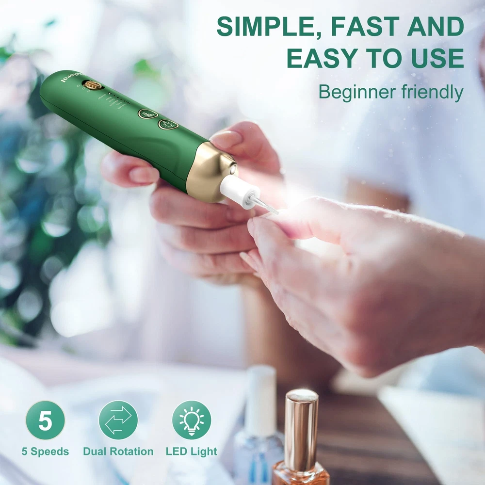 Professional Manicure and Pedicure Set: Designed for hand and foot care experience at home, the salon-quality electric nail file for women is suitable for trimming, grinding and polishing natural nails and thick nails. It also effectively removes cuticles, calluses, dead skin, corns, and hard skin, giving you healthy and neat nails, as well as comfortable hand and foot care Rechargeable and Wireless: The electric nail file is equipped with a 2000 mAh rechargeable battery that can maintain continuous cordless operation for more than 3 hours on a full charge. Let you enjoy hand and foot care wherever you want without the hassle of cables Powerful and Practical: With an upgraded motor for more power, effective heat dissipation and low vibration, the electric nail grinder delivers a more comfortable and effective experience. it's not only a manicure kit for women but also a practical pedicure tool for feet and a toe nail grinder kit for thick nails 5 Speeds & Dual Rotations: This electric nail filer comes with 5 speed modes (2700 to 4200 rpm) and is designed with forward and reverse rotation directions. Easy to use, even beginners can effortlessly and confidently perform nail care at home 8 IN 1 Electric Nail Drill Kit: The electric nail file set will come with: Electric nail filer, 8 high quality drill bits, dust shield, integrated LED light for precise nail file and Type-C charging cable, and user manual. It also boasts a beautiful appearance, making it a perfect choice for Christmas and birthday gifts for women