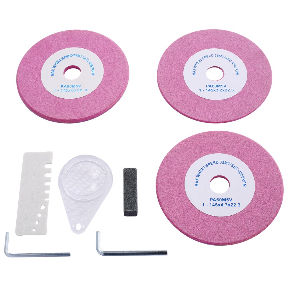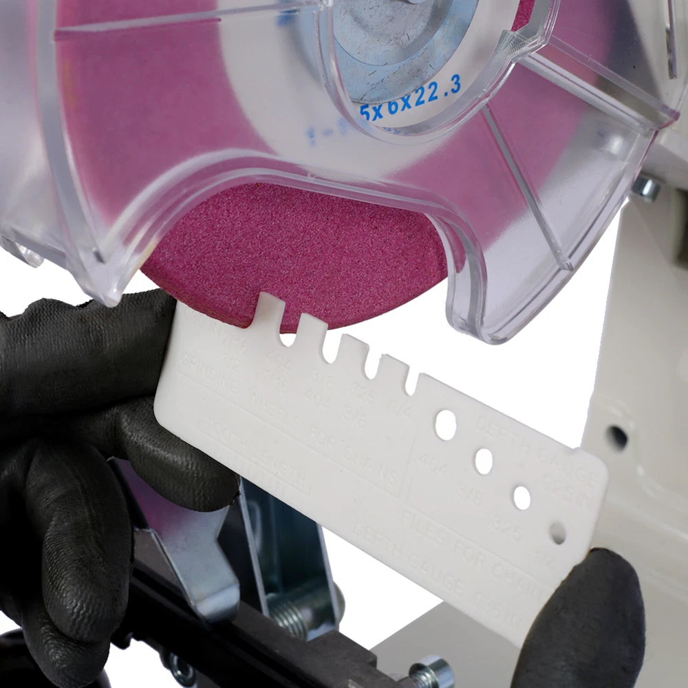 Specification Product Information Product Type: General Item Product Name: Chainsaw Sharpener Professional Multi-Angle Adjustable Chain Grinder 120-Volt Bench Grinder Universal Saw Chain Sharpener, for All Chainsaw Chains gray color Main Color: Gray Main Material: Steel Product Dimensions Assembled Length (in.): 12.60 Assembled Width (in.): 9.80 Assembled Height (in.): 17.70 Weight (lbs.): 13.40 Package Size Length (in.): 14.60 Width (in.): 11.00 Height (in.): 10.20 Weight (lbs.): 16.30 Description Perfect for professionals: This grinder is designed for frequent, high volume chain sharpening, making it an excellent choice for professional users. Save time and money: With this versatile grinder, you can sharpen your own chainsaw chains right in your workshop or garage, saving you time and money. Universal sharpener: Sharpen almost any saw chain, including those from manufacturers like Oregon, Stihl, Husqvarna, and more, with the ability to sharpen up to .404" pitch chains. Accurate sharpening: The Grinder features multiple adjustment points for precision sharpening, and a built-in light that provides better visibility while you work. Complete kit: Included in the box are the Grinder, a dressing brick and profile guide, operator instructions, plus two grinding wheels (3.2mm & 4.7mm) and a 6.0mm flat profile disc for depth gauge maintenance.