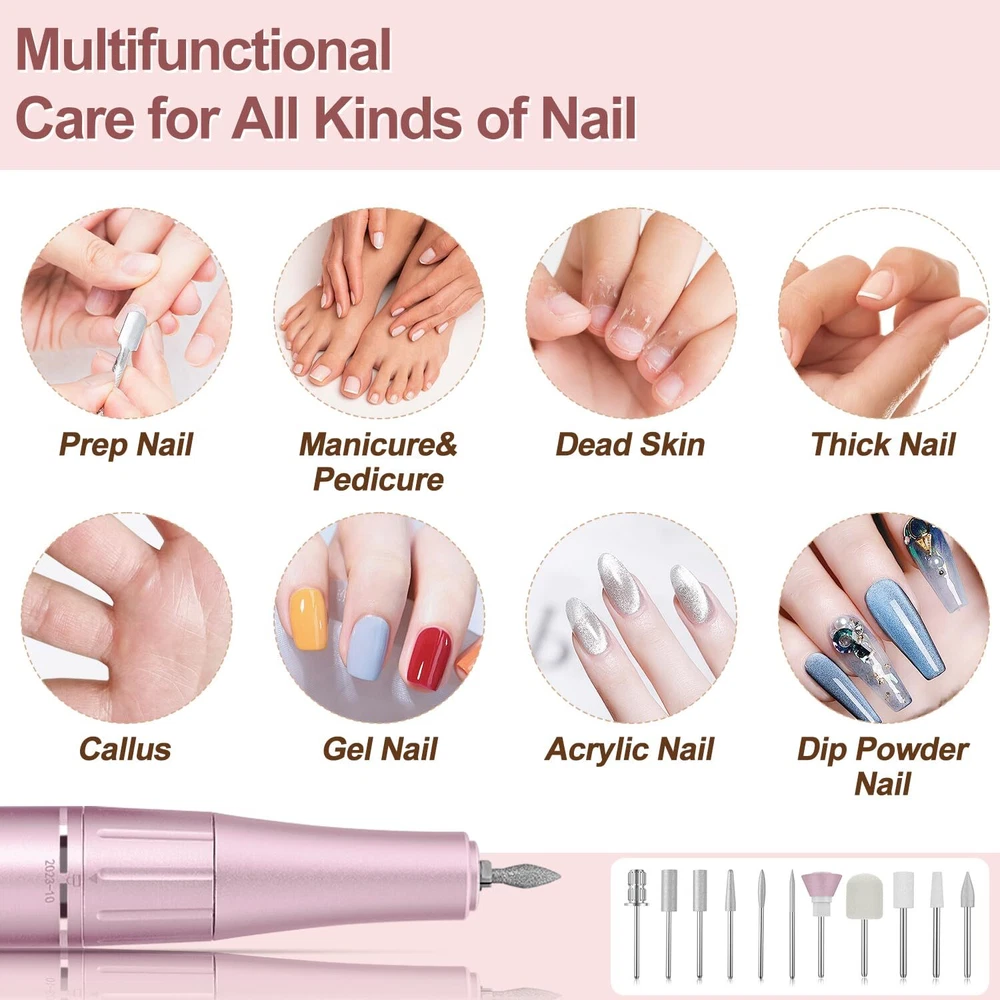 Electric Nail Drill Professional, 35000RPM Portable Efile Pink Product Details Enjoy Salon-Worthy Nails at Home: Meremit professional nail drill kit equipped with an updated quality bearing coreless motor,which plus up to 35,000 speeds can help you quickly remove all kinds of manicures, such as gel nails, acrylic nails, dip powder nails, nail tips and other long nails.Allowing you to achieve stunning manicures and pedicures effortlessly at home Built to Last Acrylic Nail Drill: With its built-in 3000mAh rechargeable battery, being charged for about 2-3 hours,the efile nail drill will last up to 8-10 hours. Also comes with an upgraded type-c interface cable, which can be connected to any type-c socket, such as power bank, laptop, AC adapter, etc Large LCD Display & Use Friendly: Our e file machine is very easy to use, one-press button support to adjust the speed and change forward or reverse direction with power display showing on the LCD screen, one-press operation design gives you a simple and convenient use experience, both professionals and beginners could master this nail drill machine easily Secure & Portable Nail Efile: The Quality aluminum alloy handpiece is made up of powerful yet quiet torque with smart heat dissipation and low vibration, makes it works more safe, smoother and more quietly even at a high speed(0-35000 RPM). Small size and light weight drill pen design, it will not let your hand be numb even after long-term use Professional ALL-IN-ONE Nail Dremel Kit: Meremit portable nail dremel kit equipped with 11 interchangeable nail drill bits and 6 sanding bands for different usage, which meets all your nail beauty needs.It is an ideal e-nail tool set for both professional technicians in salons and newbies who start their journey to nail beauty at home. Perfect nail drill for women who loves nail art