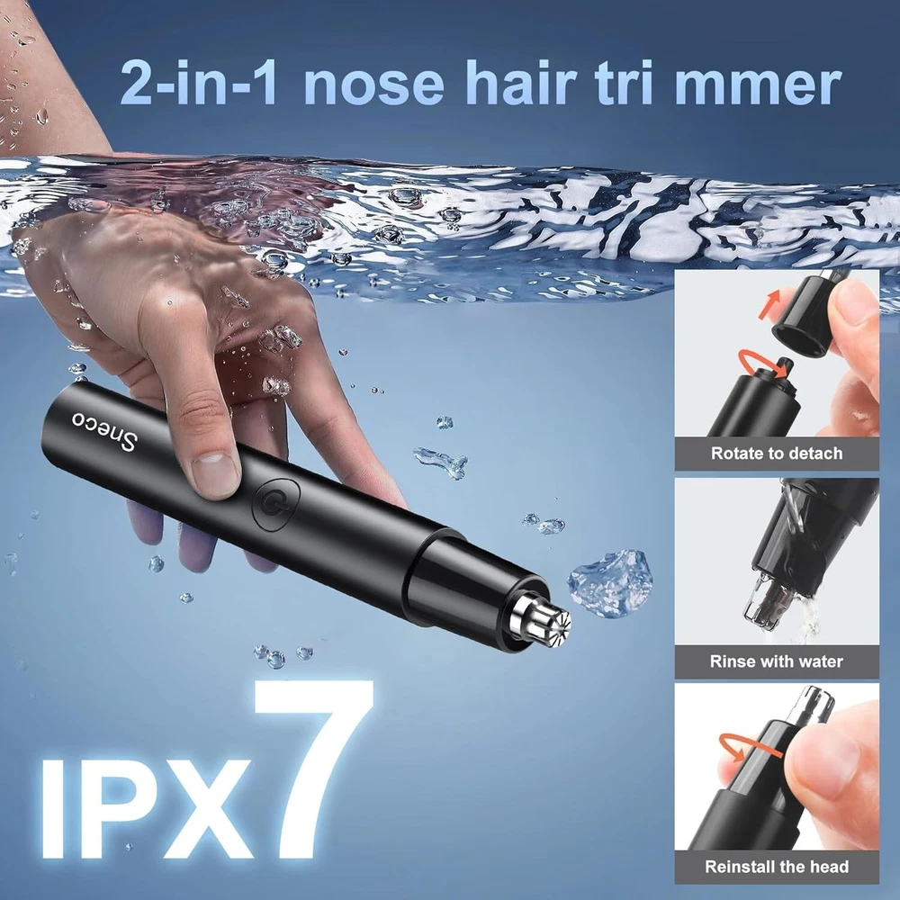 Rechargeable Ear & Nose Hair Trimmer - Professional Painless Facial & Eyebrow Trimmer for Men & Women (Black) 【Powerful Motor & Painless Hair Removal】 The nose hair trimmer boasts an impressive 8500 RPM high-speed motor, ensuring efficient and effortless hair removal. Its metal drive shaft conveys robust power to the cutting head, enabling the double-edged blades to smoothly and continuously trim nose hair. Enjoy a pain-free grooming experience with this trimmer. 【Multi-Purpose Trimmer for Multiple Scenes】 Utilize high-strength stainless steel blades for accurate trimming. Remove the nose, ear, eyebrow, beard, and face excess hair comfortably and efficiently. Sensitive one-touch control and portable design allow you to trim unwanted hair during travels, showing your confidence in any situation. 【Rechargeable Battery】 Long Standby Time. Charge the nose hair trimmer using the included USB C charging cable. Charge on the go, connecting the cable to a USB port, power bank, computer, or USB car charger. One charge powers the nose hair trimmer for up to 6 months. 【IPX7 Waterproof & Easy Cleansing】It’s waterproof and washable, making it easy to deal with residual by soak cleaning or having it take a shower. Washable and removable trimmer head is convenient for cleaning and maintenance. User-friendly handy body design comes with a dust-proof cover to protect the trimmer head.